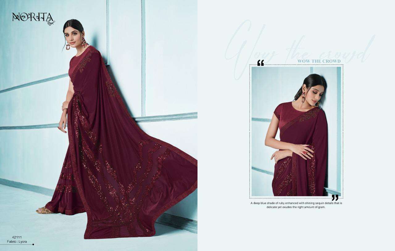 BRAND NAME : MAHOTSAV CATALOG : NORITA-42100 ELAURA SAREE FABRIC : LYCRA BLOUSE FABRIC : RAW SILK PRICE :- WORK : Embroidery, sequence and Stone DISPATCHING TIME: NEXT DAY |