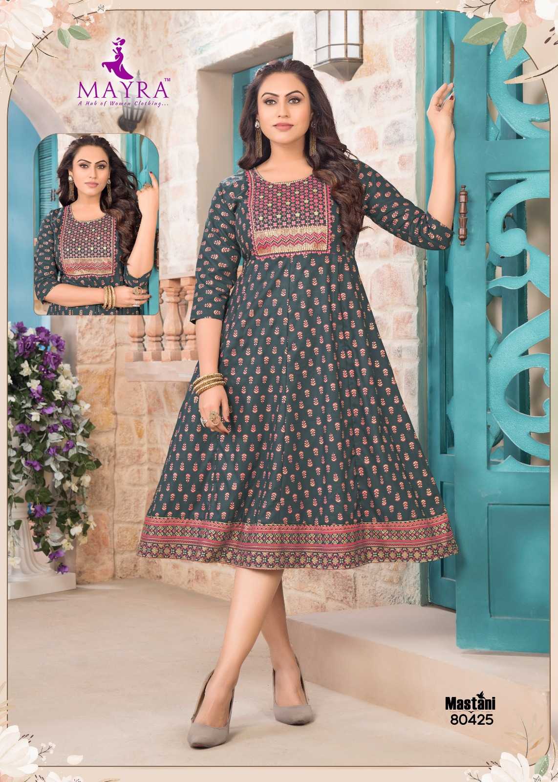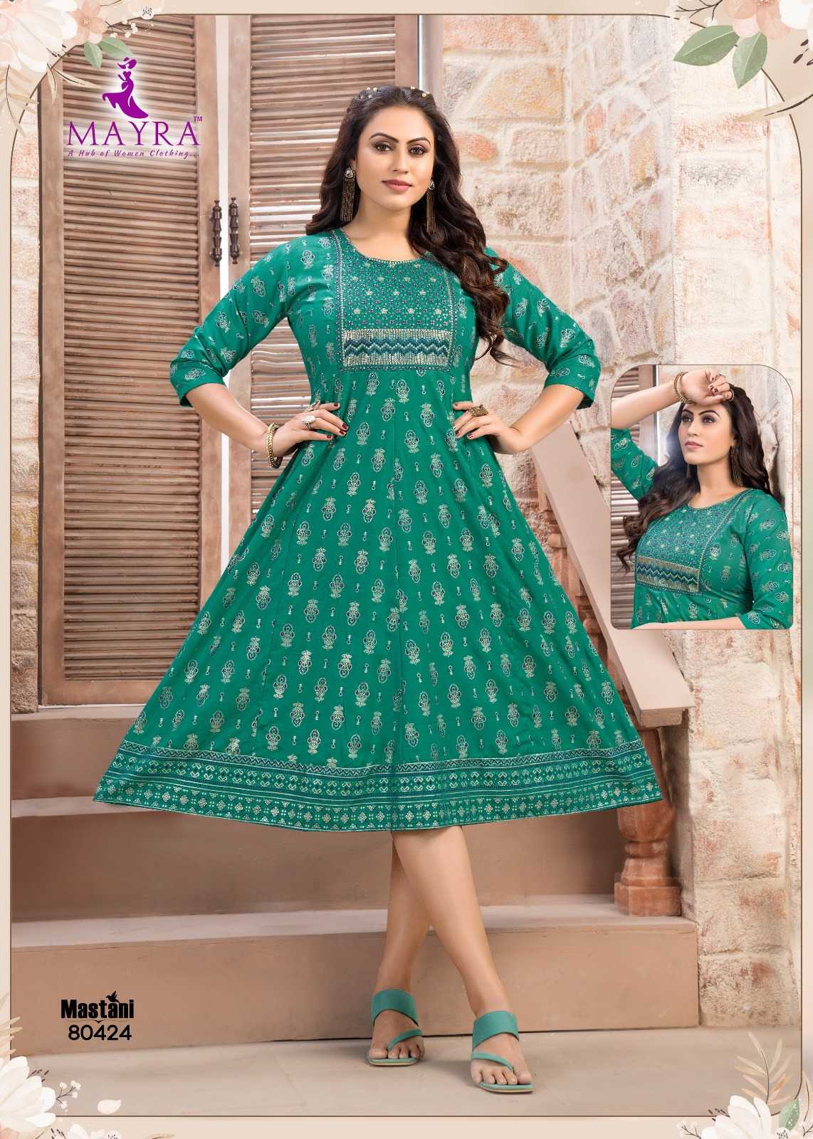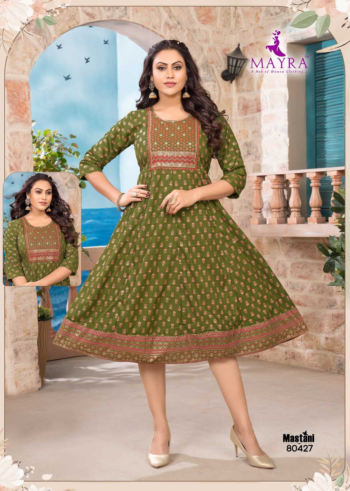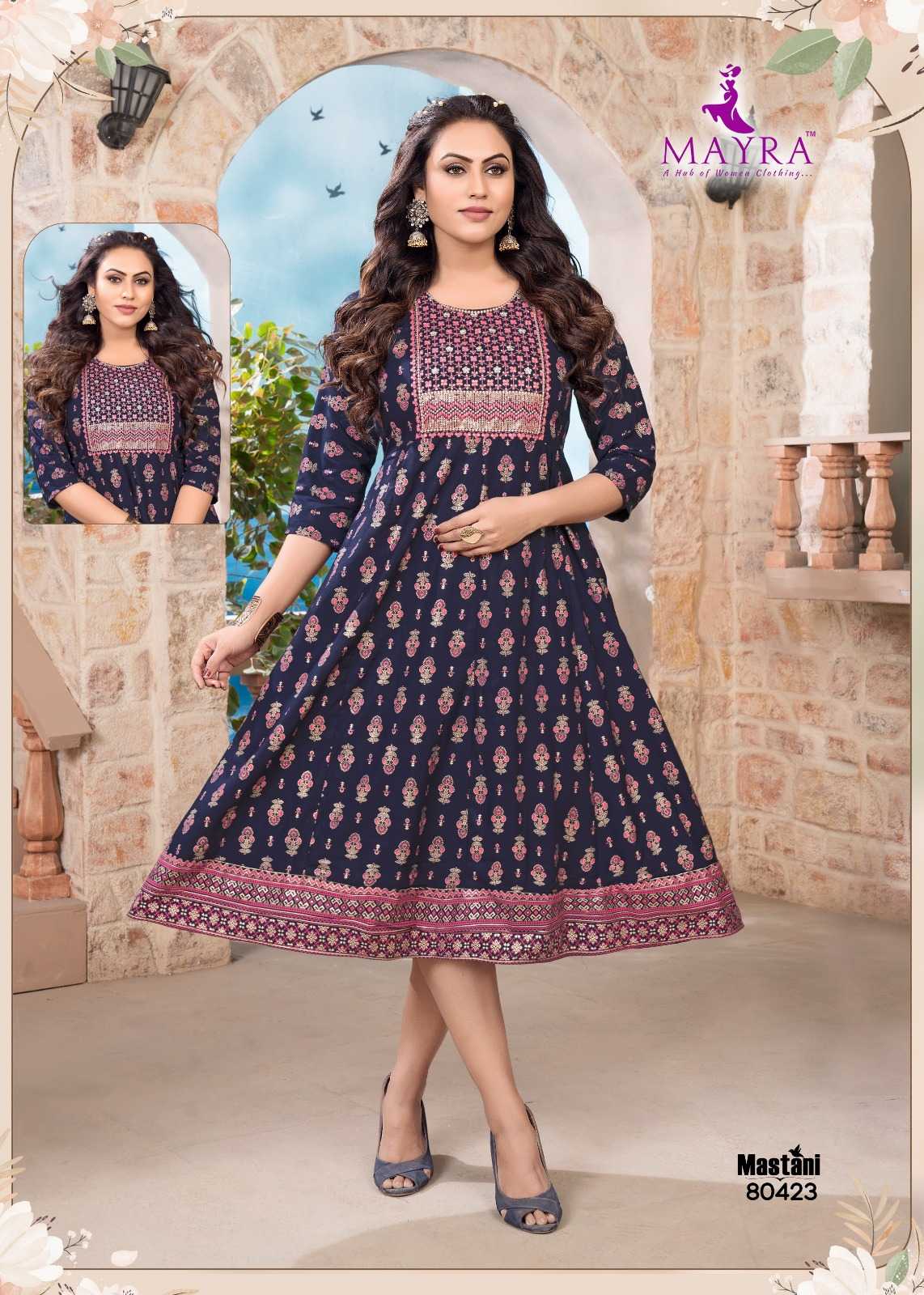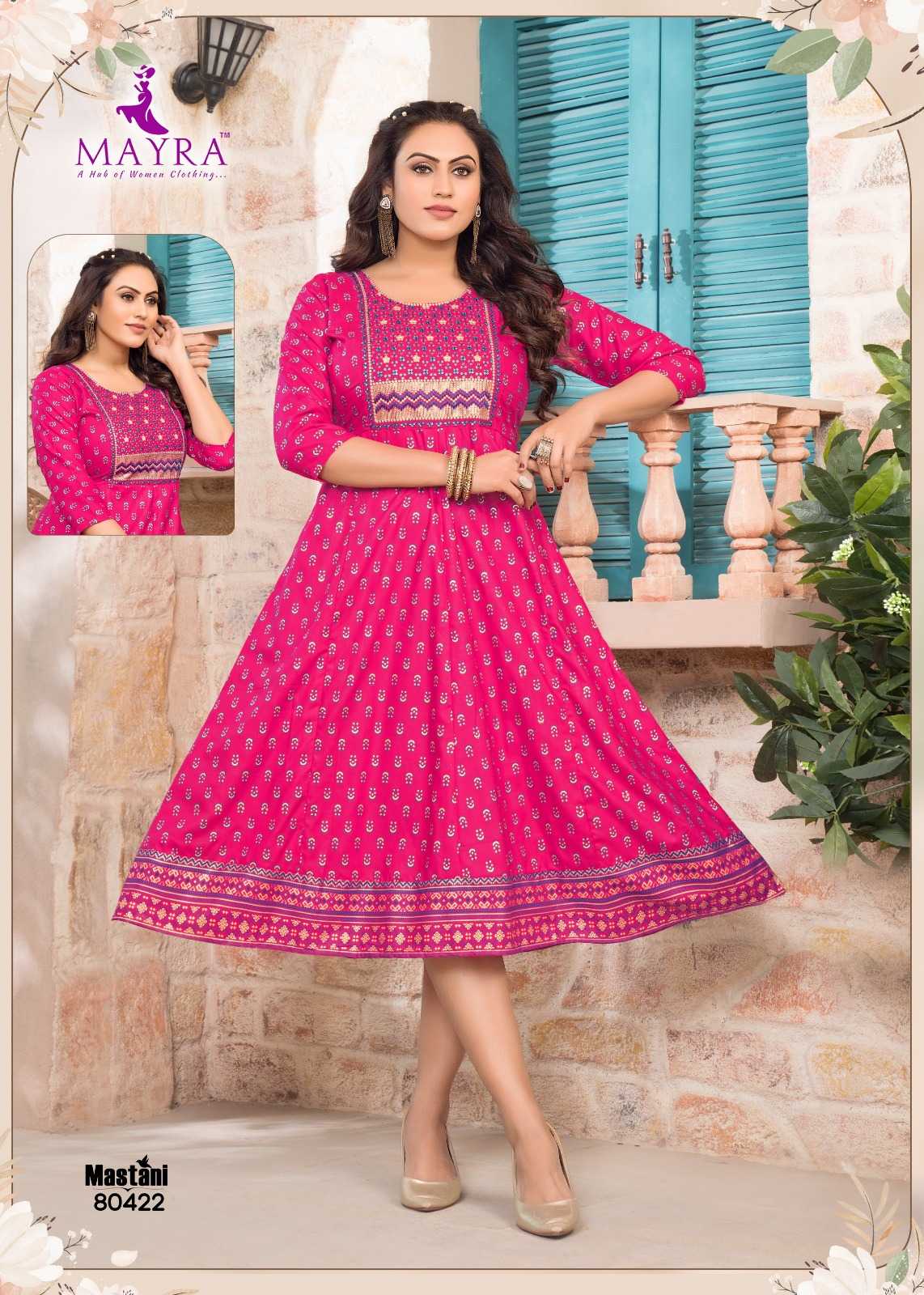 Dear Customers, Welcome to MAYRA (KURTI) .., We are introducing MAYRA 'S new catalog 📕Catalogue:- MASTANI 👗cloth :- *Pure Heavy Liva approved viscose fabric with Machine print with Umberalla kalli with Embroydery with fully interlock kurti * ✅concept :- * Heavy Liva approved Viscose fabrics with machine print with Umbrella kalli pattern Embroydery kurti * Length :- 45”MINIMUM Size:- M,L,XL,XXL,3xl- AVAILABLE 🚛 : Dispatch :- dispatch ready |