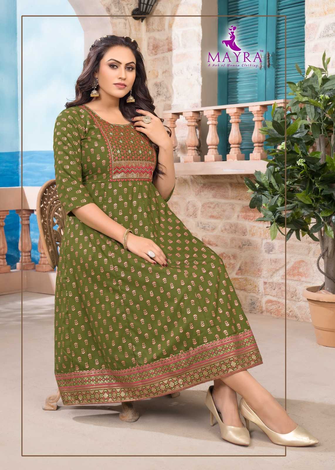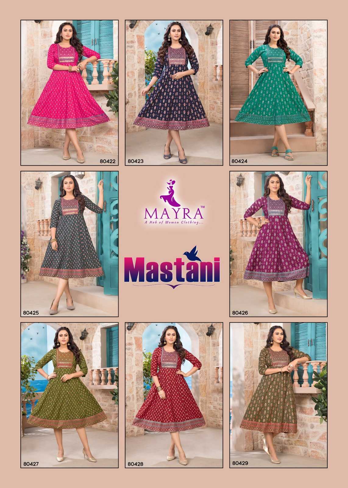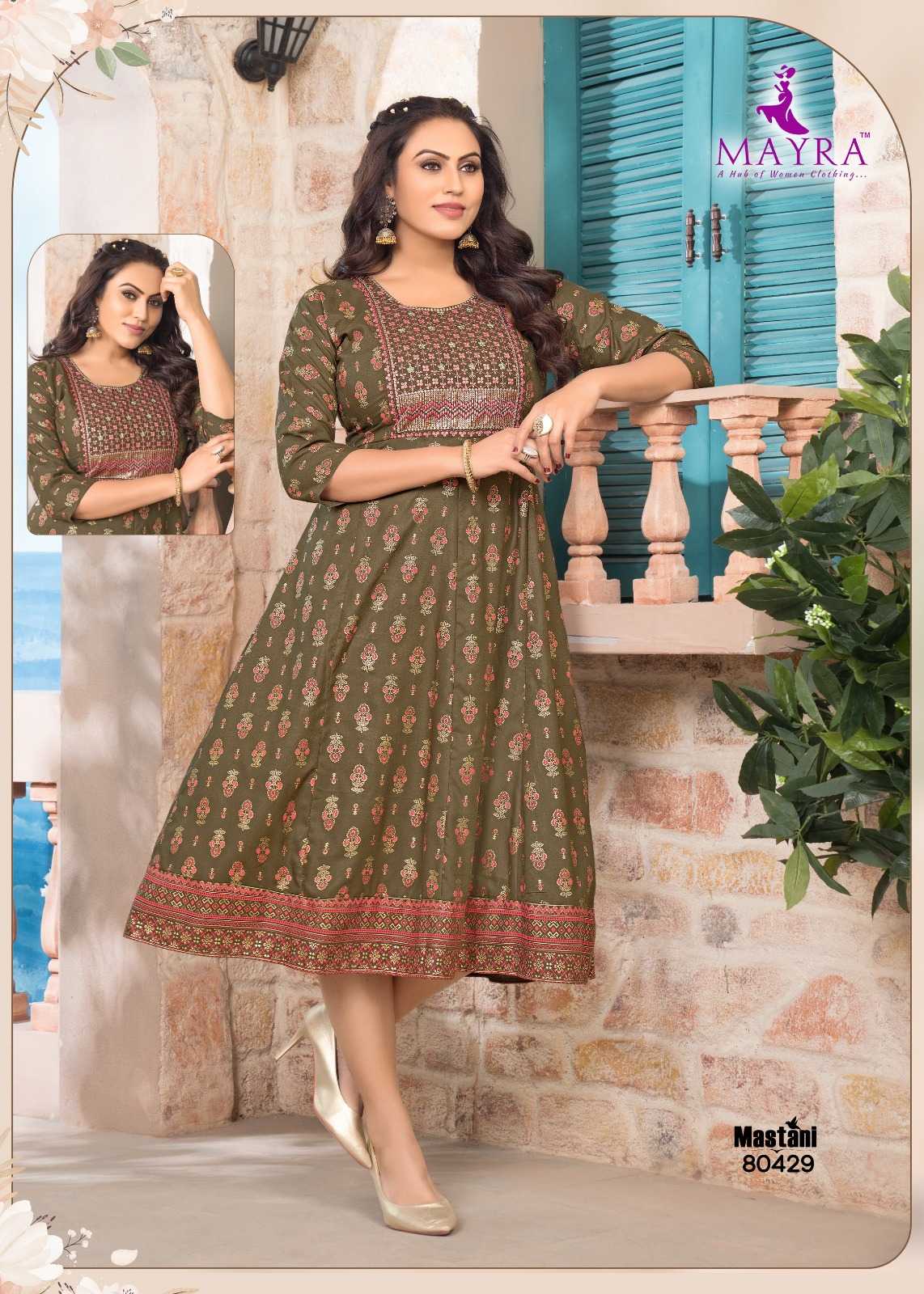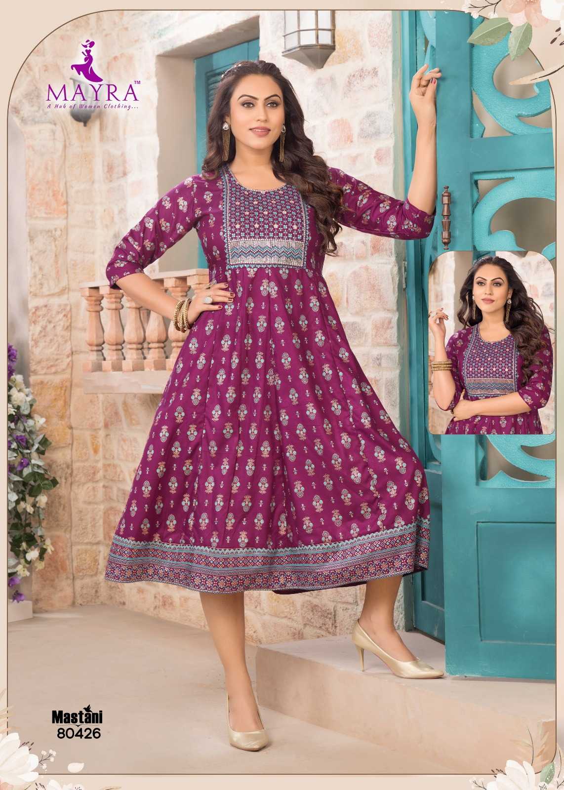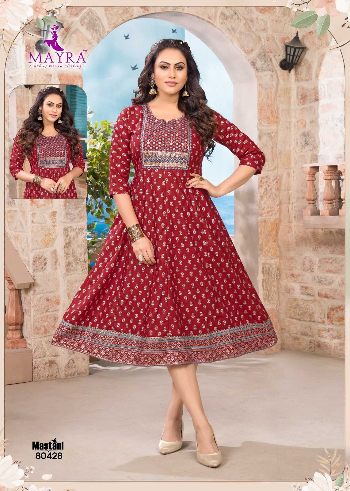 Dear Customers, Welcome to MAYRA (KURTI) .., We are introducing MAYRA 'S new catalog 📕Catalogue:- MASTANI 👗cloth :- *Pure Heavy Liva approved viscose fabric with Machine print with Umberalla kalli with Embroydery with fully interlock kurti * ✅concept :- * Heavy Liva approved Viscose fabrics with machine print with Umbrella kalli pattern Embroydery kurti * Length :- 45”MINIMUM Size:- M,L,XL,XXL,3xl- AVAILABLE 🚛 : Dispatch :- dispatch ready |