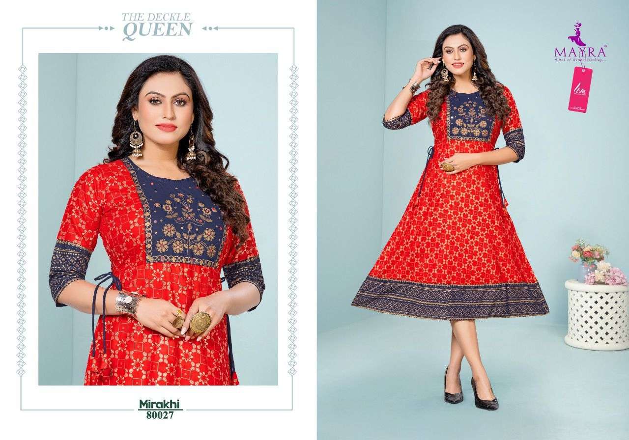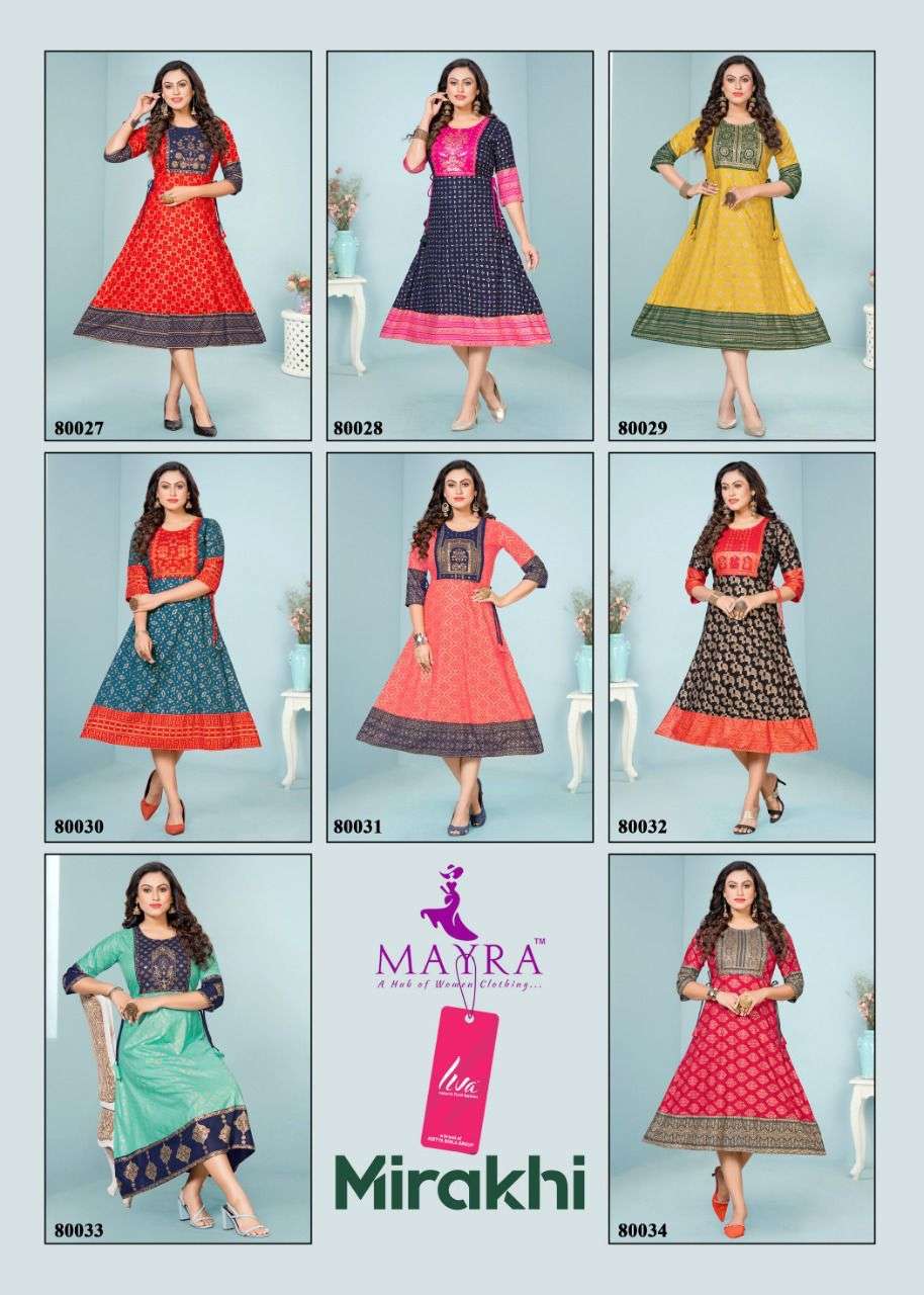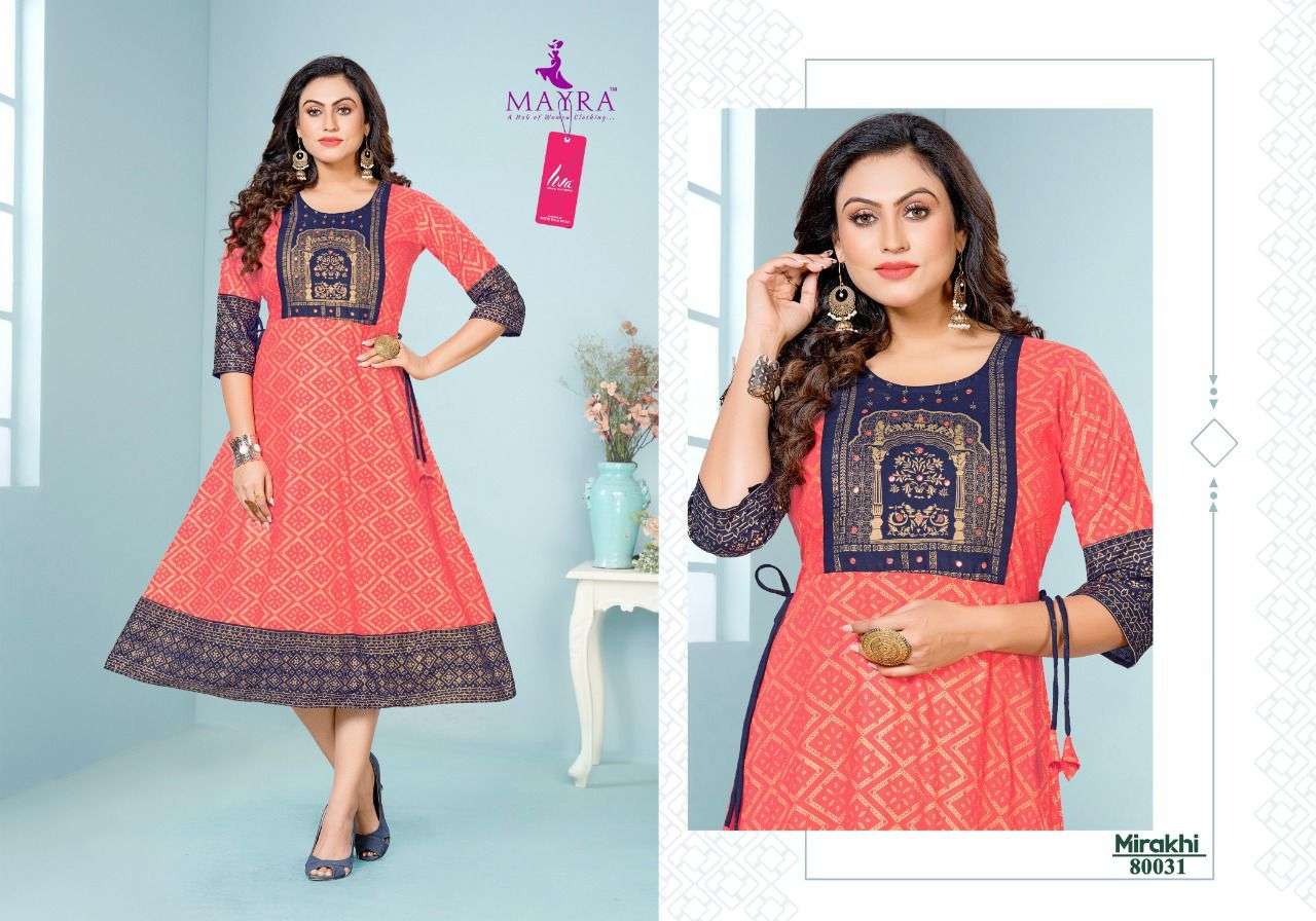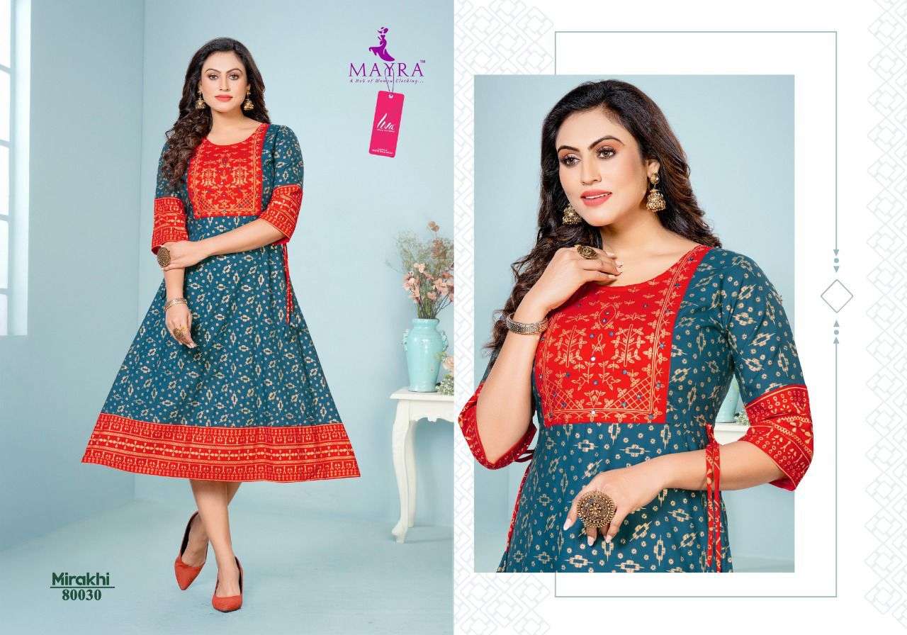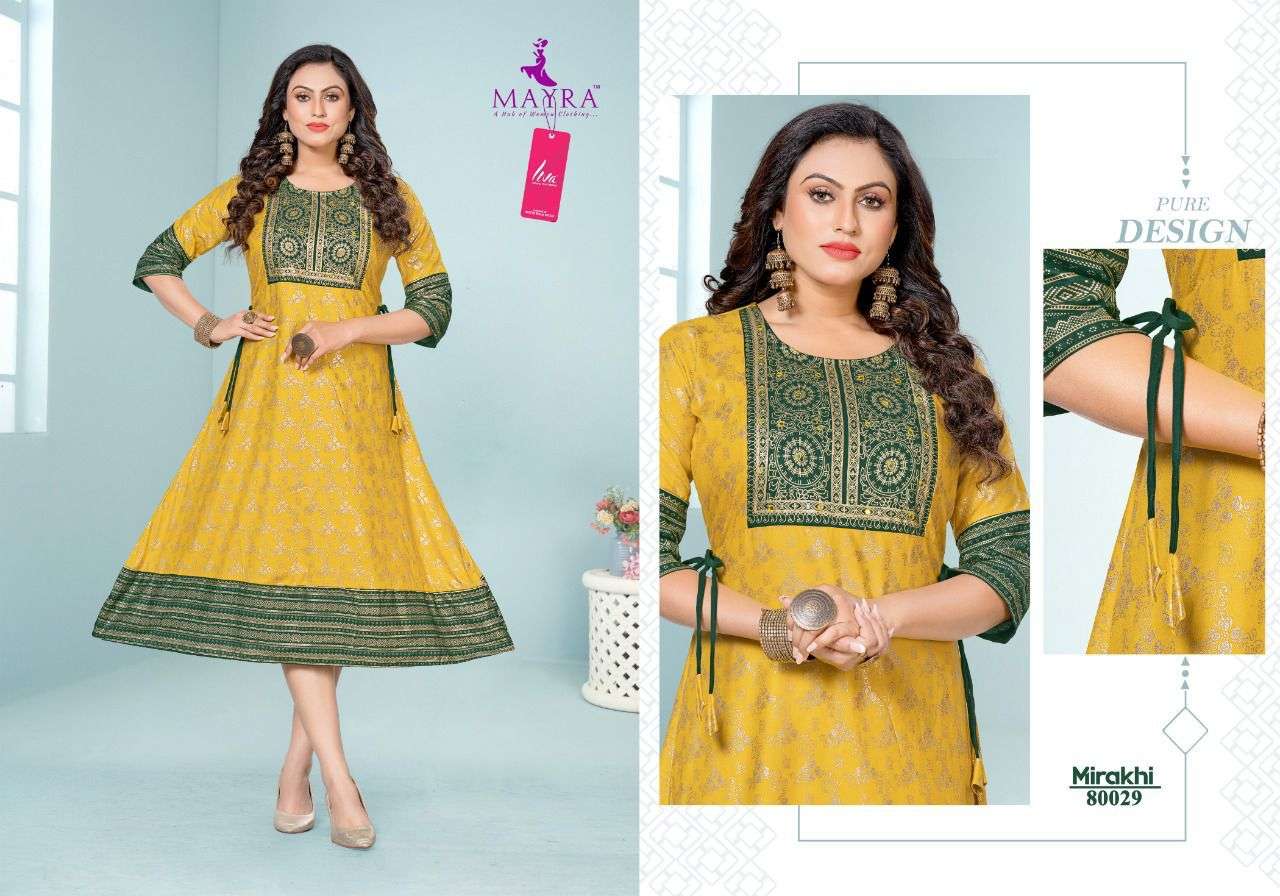 MAYRA MIRAKHI VOL.1 Reyon plain 14kg with Liva tag with machine Gold print with manual tikka handwork with umberalla with side dori KURTI CATALOG WHOLESALER BEST RATE