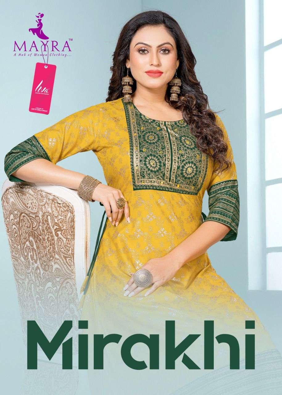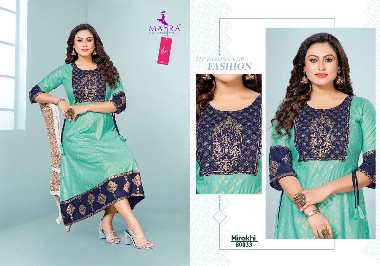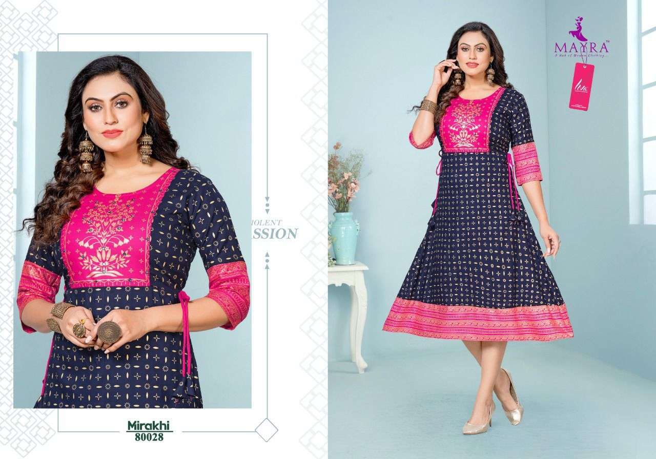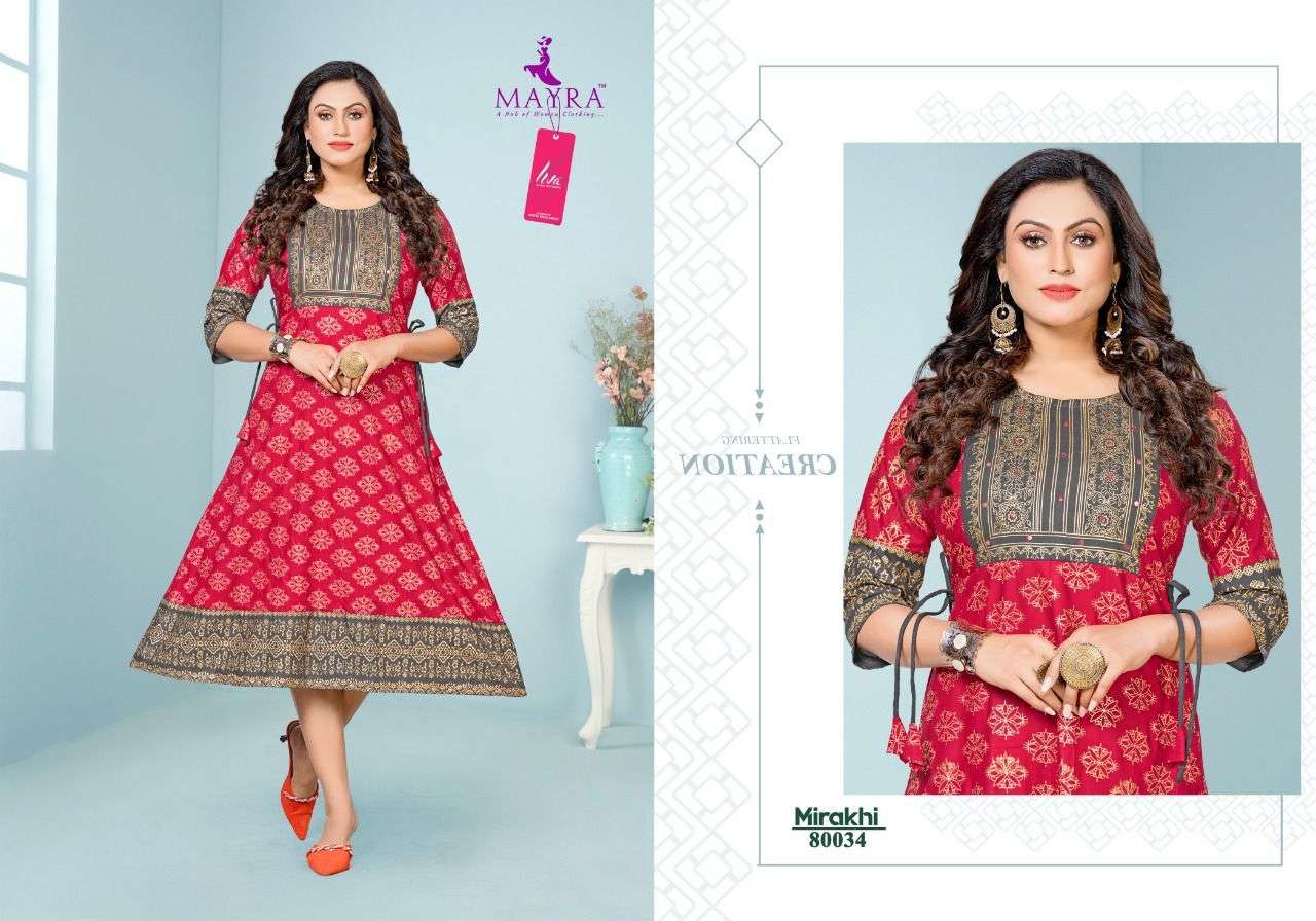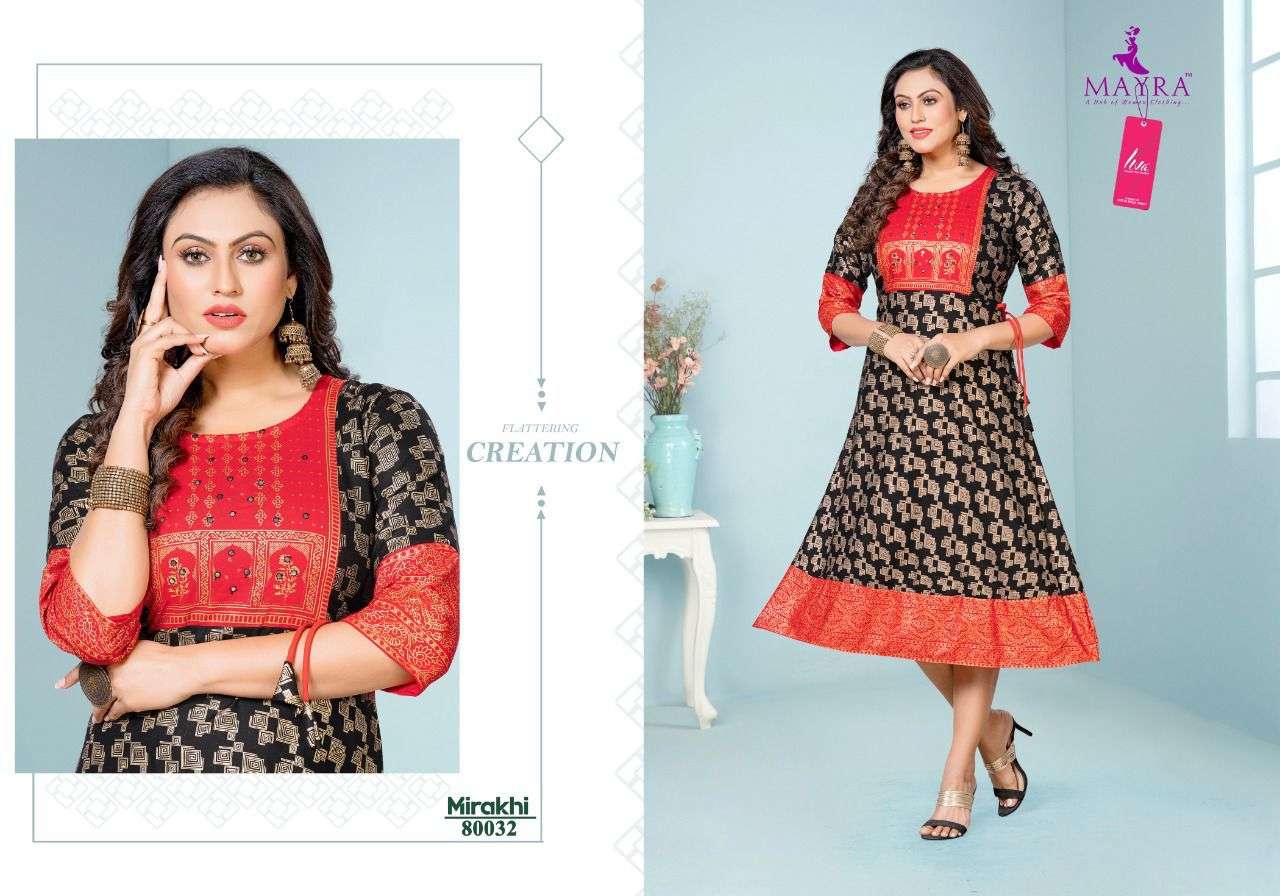 MAYRA MIRAKHI VOL.1 Reyon plain 14kg with Liva tag with machine Gold print with manual tikka handwork with umberalla with side dori KURTI CATALOG WHOLESALER BEST RATE