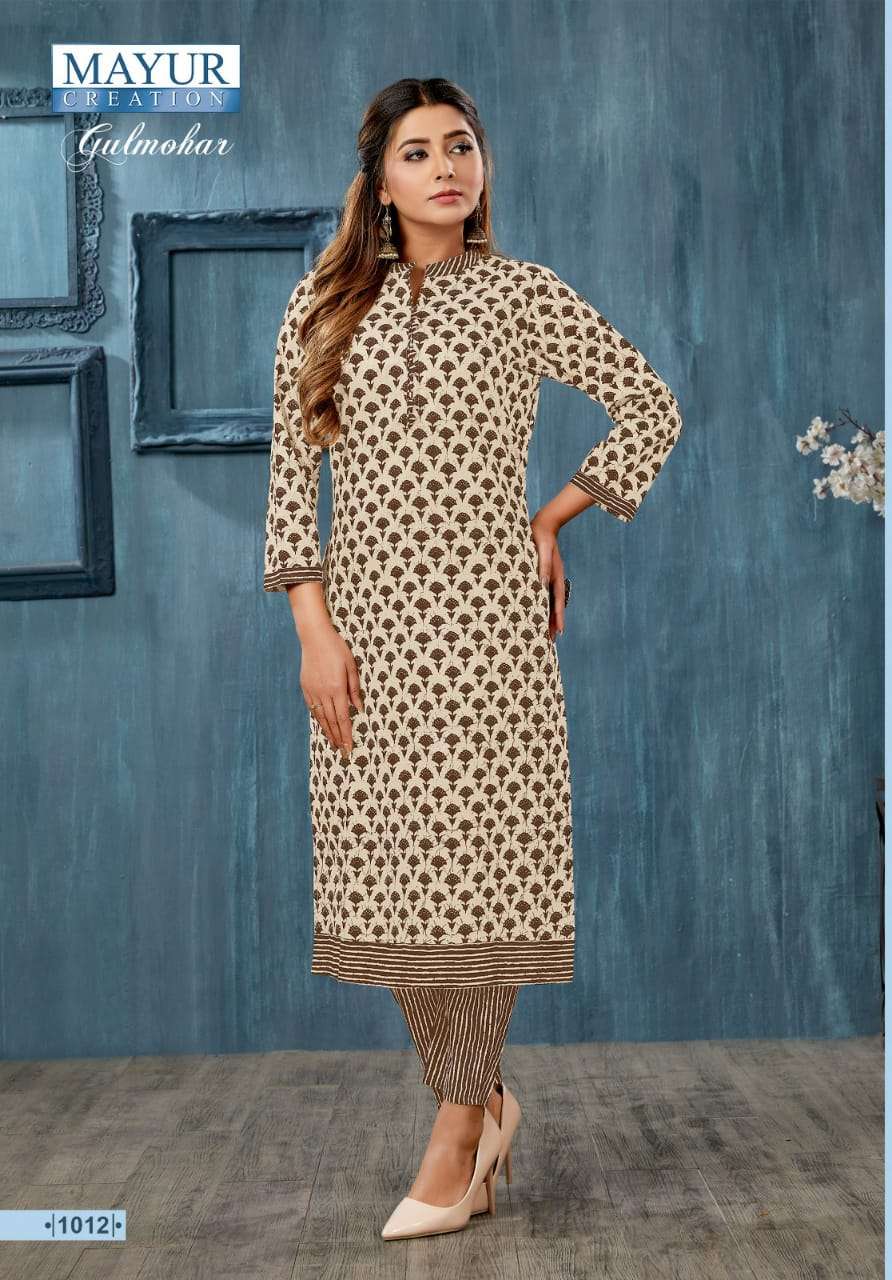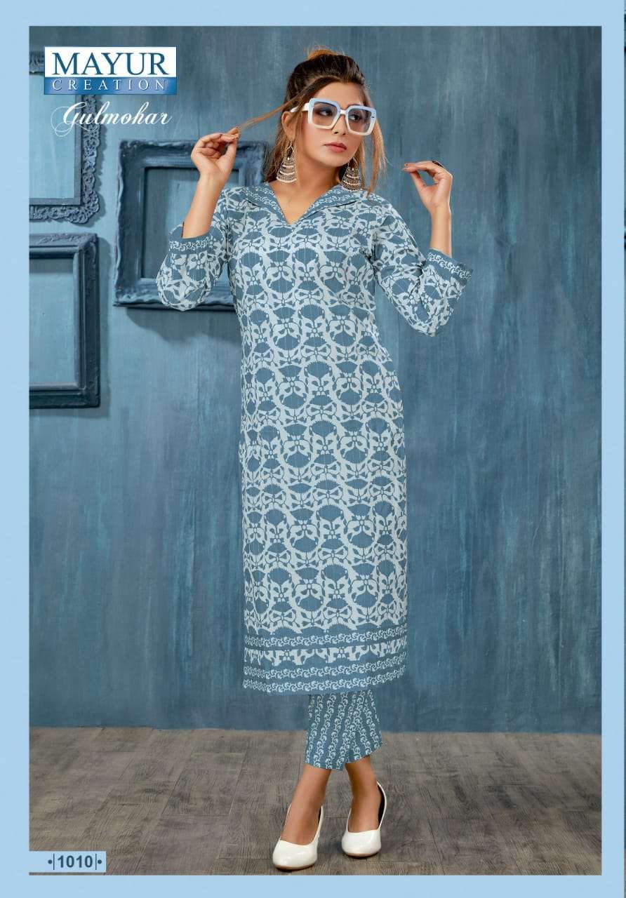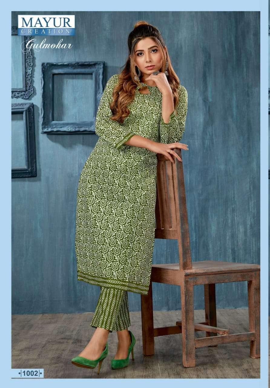 Catalog :- 🌞 GULMOHAR 🌞 👗TOP :- Fully stich Pure Cotton print with style Bottom :- Pure cotton pant with fancy Style Rate :- 399 plus gst Size :- ☣Designs :- 12 pcs |