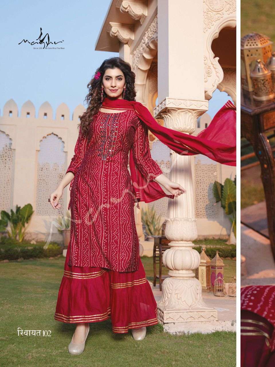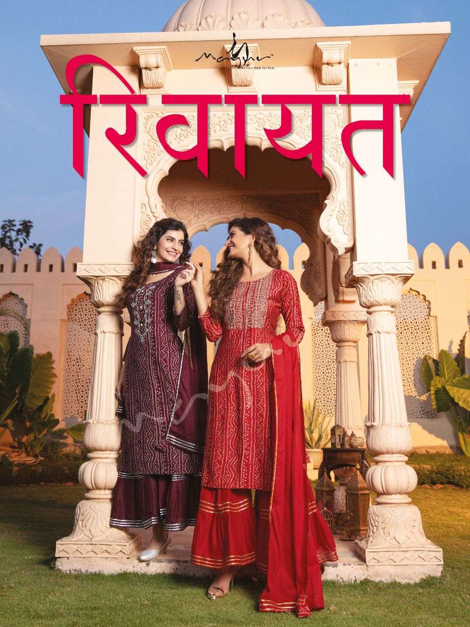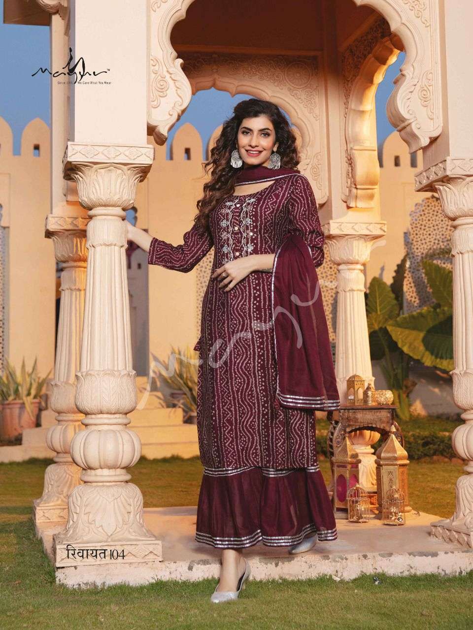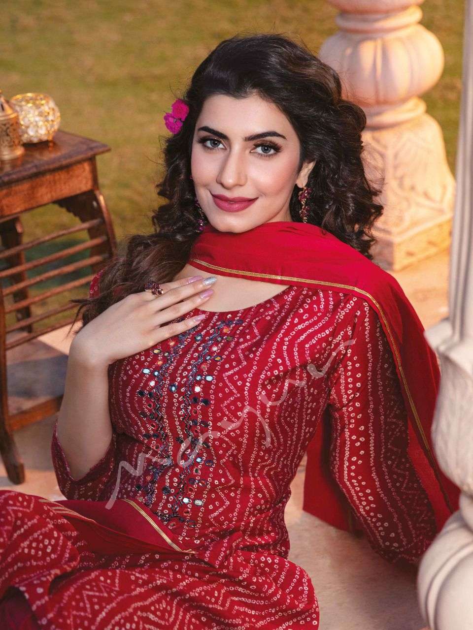 mayur present riwayat fancy bandhej kurta sharara dupatta readymade collection