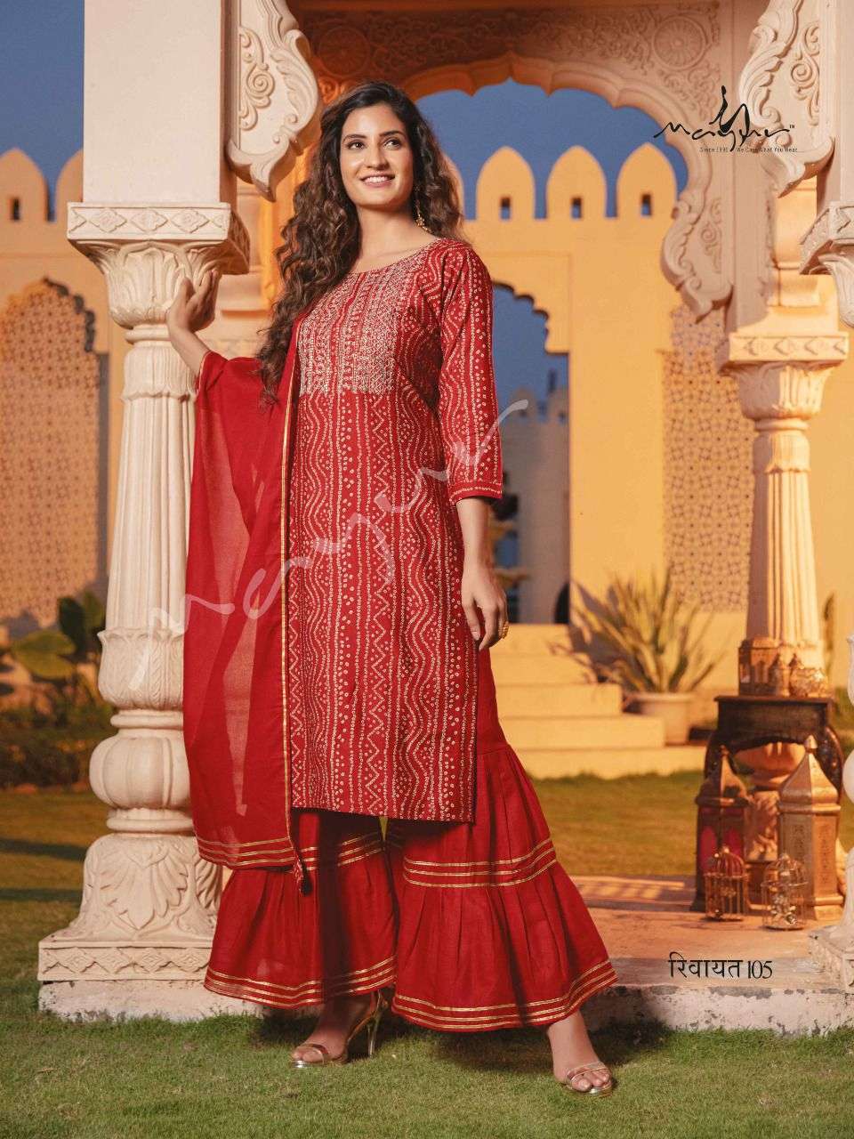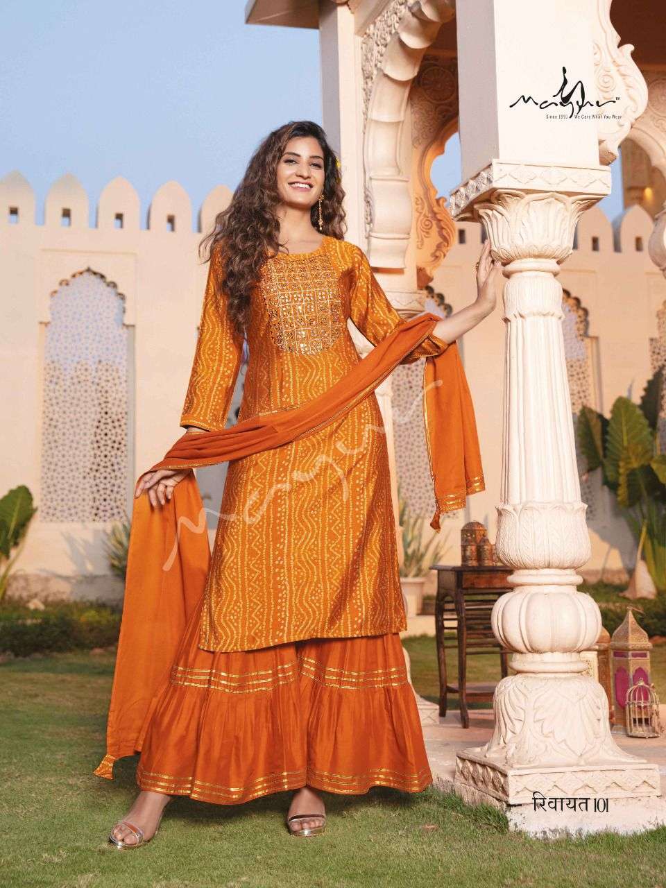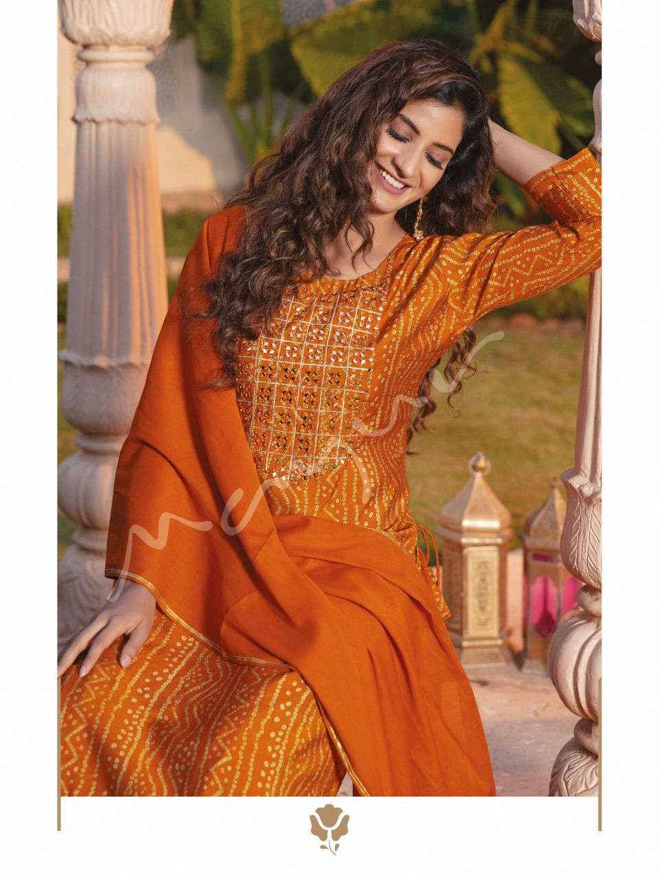 mayur present riwayat fancy bandhej kurta sharara dupatta readymade collection