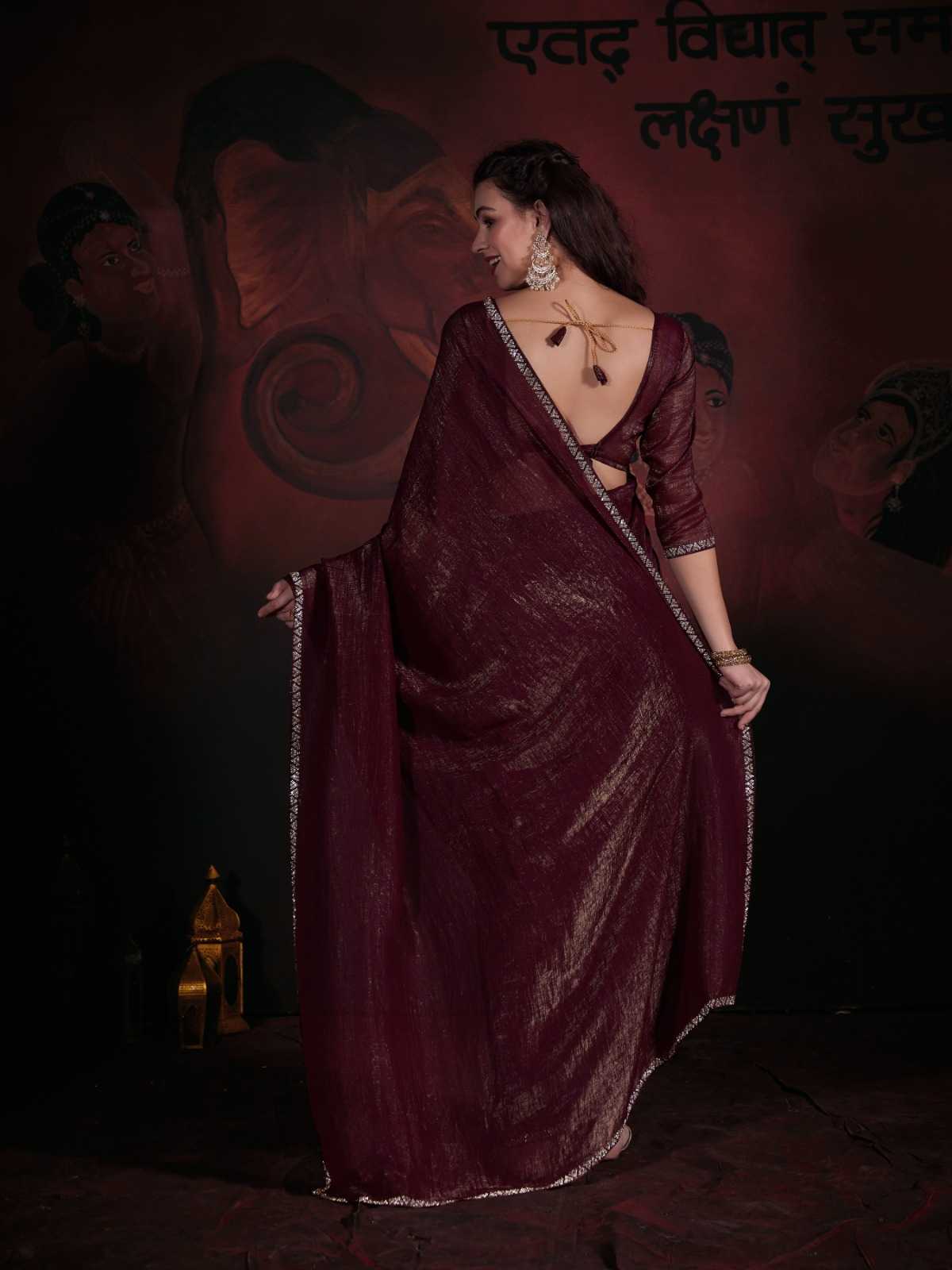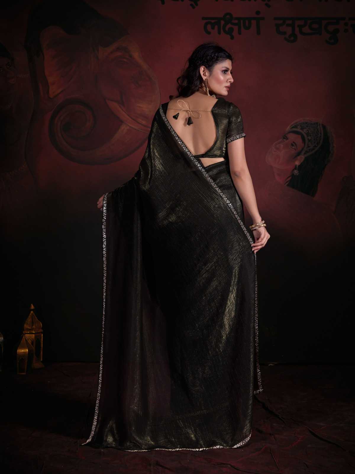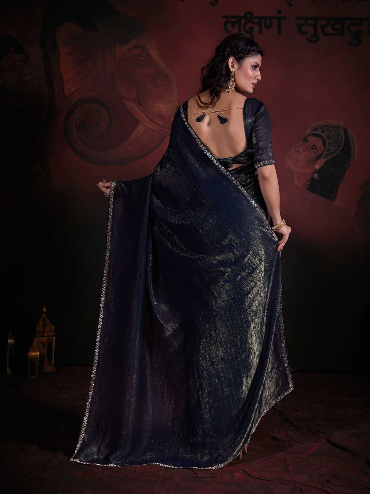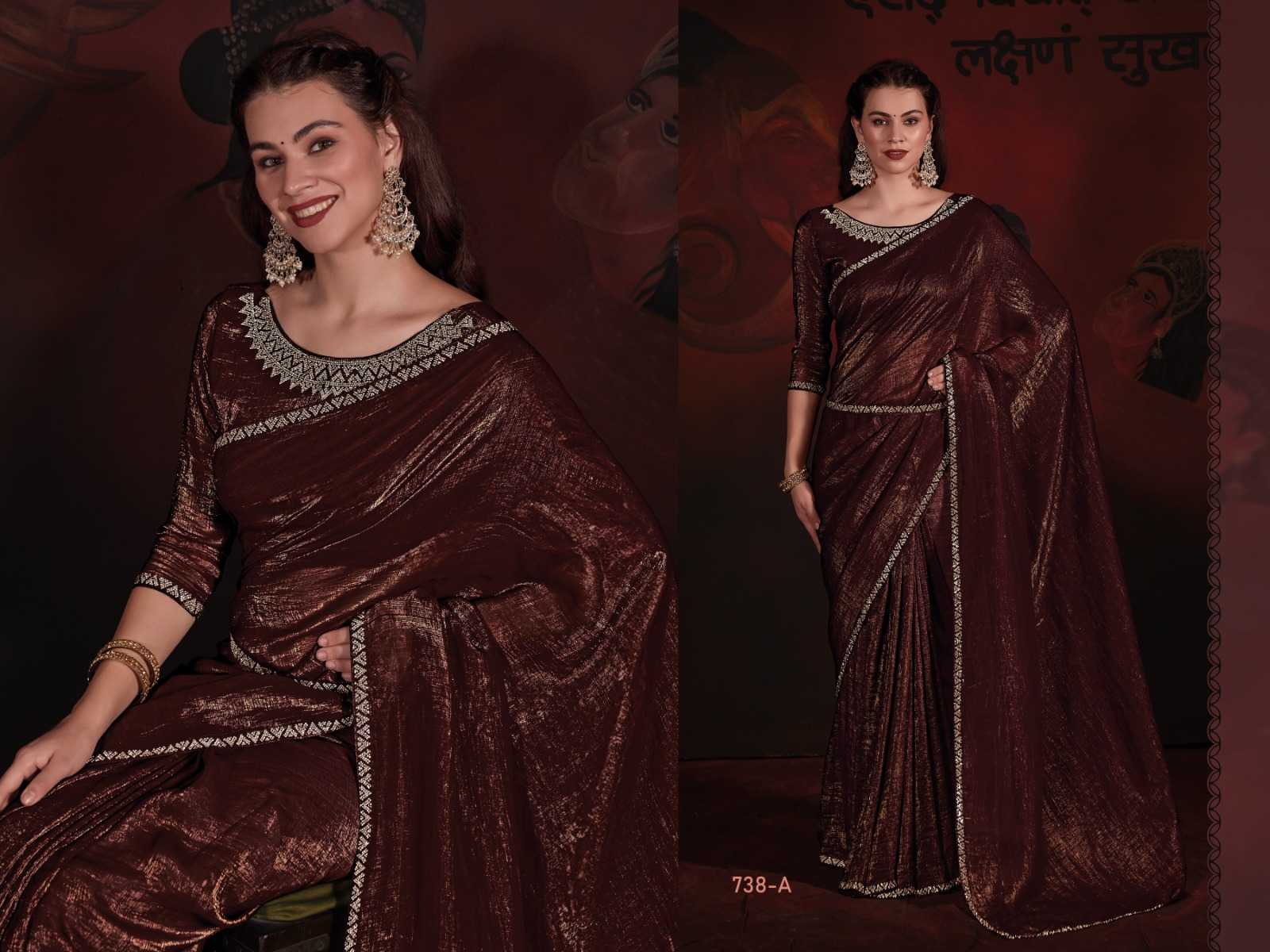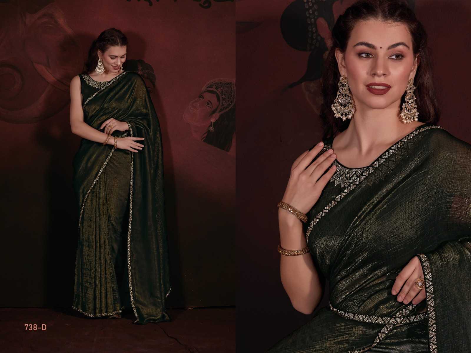 Brand Name – Mehak Catalog : Mahek D.No. 738A To 738D Colour 4 FABRIC: Shiny Self Crush Effect Jari Fabric with Handwork Zircon Border Same Fabric Running Blouse with Zircon Work Neck and Belt Rate : 1950/- Gst 5% Extra Occasion : wedding, party ,event |