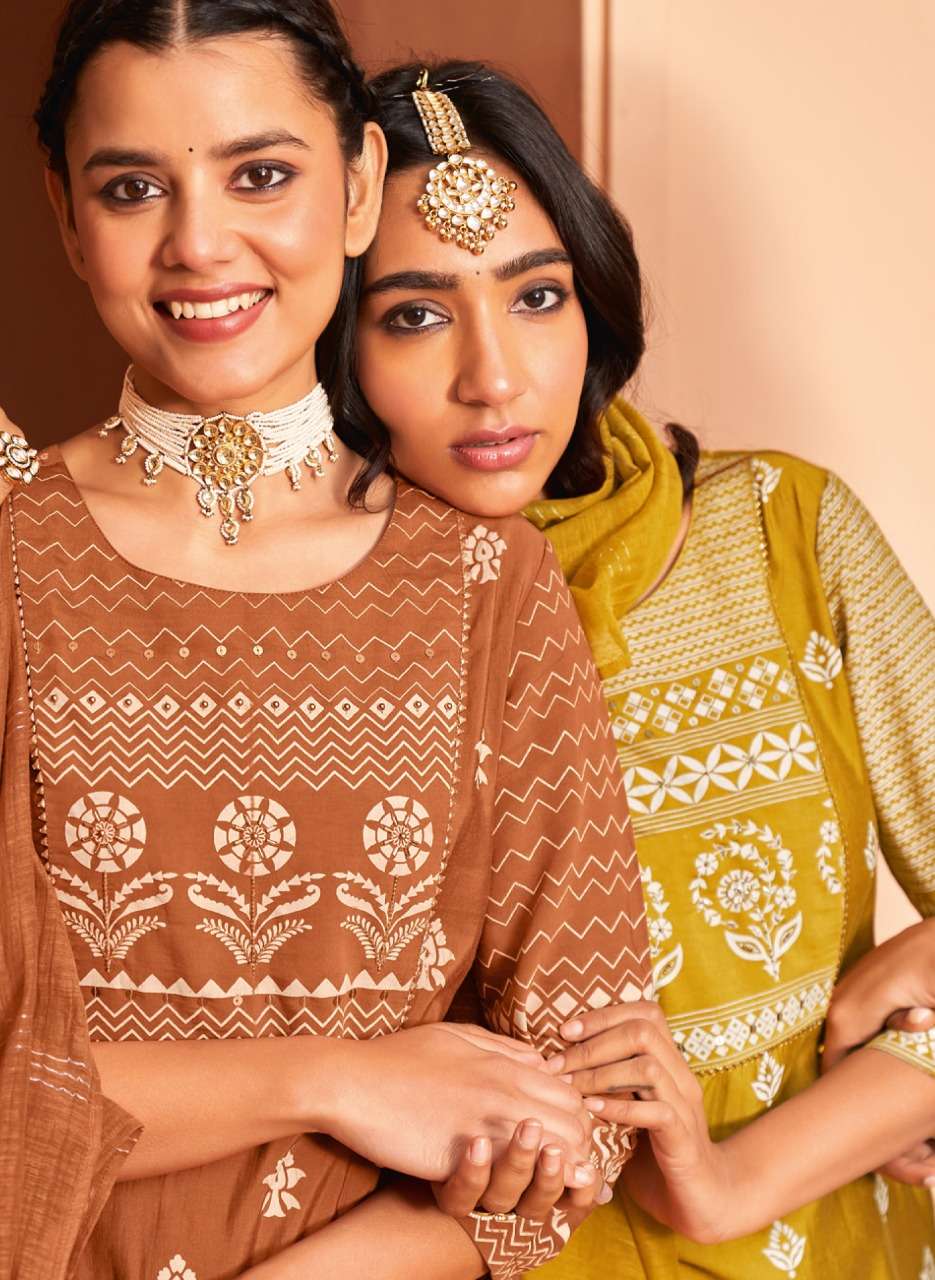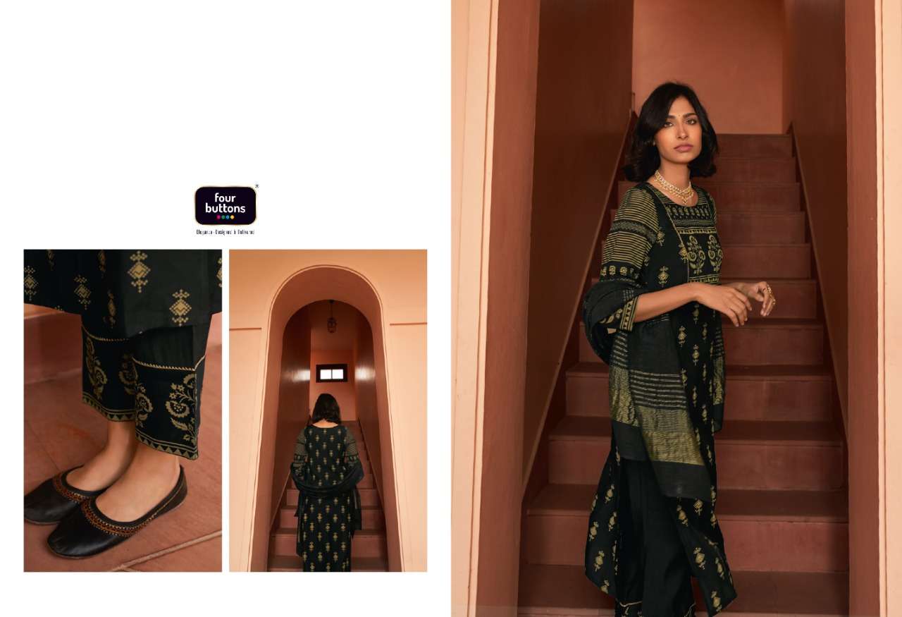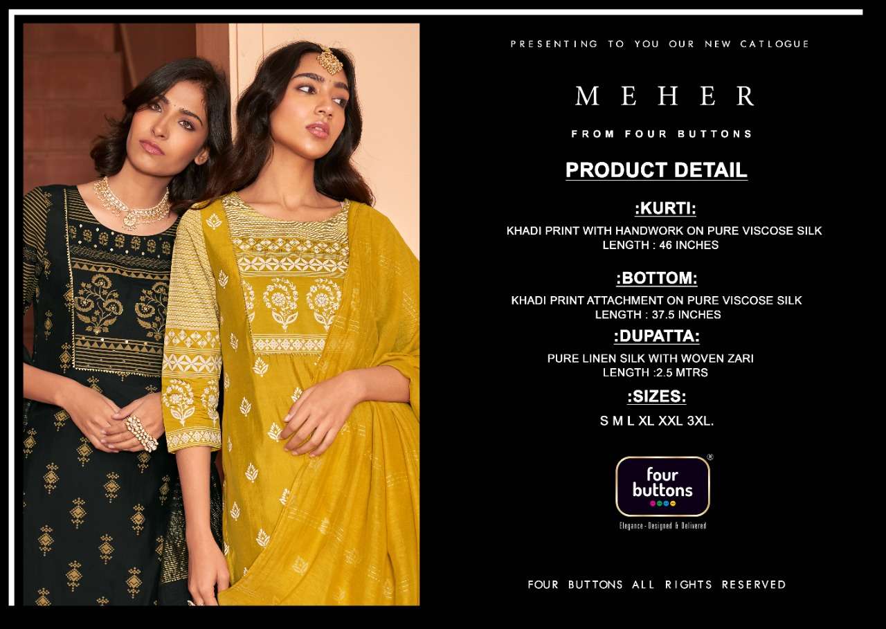 FOUR BUTTONS proudly launches its NEW collection 2022 "MEHER" FABRIC KURTI - KHADI PLACEMENT PRINTS WITH HANDWORK ON PURE VISCOSE SILK BOTTOM - KHADI PRINT ATTACHMENT ON PURE VISCOSE SILK DUPATTA- PURE LINEN SILK WITH WOVEN ZARI DUPATTA RATE - Rs 1151/- SIZES - S, M, L, XL, XXL, 3XL |