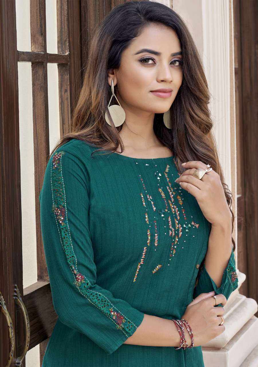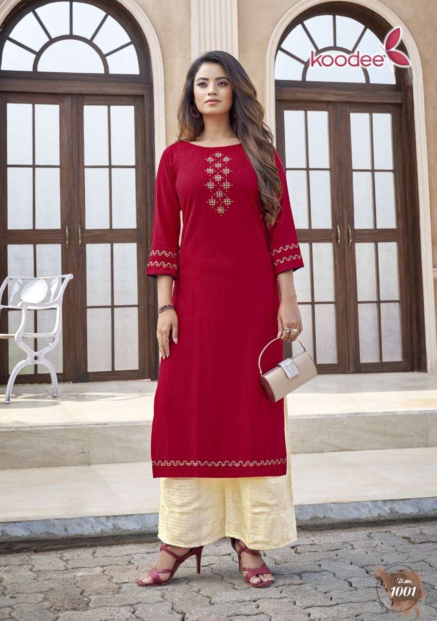 Brand Name : KOODEE Catalog : Mellow Designs : 6 Fabric:- Top:- Pure Viscose With Stripe Plazzo :- Viscose with Weaving sequence Work: Embroidery + Khatli Work Size : S(36),M(38), L(40), XL(42), 2XL(44), 3XL(46) Dispatching :- Ready to ship  Rate :- 750 + 5% gst |