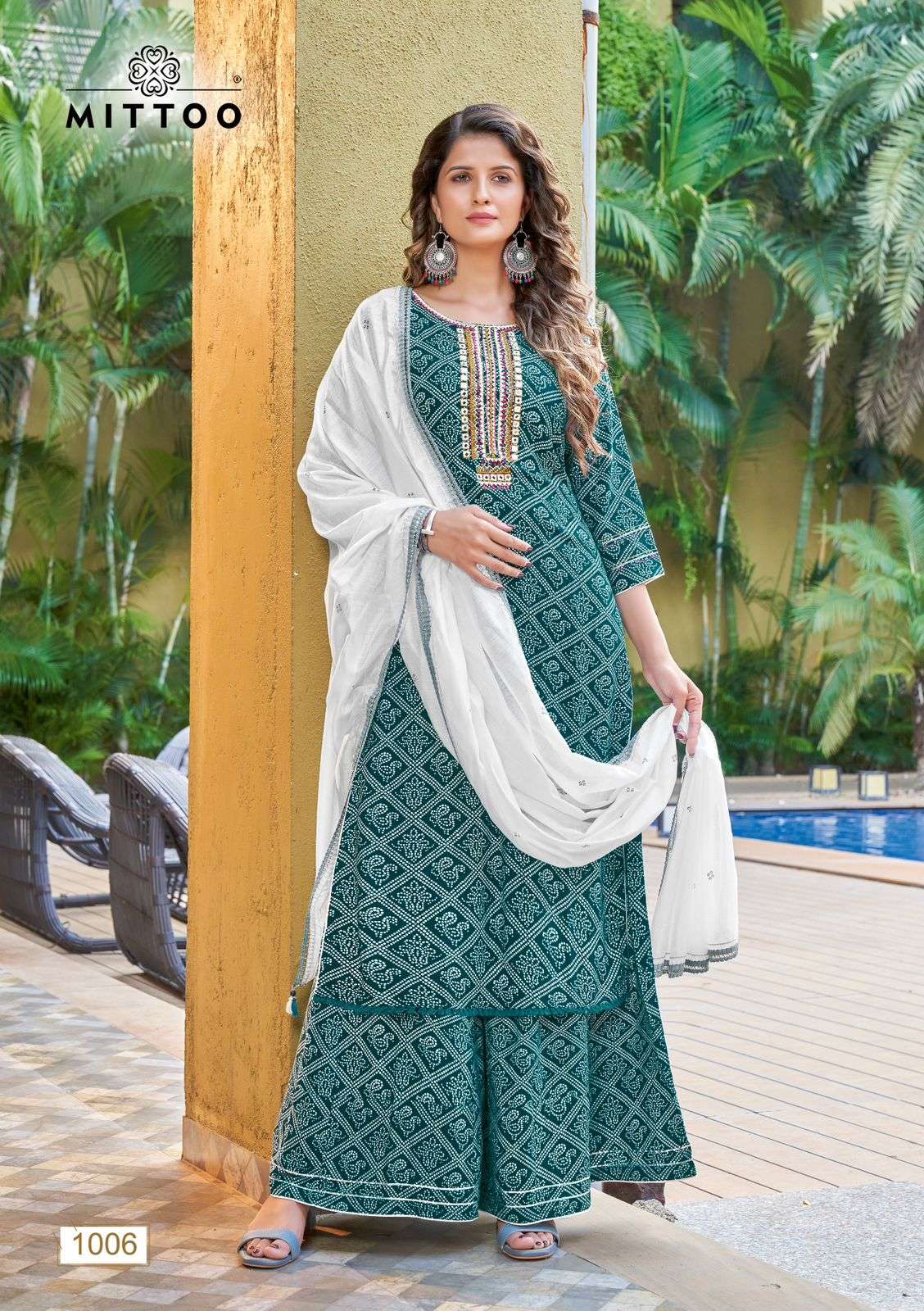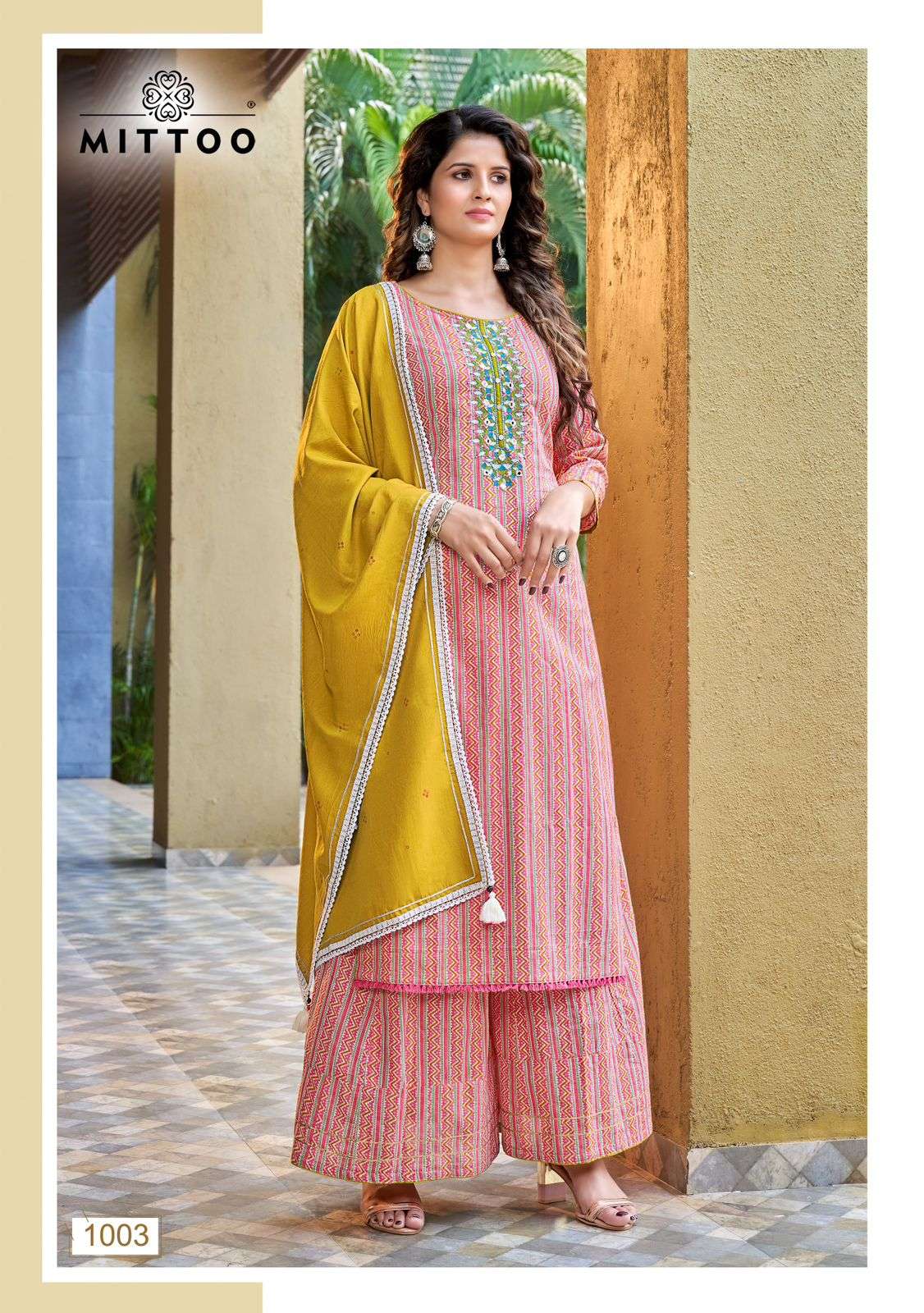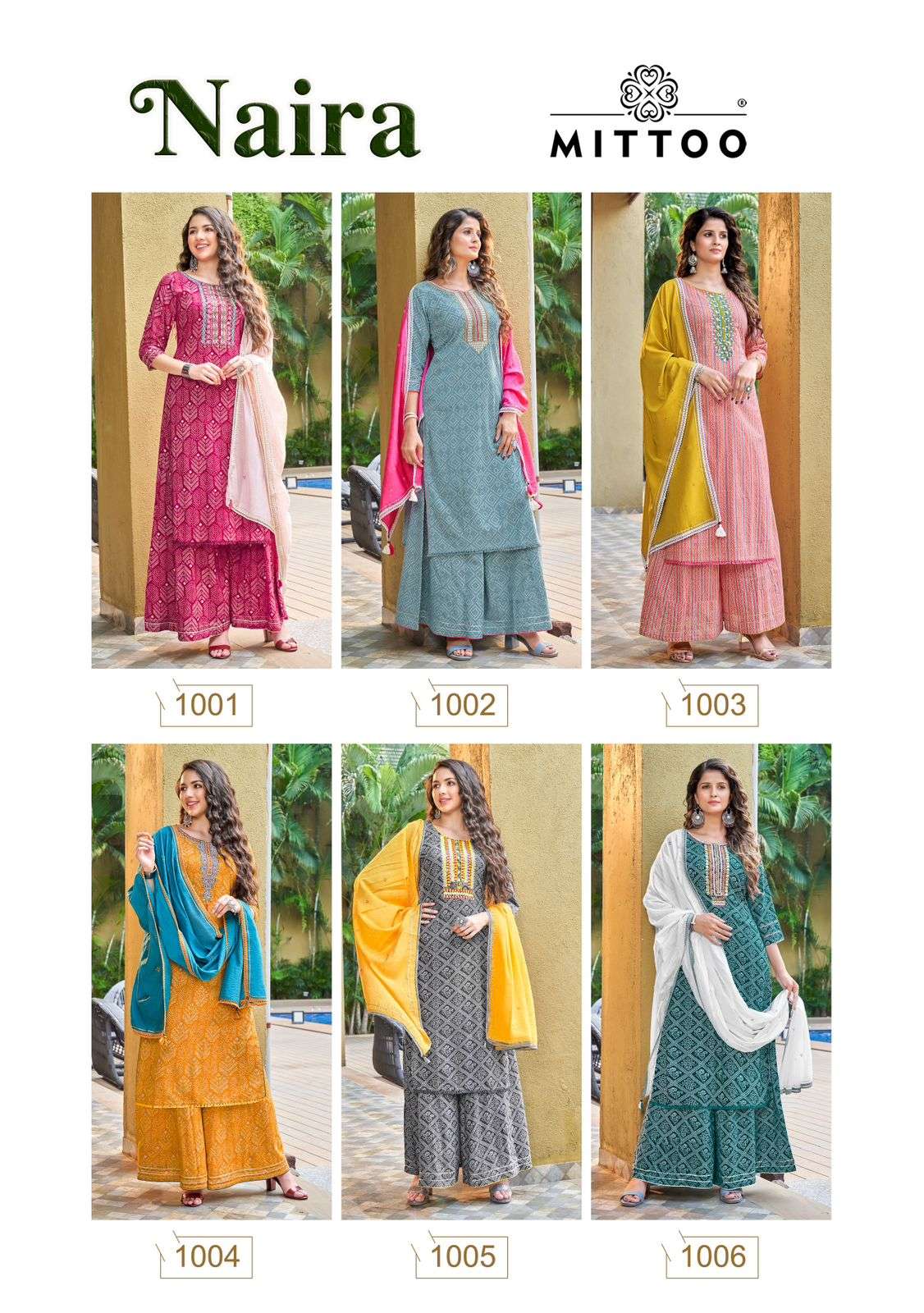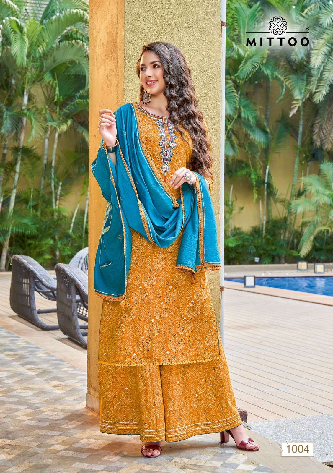 Brand Name : MITTOO Catalog : NAIRA No of Design : 6 Fabric Details Plazzo : Rayon Print Dupatta : Chanderi Viscose Size : M(38), L(40), XL(42), XXL(44), 3XL(46) Rate : 1240 / Pic + GST Dispatch with in 3-4 days |