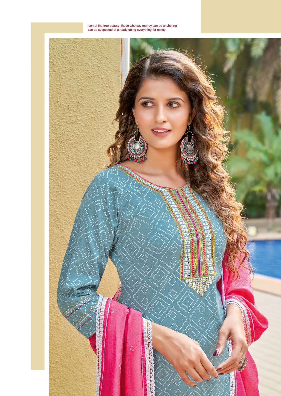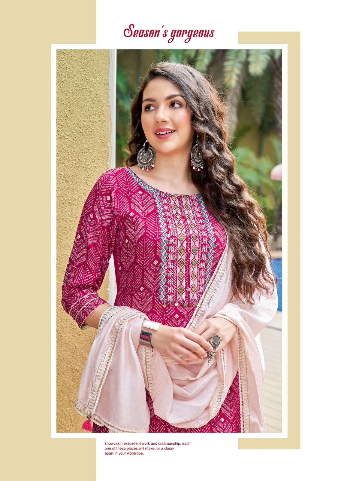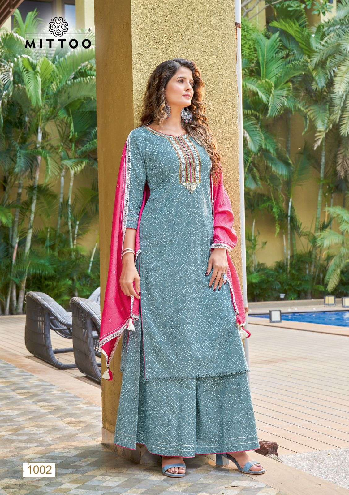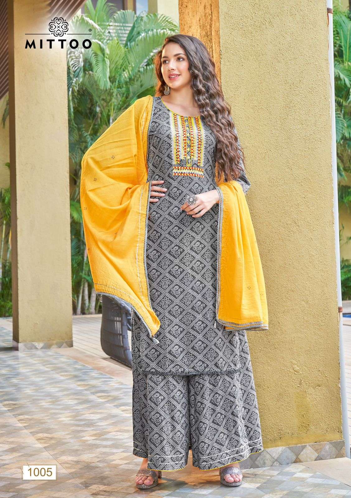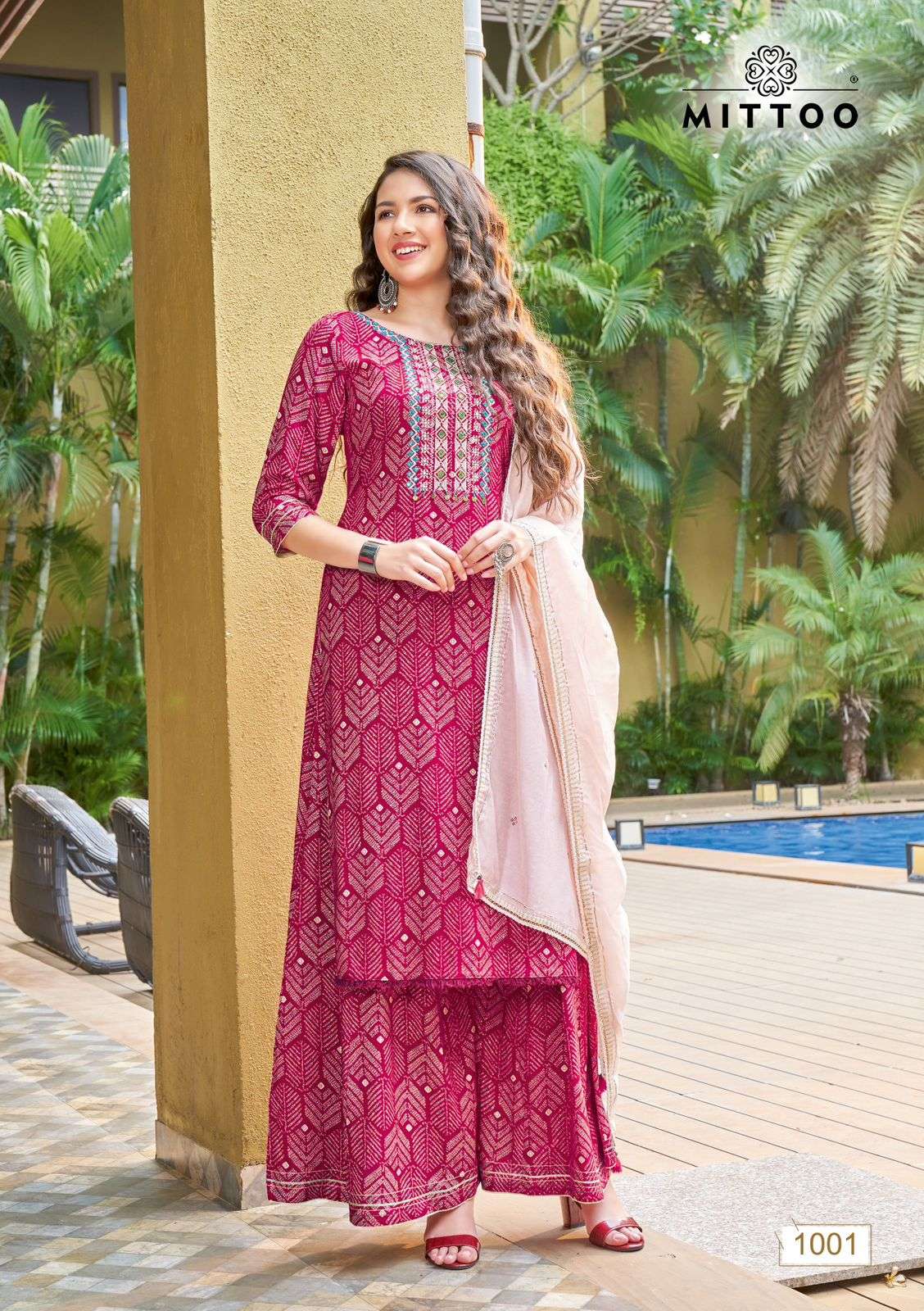 Brand Name : MITTOO Catalog : NAIRA No of Design : 6 Fabric Details Plazzo : Rayon Print Dupatta : Chanderi Viscose Size : M(38), L(40), XL(42), XXL(44), 3XL(46) Rate : 1240 / Pic + GST Dispatch with in 3-4 days |