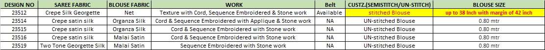 | Note | Stitching available on customer Requirment For Sarees , Salwar Kameez, Lehengha.(i.e M,L,XL,XXL). |