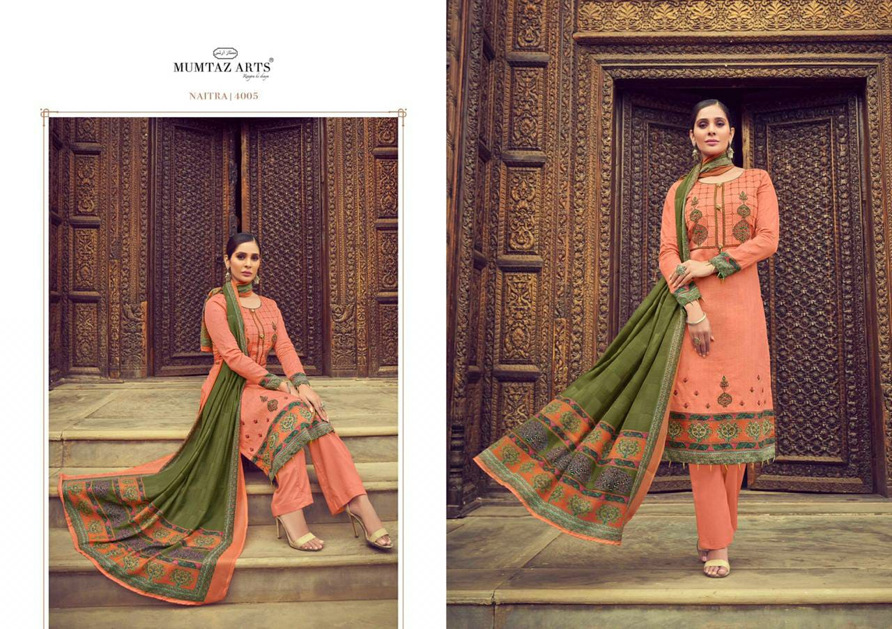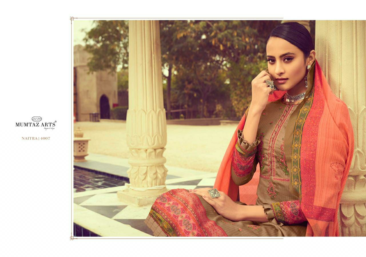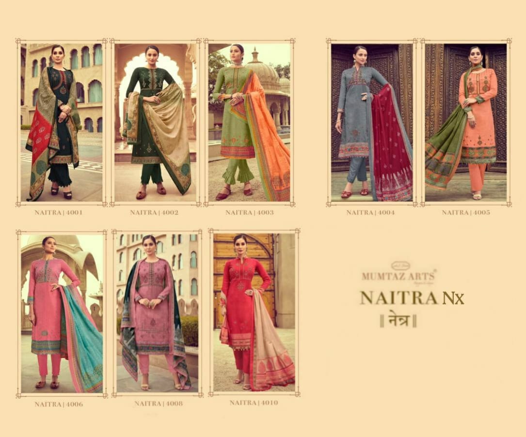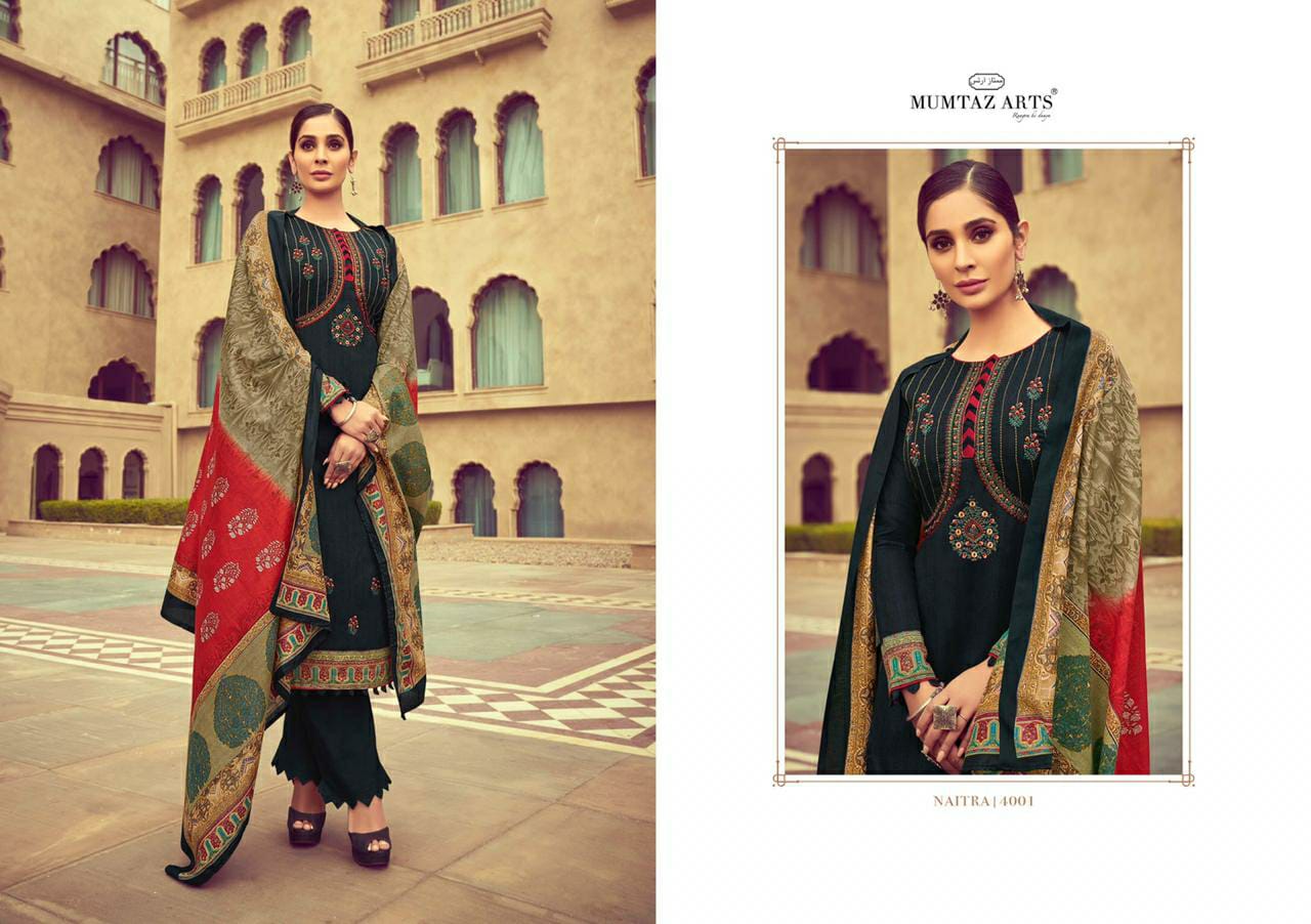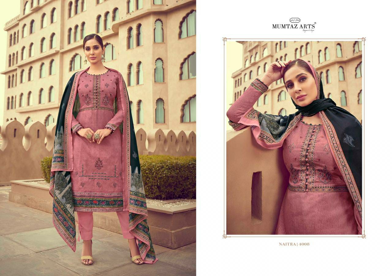 MUMTAZ ARTSâ„¢ RANGON KI DUNYA Name - NAITRA NX DESIGNER EMB ON SHIRT KARACHI SUITS DIGITAL PRINT DUP BOX PALLU Fabric details - Top - Pure Original Jam Satin Digital Print Top- Designer Kashmiri EMB Bot - Pure cotton dyed (2.70 mtr app) Dup -PURE NAZNEEN BOX PALLU DIGITAL PRINT Designs - 8 pcs Selling Rate - 699/- +GST DESIGNER EMB ON TOP SPECIAL POUCH PACKING |