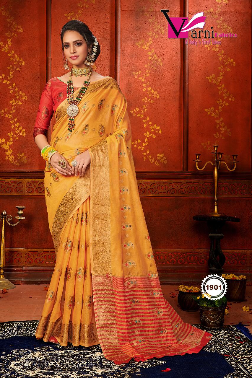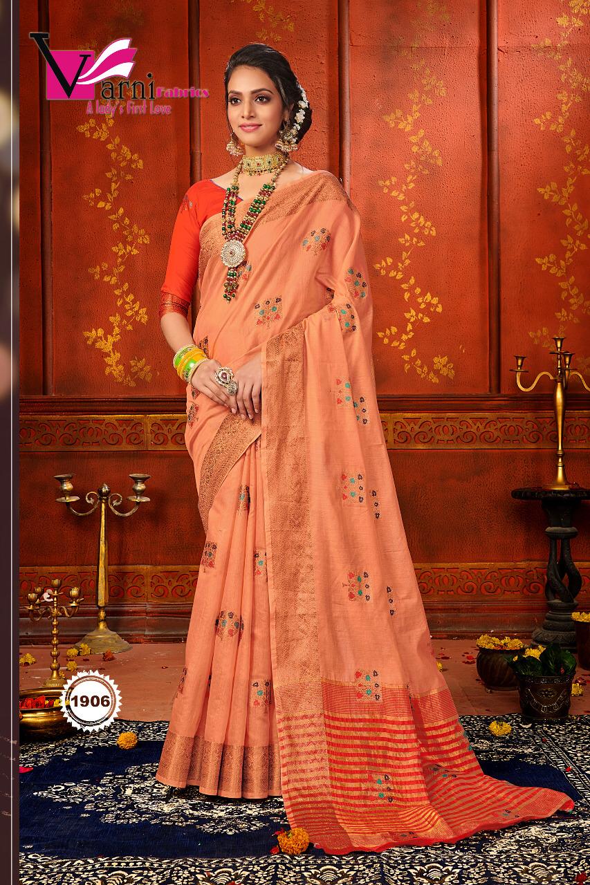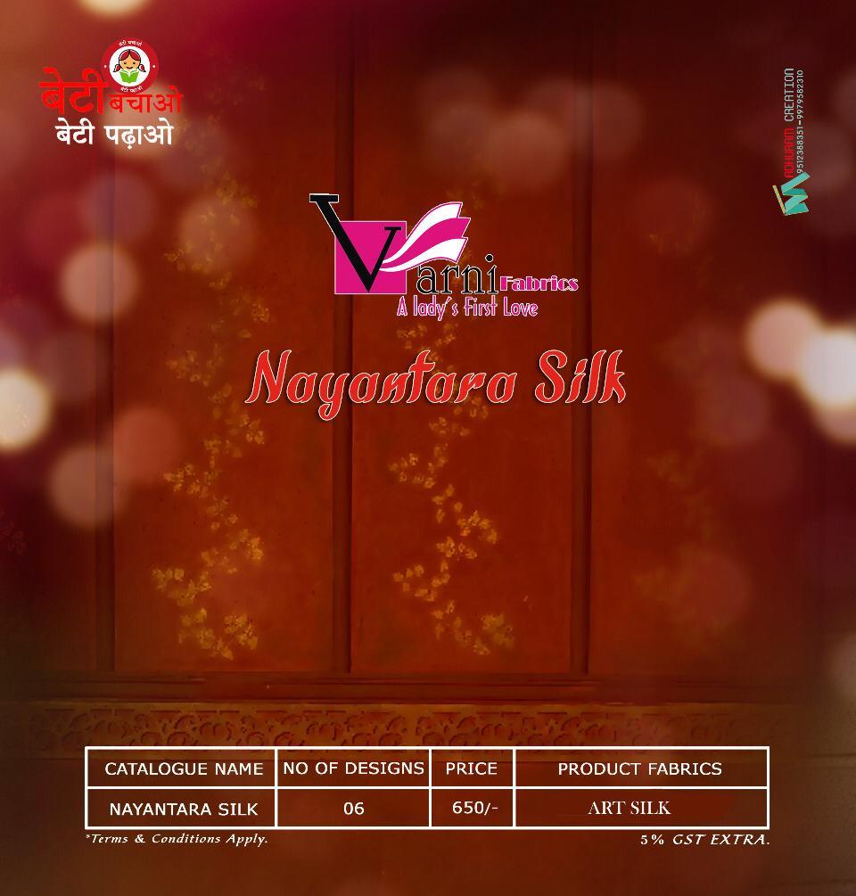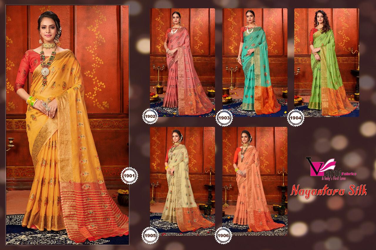 Brand - Varni fabric. Catlog name- NAYANTARA SILK . Series - 1901 to 1906. Rate - 650 per Pcs Delivery from tomorrow |