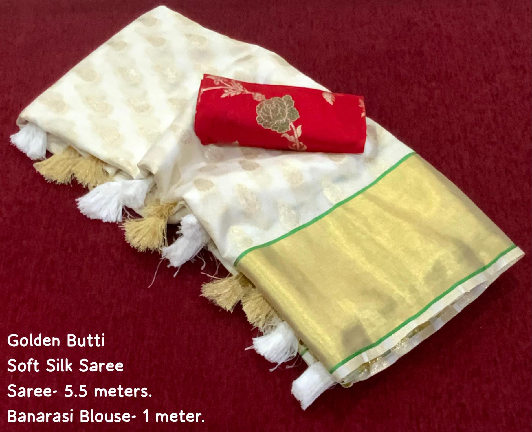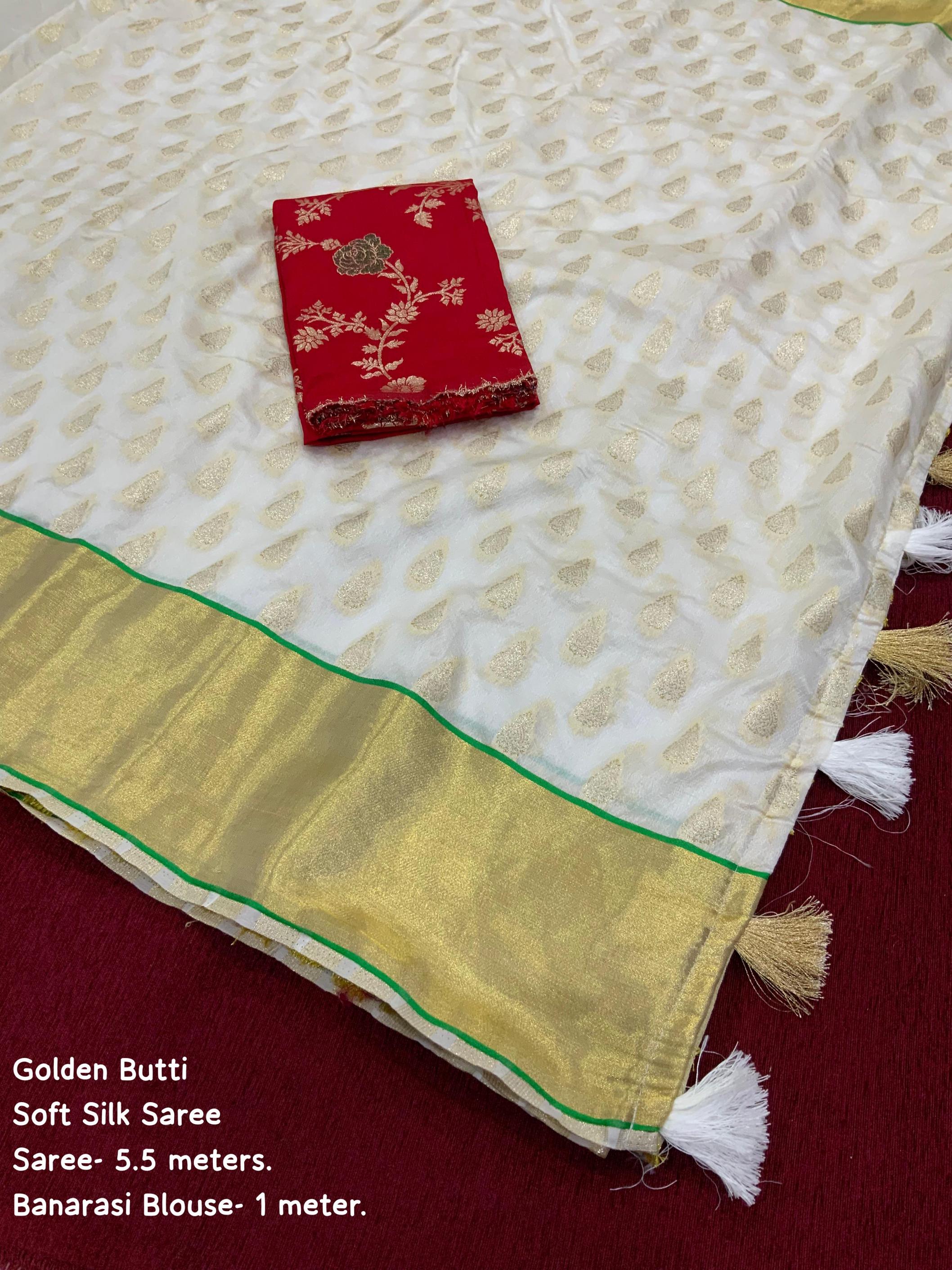 new arrivals AND :- off whiute Special Edition. Quality- Soft Silk Saree with zari woven butti, Golden zari border and Rich look pallu. Cotton tasslels on pallu. Blouse- Heavy Banarasi Silk Blouse Rate- 699+ship Top trusted quality. |