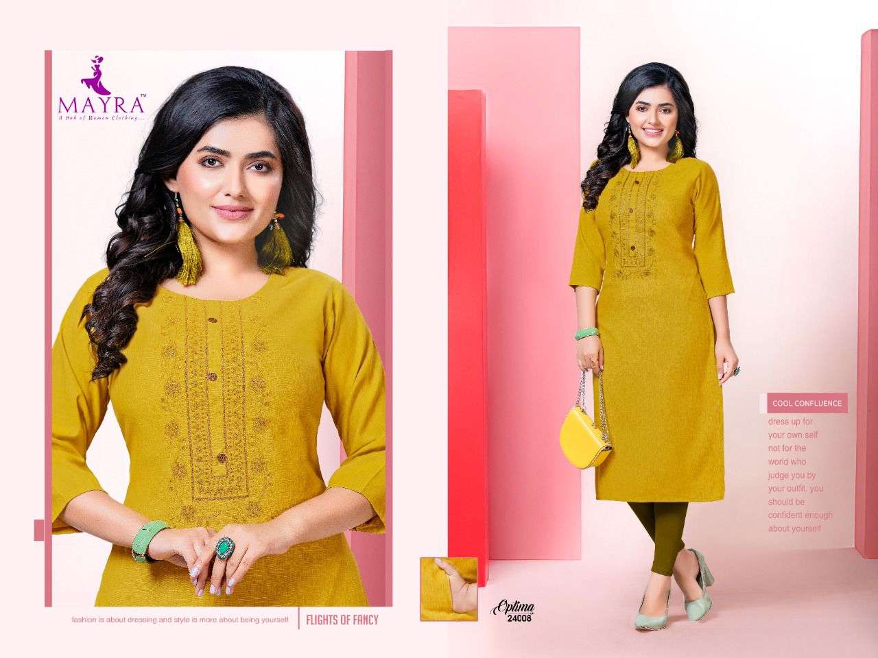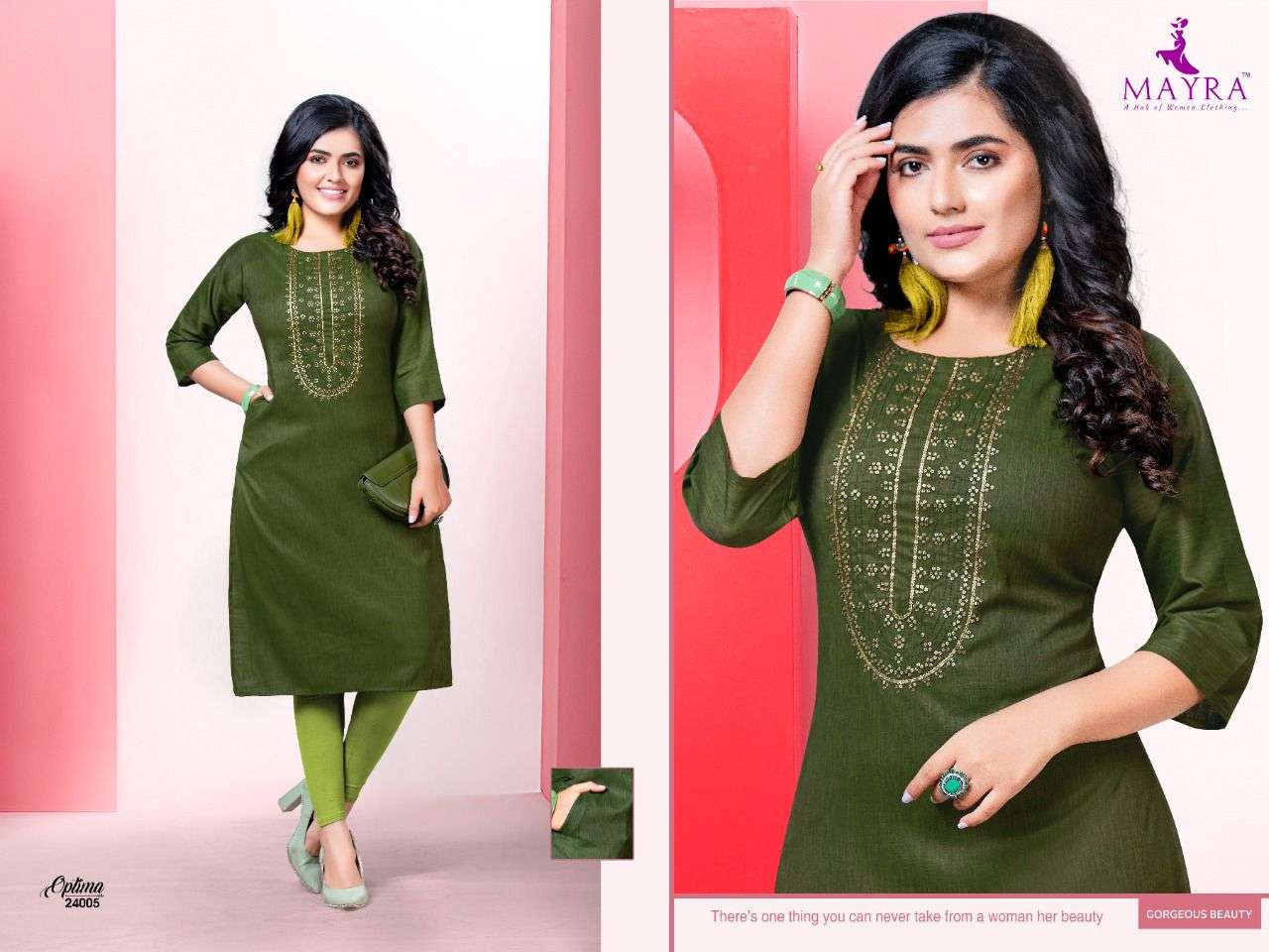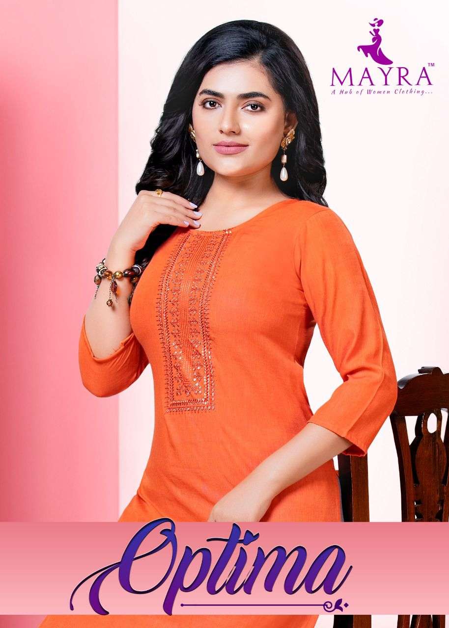 | Other Details | Dear Customers, Welcome to MAYRA (KURTI) .., We are introducing MAYRA 'S  new catalog Catalogue:- OPTIMA cloth :- Reyon liquid slub  with sequence Embroydrey and stiching pattern with side pocket concept :- sequence embroidery and stiching pattern with Reyon liquid slub with side pocket *Full interlock on each joint ton to ton interlock back with Prince Kali * Length :- 45âMINIMUM Size:- S,M,L,XL,XXL AVAILABLE 8 DESIGNS CATALOGUE  : Dispatch :- dispatch after 14 august RATE : 390/- Always with you... Team MAYRA THANKS SIR/MADAM.. |