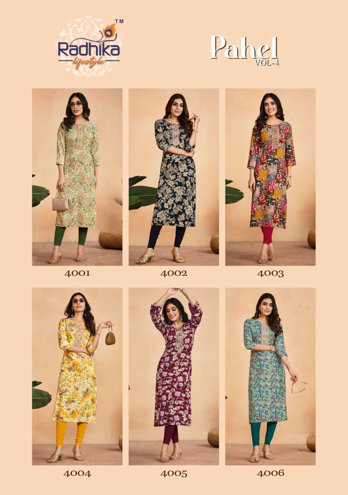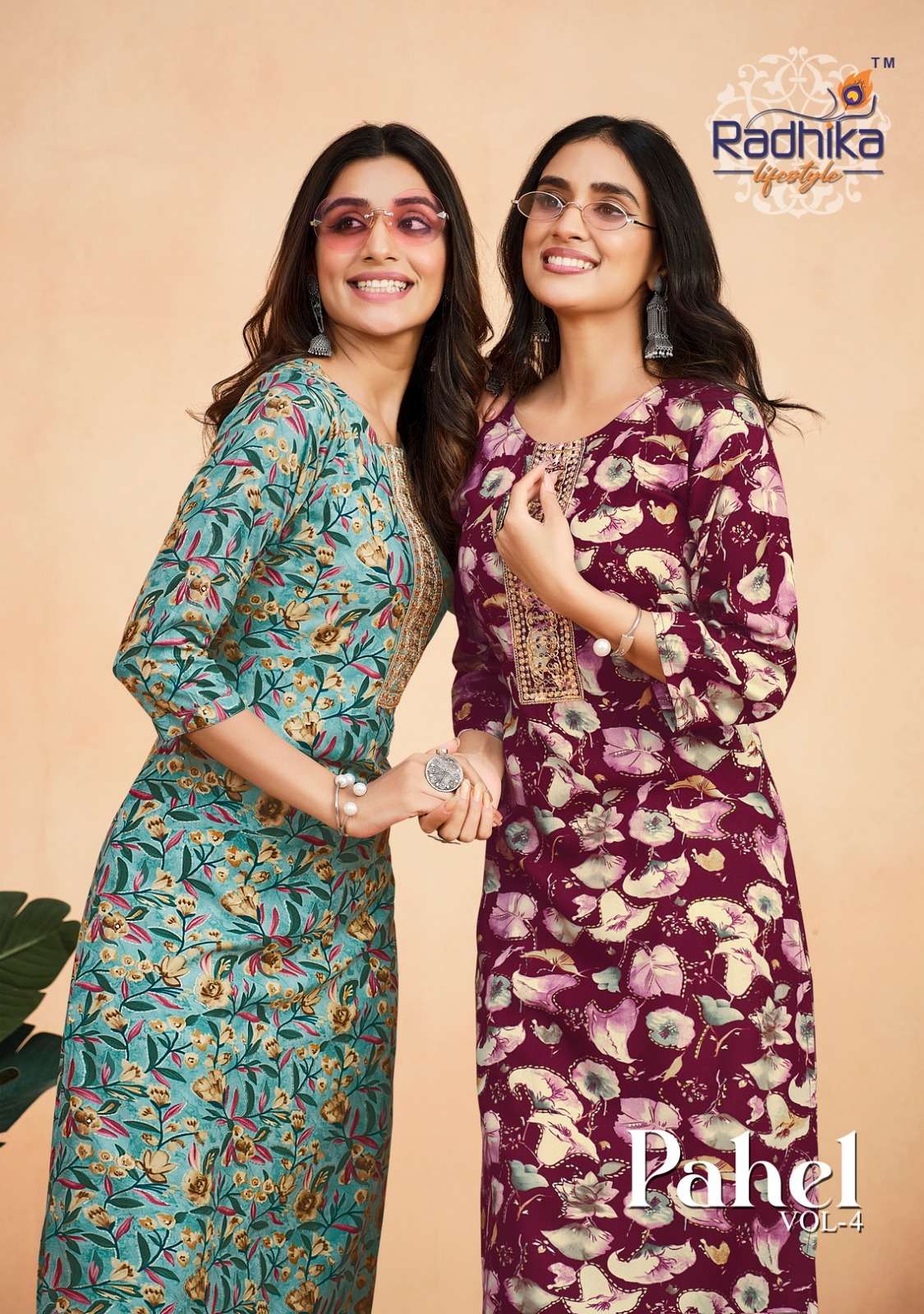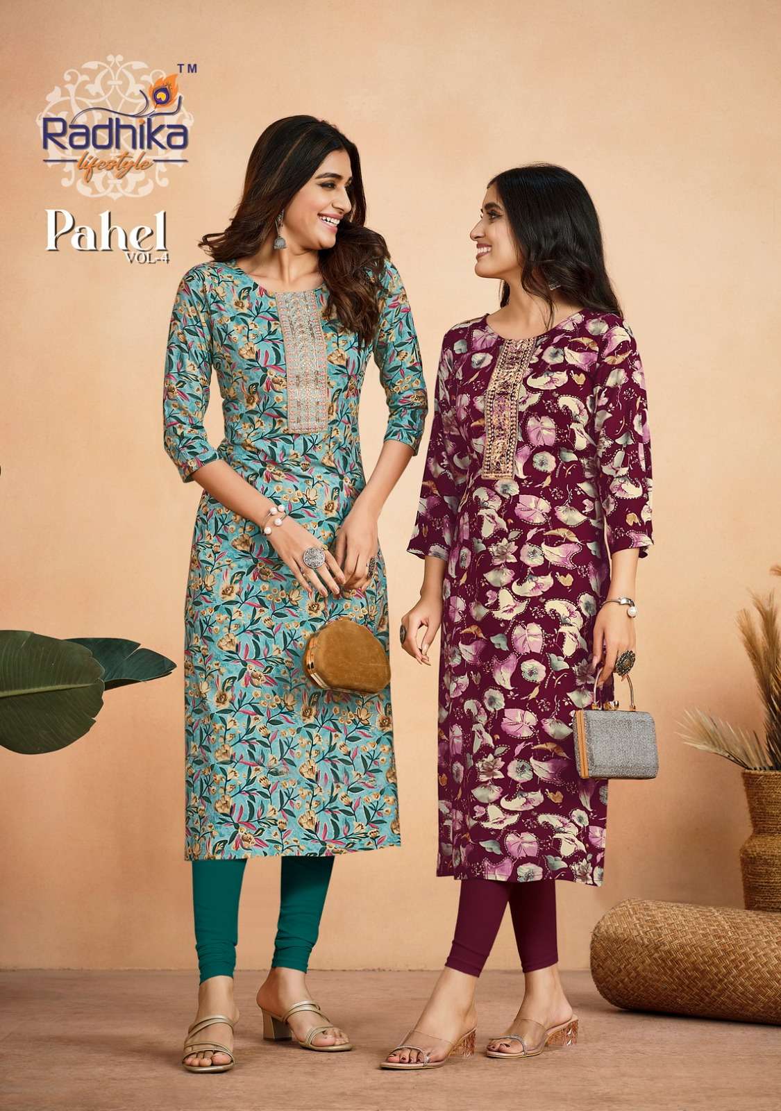 pahel vol 4 by radhika lifestyle fancy rayon print stitch kurtis online supplier