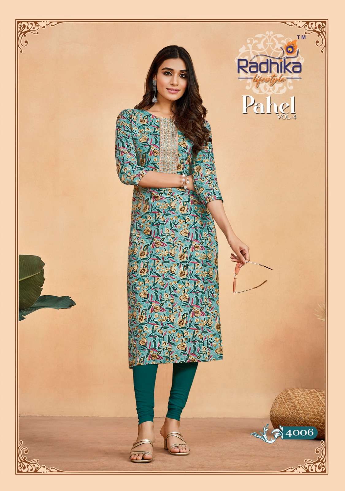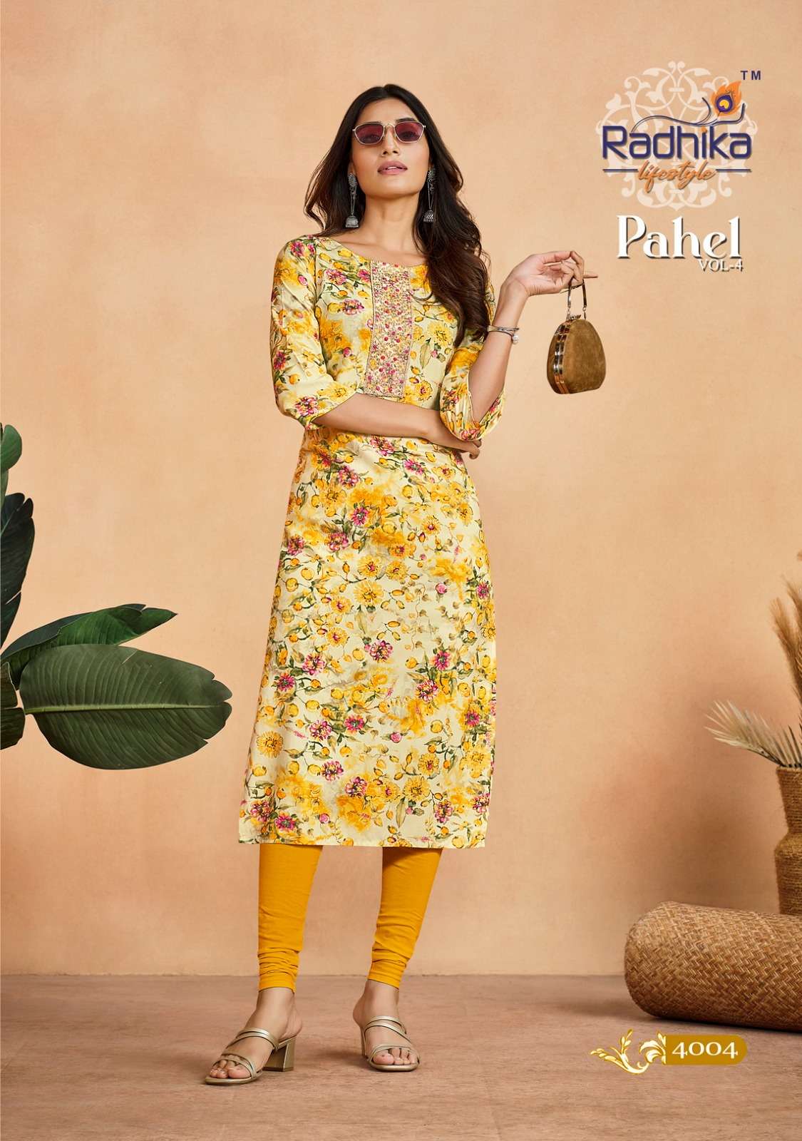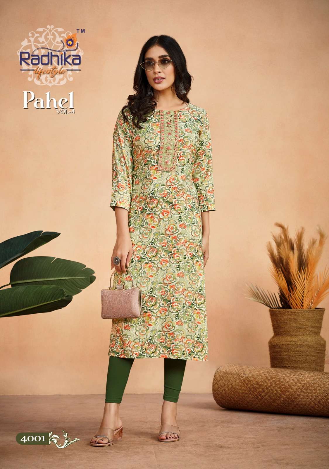 pahel vol 4 by radhika lifestyle fancy rayon print stitch kurtis online supplier