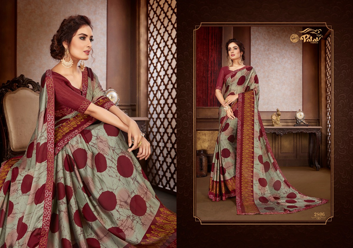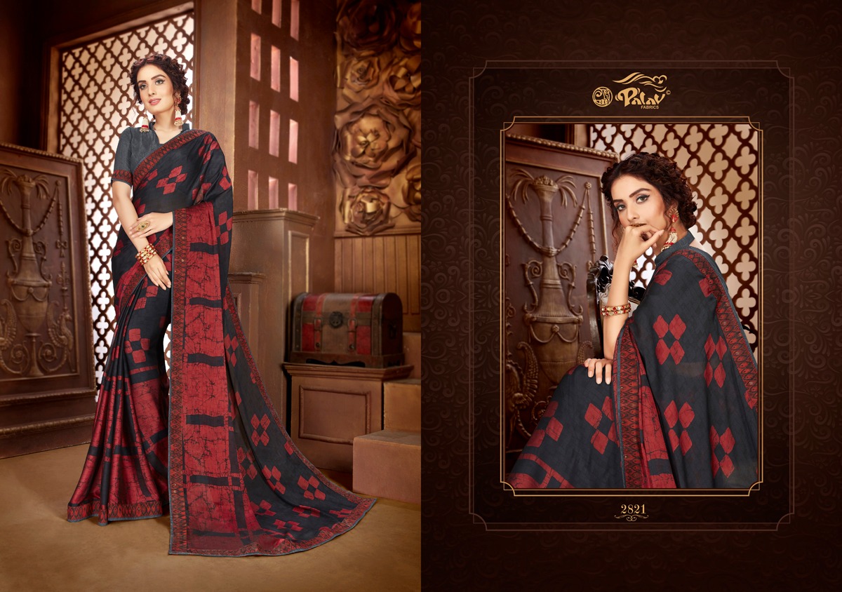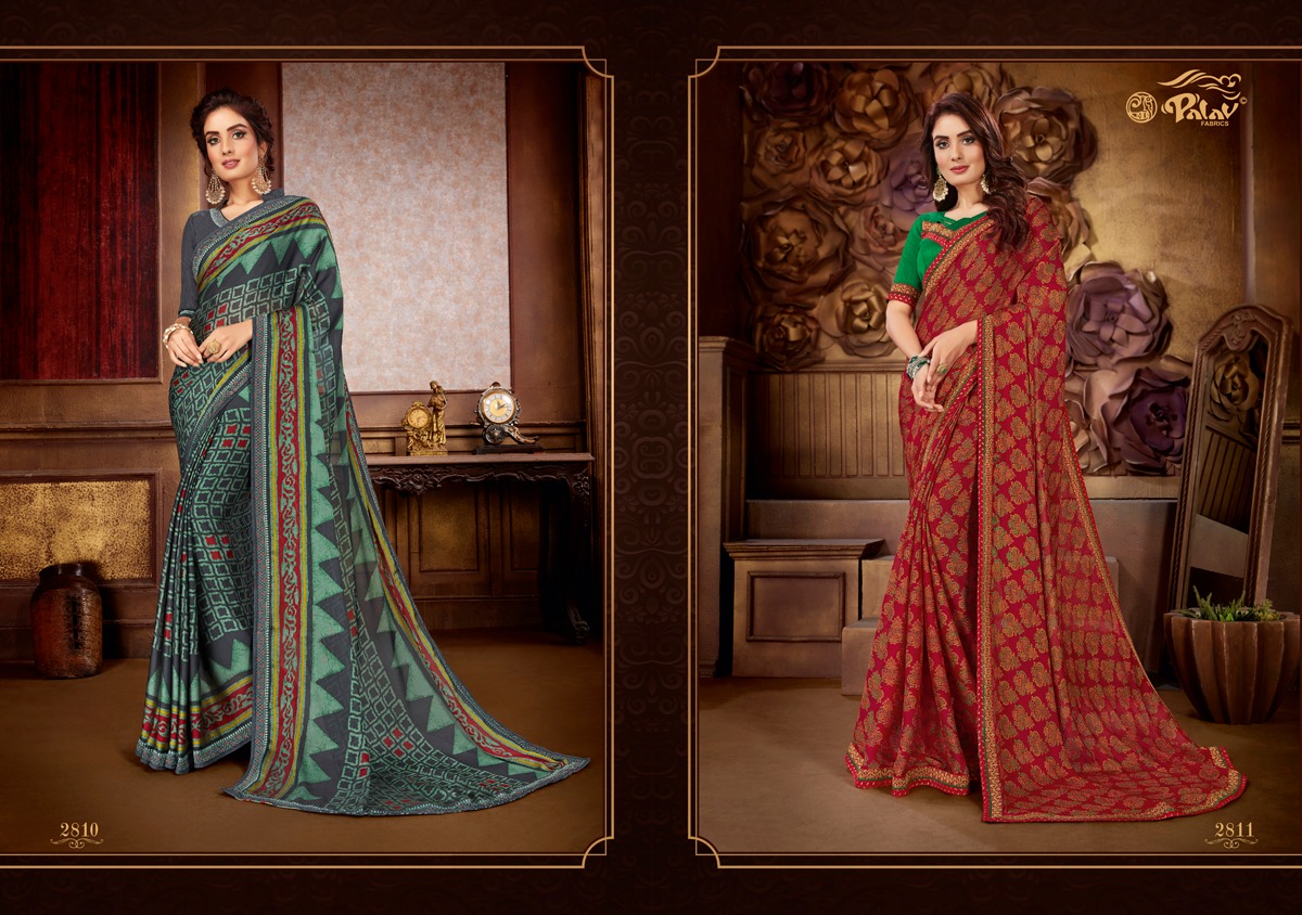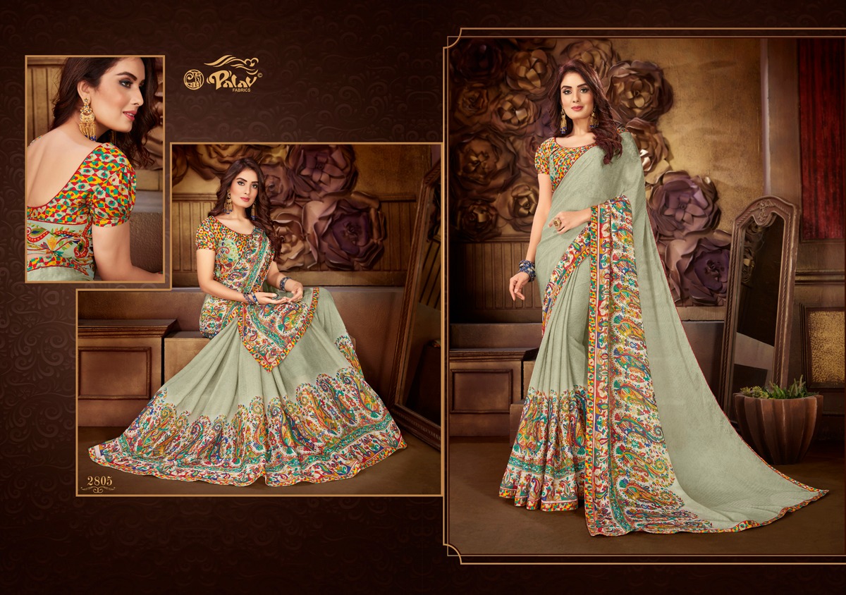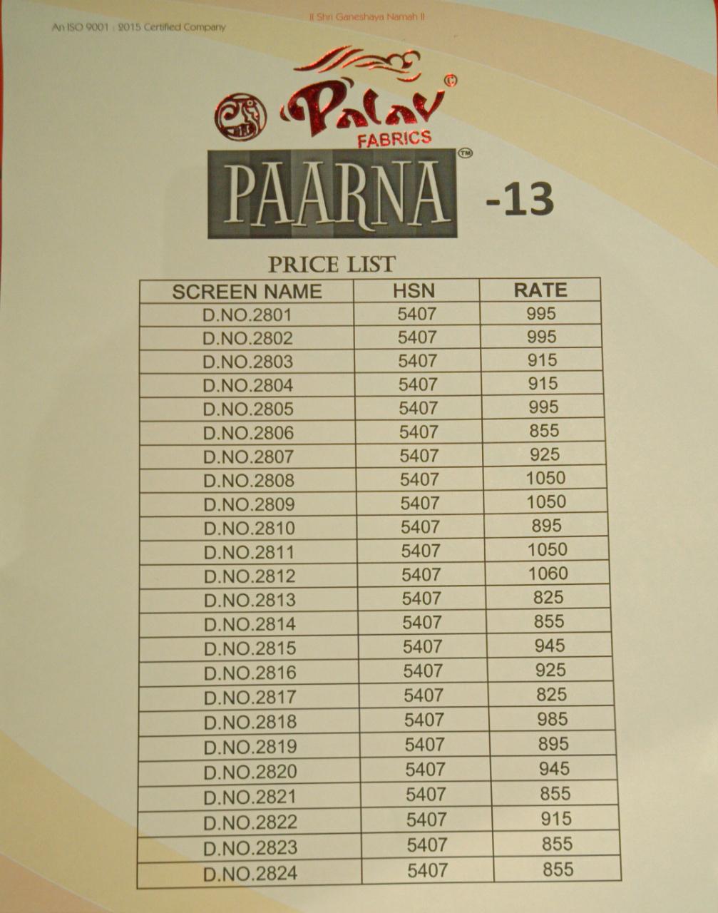 Brand - Palav . Type - saree . Catlog name - PAARNA VOL-13. Series -2801 to 2824. PRICE LIST HAS ATTACHED SET TO SET ONLY GST 5 Percent Extra. Delivery 2 days |
