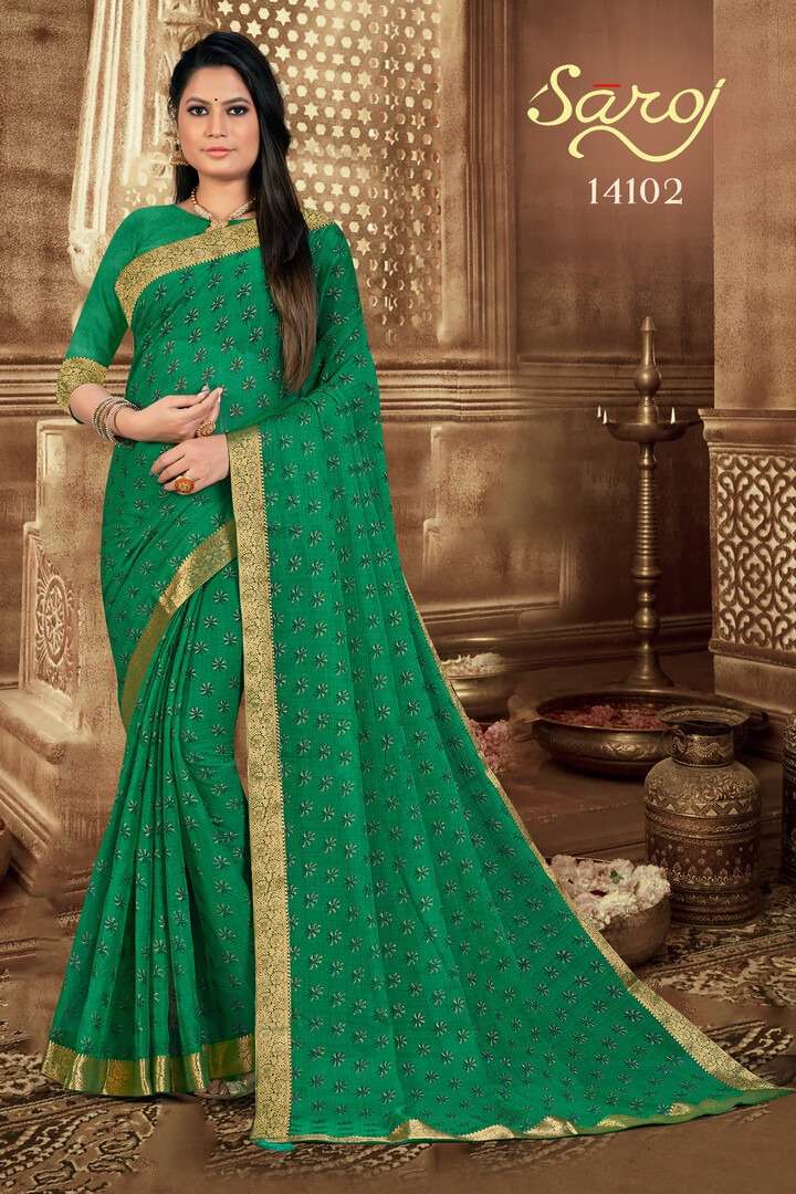 Brand - Saroj Fanric: Sahi Chiffon zari work with fancy border and latkan. |