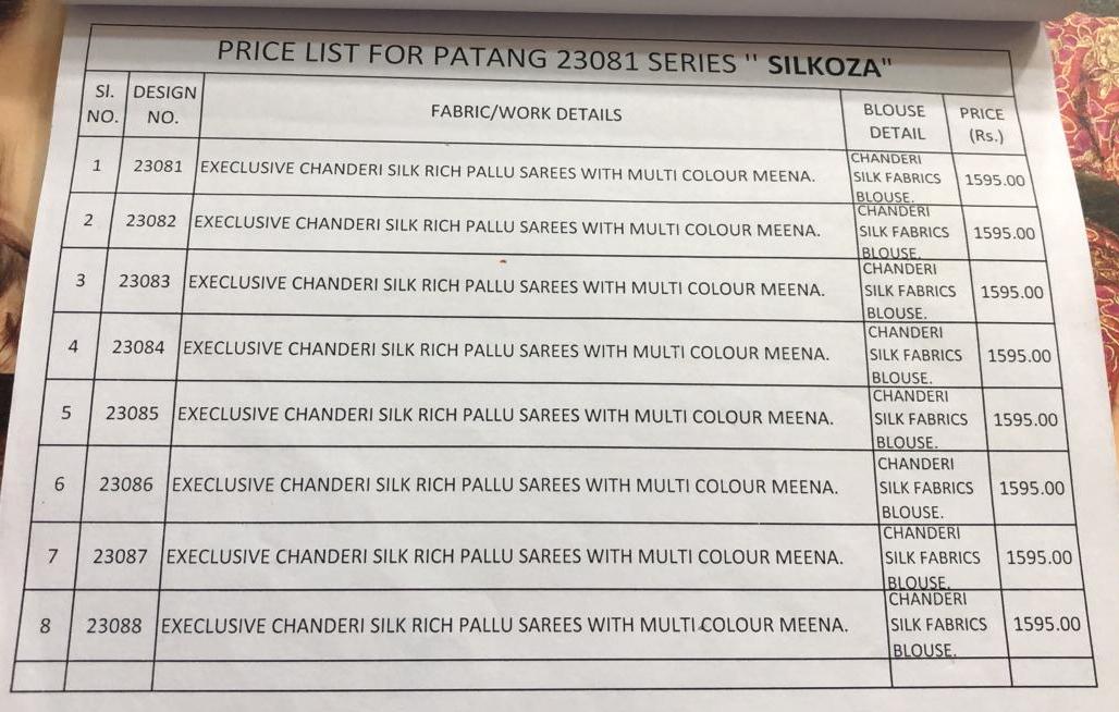 Dear Customer, We are launching our new Saree Catalog Brand – PATANG SAREES . Series ~ 23081-23088 Catalog Name : SILKOZA Fabrics – CHANDERI SILK * Set to set * Rate ~ 1595/- only Pc – 08 GST 5 Percent Extra. Delivery 3-4 days Book your order now . |