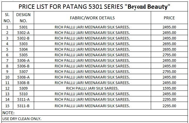 Dear Customer, We are launching our new Saree Catalog Brand – PATANG SAREES . Catalog Name : BEYOND BEAUTY Fabrics – SILK * Set to set * Rate 2475/- only Pc – 15 GST 5 Percent Extra. Delivery 3-4 days Book your order now . |