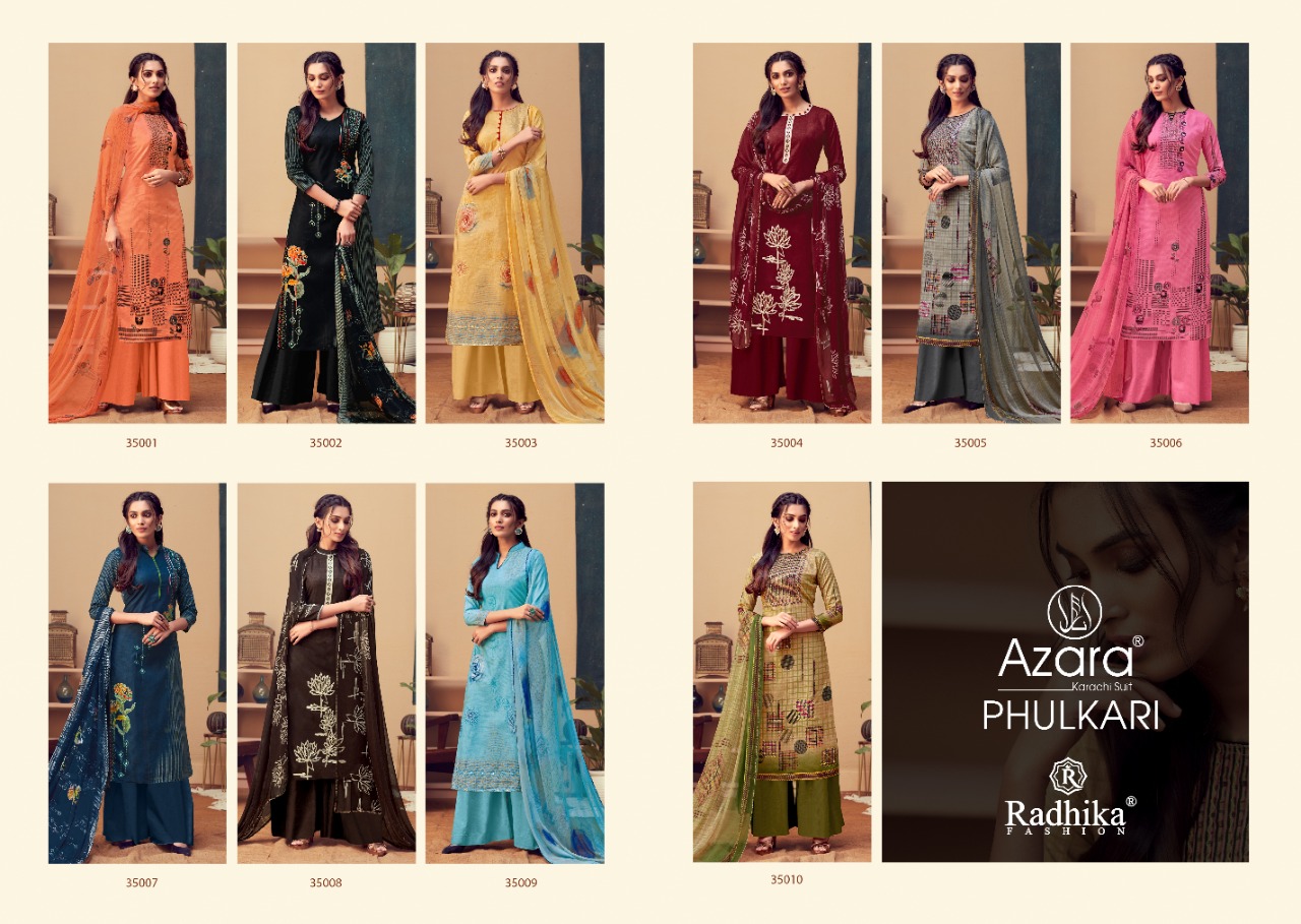 Phulkari Top:- top pure 60*60 camric cotton print with phulkari work Bot:-semiloan cotton dyed Dup:- naznin print dupta with lace 10 Design Catalogue 480+GST Happy selling... Your trust is our capital Radhika fashion |