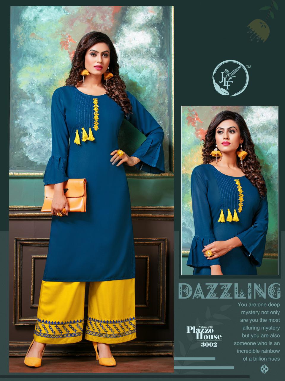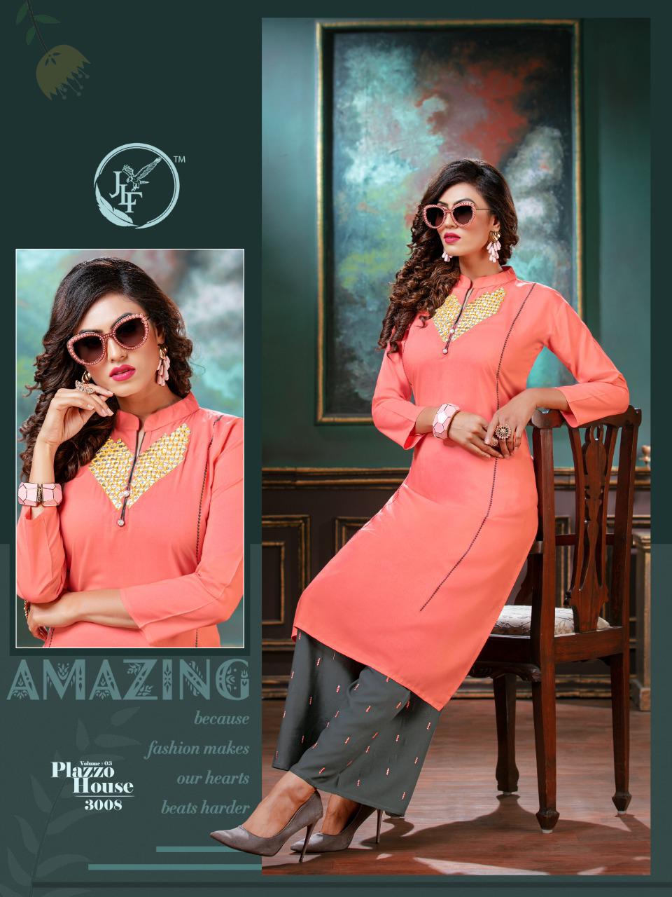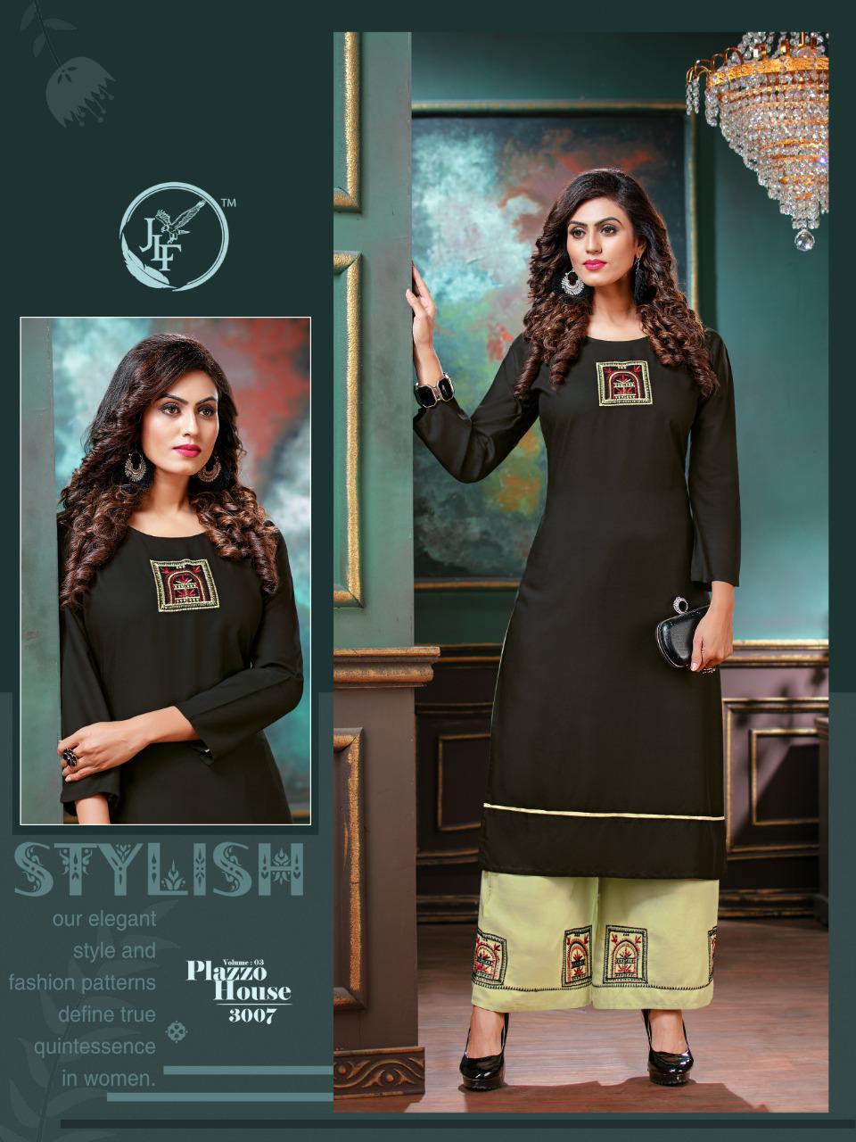 Plazzo House Vol 3 By Jlf Rayon Embroidery Long Kurti With Palazzo Collection