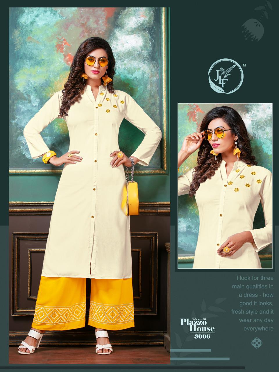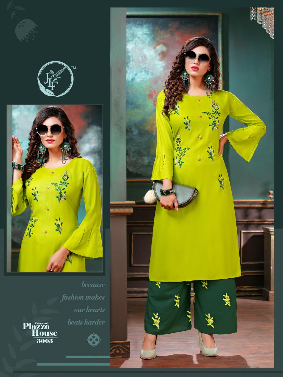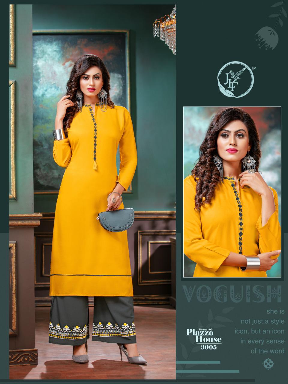 Plazzo House Vol 3 By Jlf Rayon Embroidery Long Kurti With Palazzo Collection