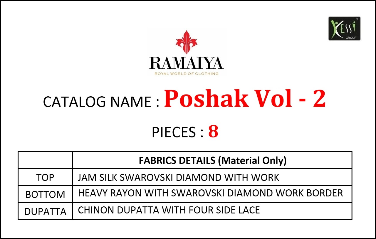 Ramaiya (Kessi Fabrics Pvt. Ltd.) has launched Catalog name : Poshak Vol - 2 Fabric Details âªTop:- JAM SILK SWAROVSKI DIAMOND WITH WORK âªBottom:- HEAVY RAYON WITH SWAROVSKI DIAMOND WORK BORDER âªDupatta:- CHINON DUPATTA WITH FOUR SIDE LACE âªTotal Design :- 8 Rate --799/ â°Dispatching 5 to 6 days later |