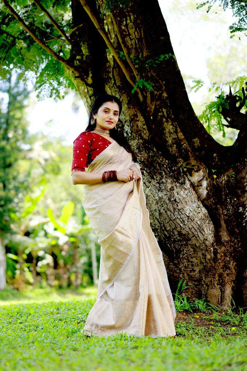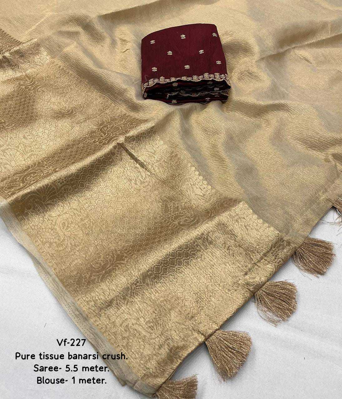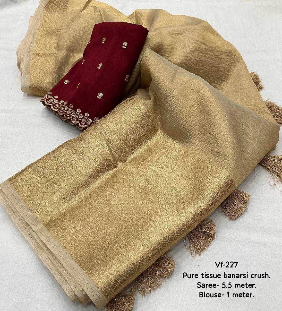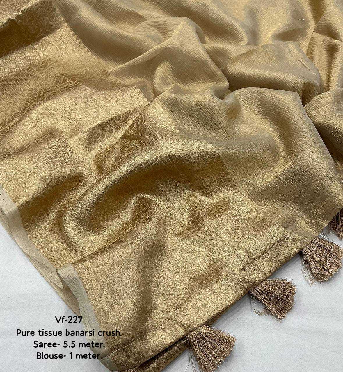 new arrivals New premium crush saree Gold single color edition. KC - 227 (tissue banarsi crush) Quality- pure tissue banarsi crush saree with shiny coating on it. Jacquard zari woven pattu border. Cotton tassles on pallu. Blouse- contrast marron raw silk zari embroidery blouse. Rate - 1350/-* +ship Top premium quality |