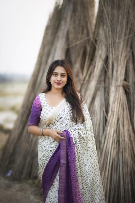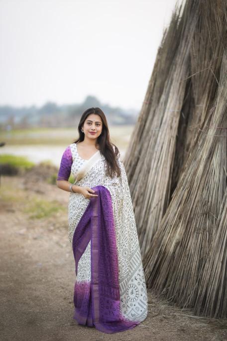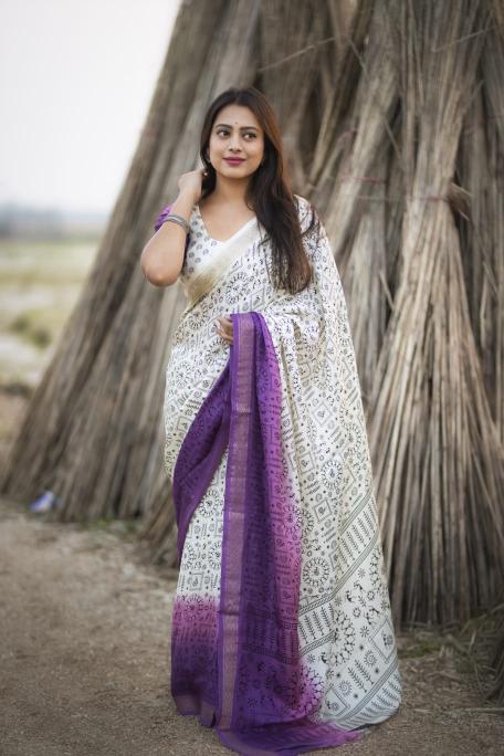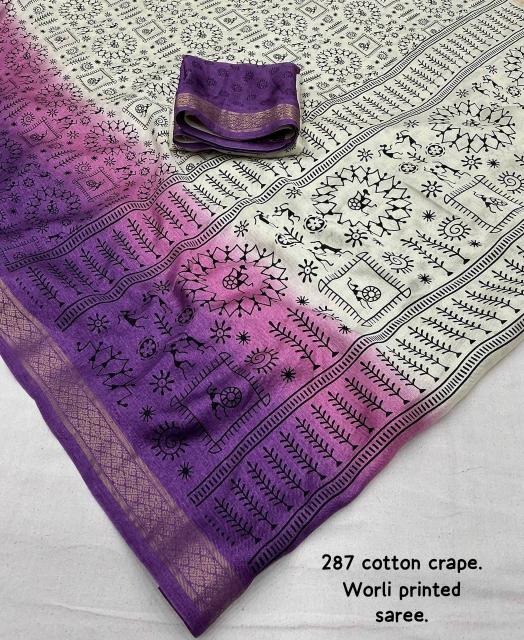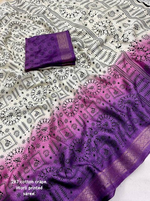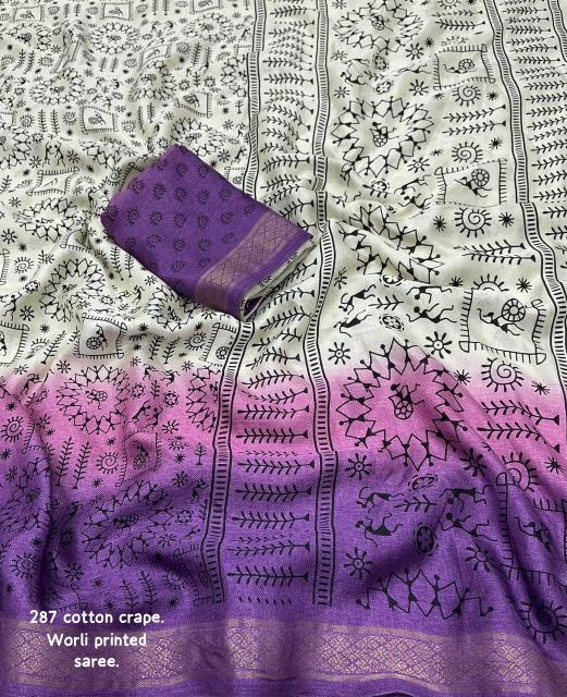 •new arrivals• New fancy worli cotton crape saree. Single color edition. KC- 287 wonderful worli. Soft pashmina silk feels like cotton crape. Zari woven pattu border. Simple off white base color with shaded pink and lavender color on panel. Allover worli prints. Running printed blouse. Rate - 650+ship Top trusted quality |