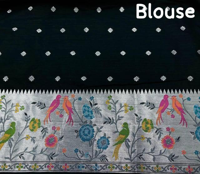 KC- 301 BLACK BANARASI. Black Soft silk saree with silver zari woven butti on body. Patni style weaving design used on border. Same patni style weaving short pallu. Accessoried with cotton tassles. Runing soft silk blouse with zari woven selvees. Rate - 2200+ship Top premium quality |