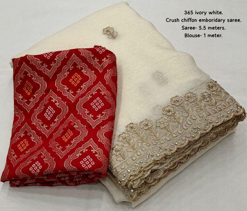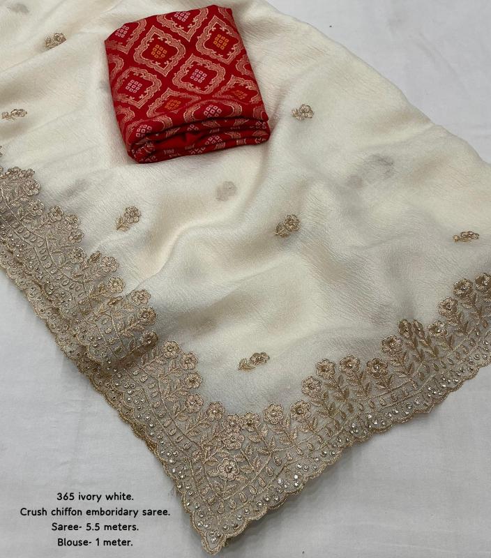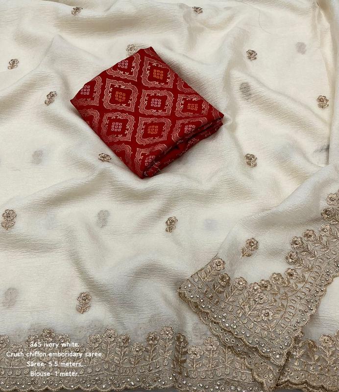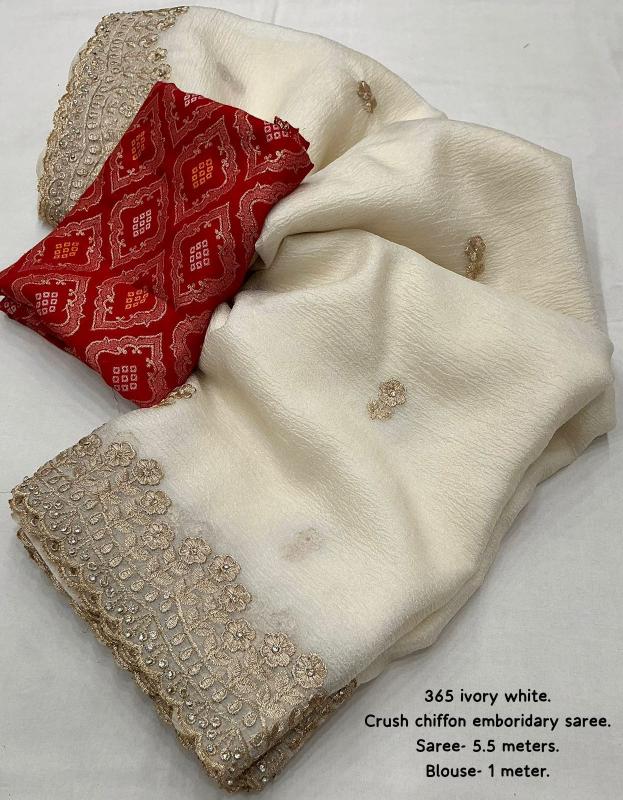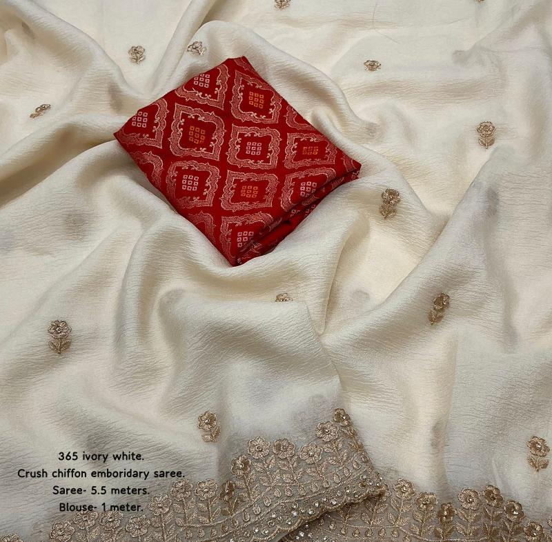 NEW ARRIVALS New fancy off white emboridary saree Single color edition. kc - 365 zari crush. Quality- soft crunchy crush saree with zari emboriday and stone work on it. Blouse- Contrast red color patalo style banarsi zari woven blouse. Rate - 1300+ship. Top premium quality |