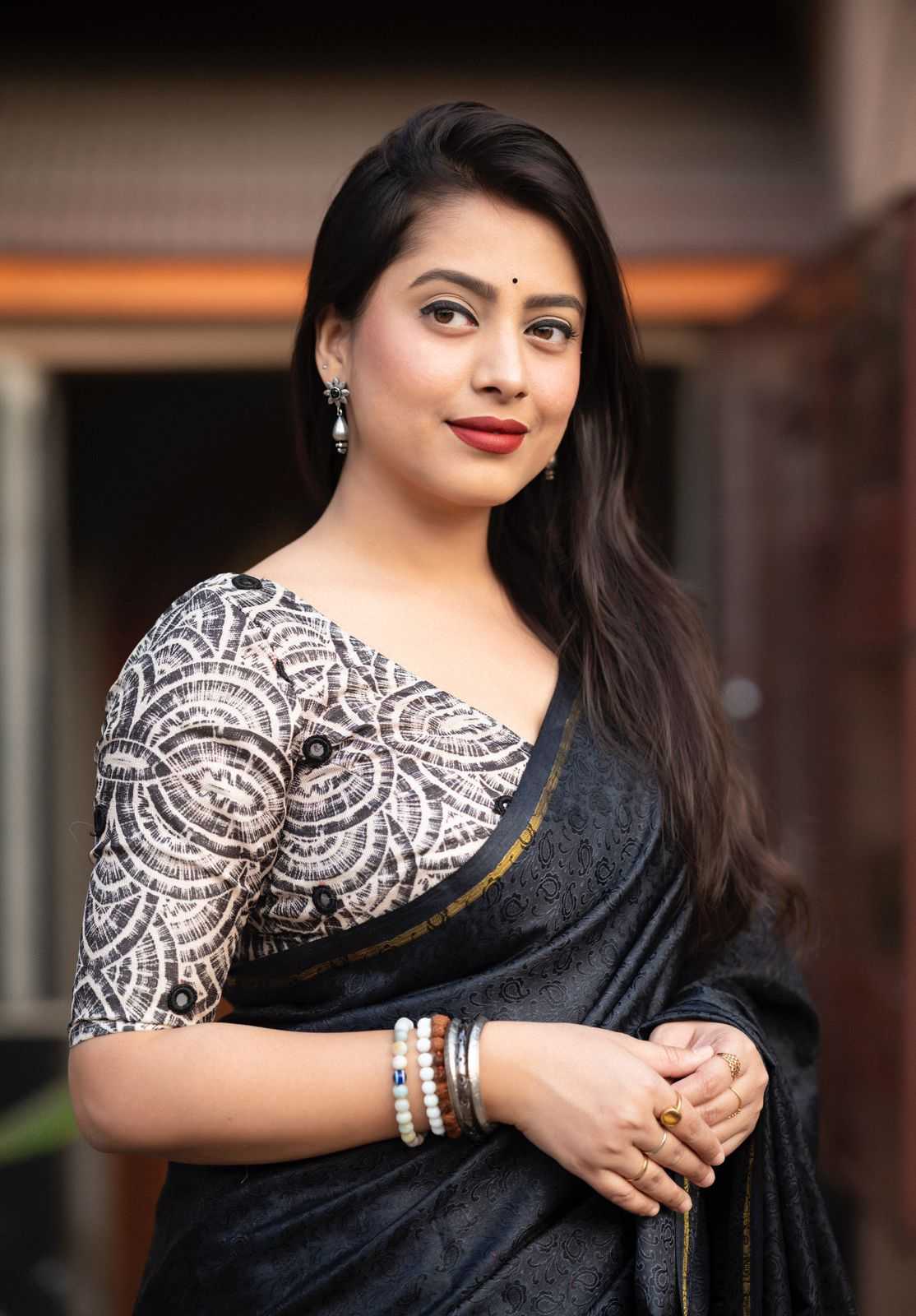 New soft cotton crape saree in black edition. KC- 062 KC- mango crape black. Quality- soft cotton carpe saree with self woven mango design. Cotton tassels on pallu. Blouse- prefect matched peinted jute silk blouse with aari mirror. Rate- 730+ship Top trusted quality |