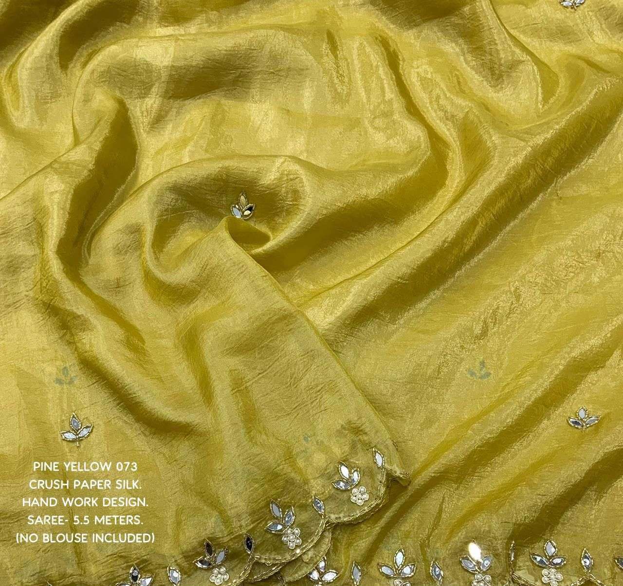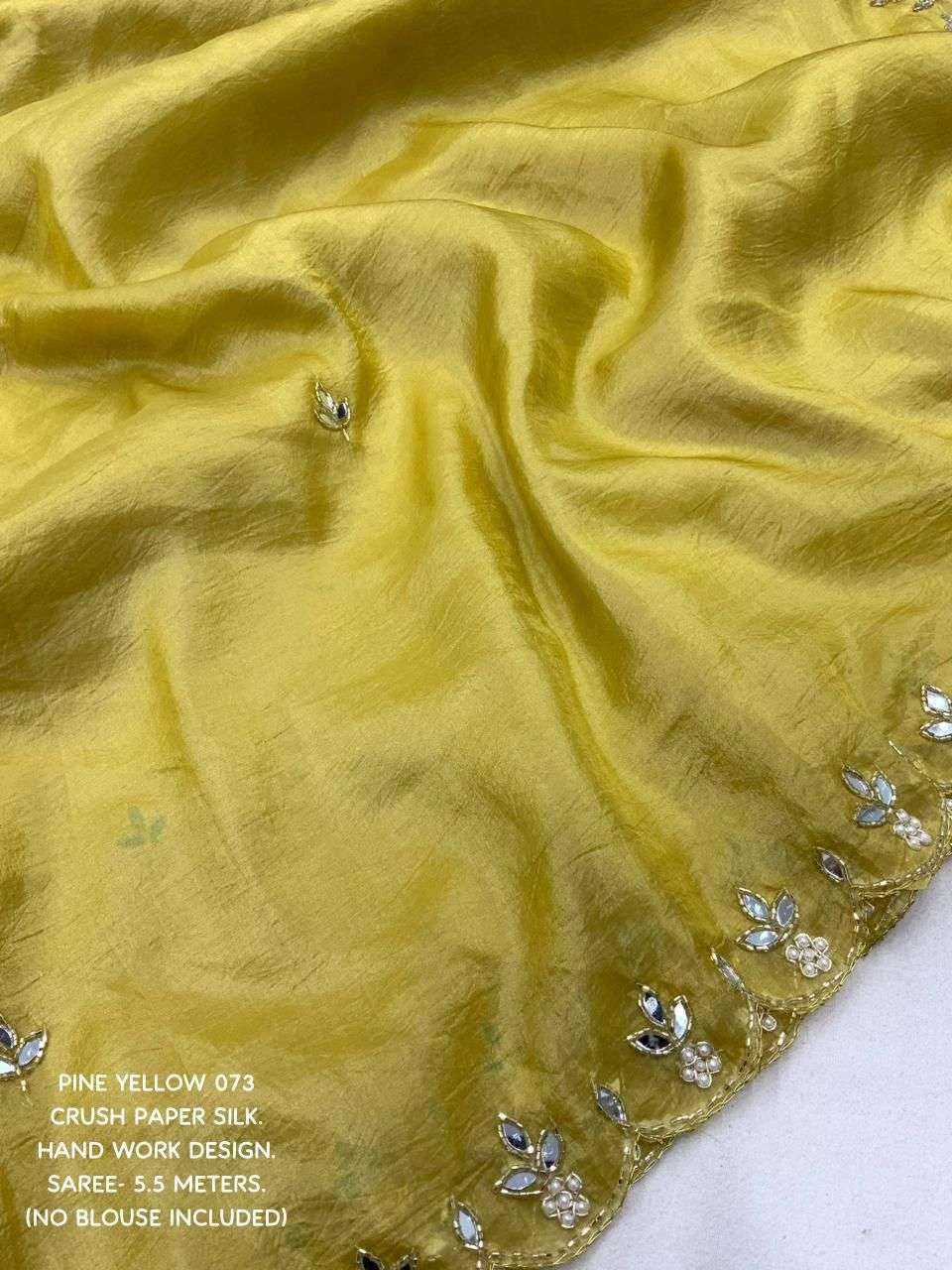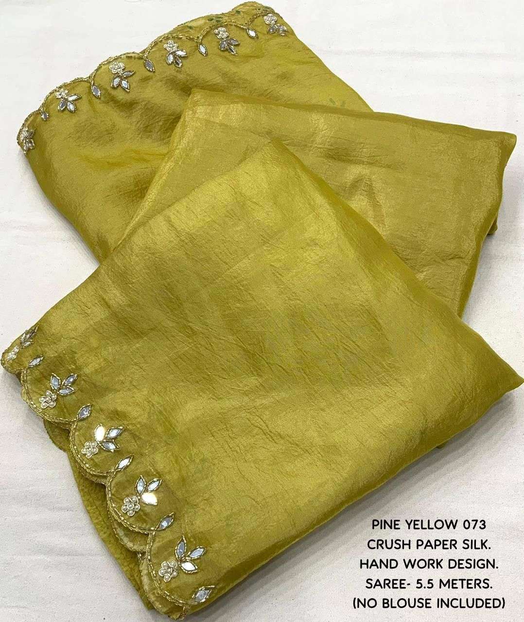 New premium hand work crush saree KC- 086 KC- paper crush. Quality- soft paper silk type woven crush saree. beautiful hand work embroidery c-pallu. No blouse included. Rate - 2050+ship