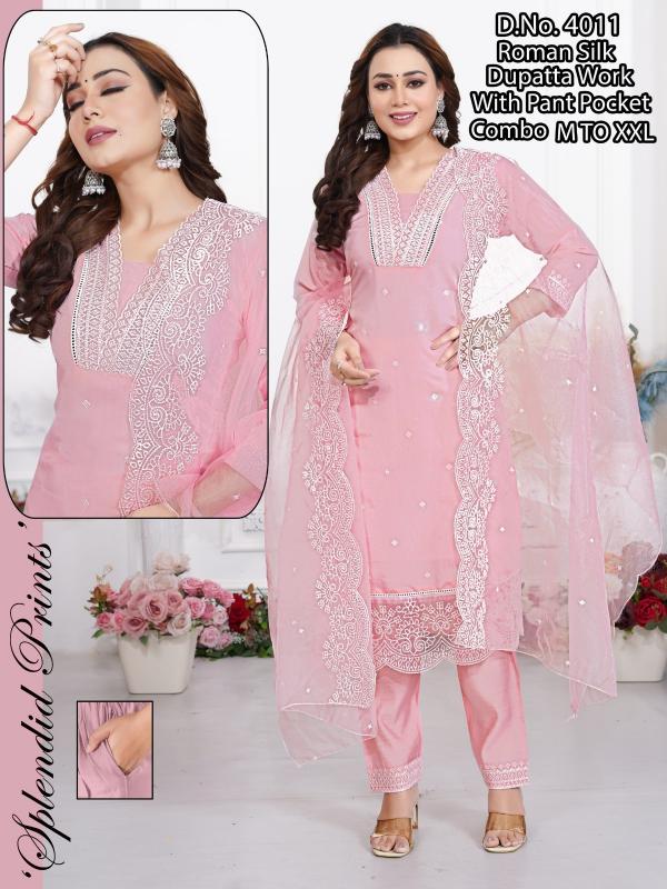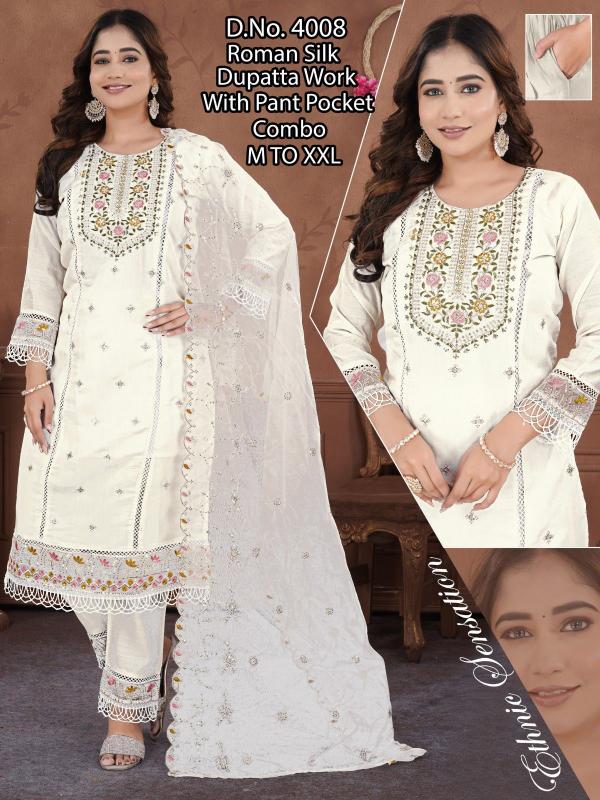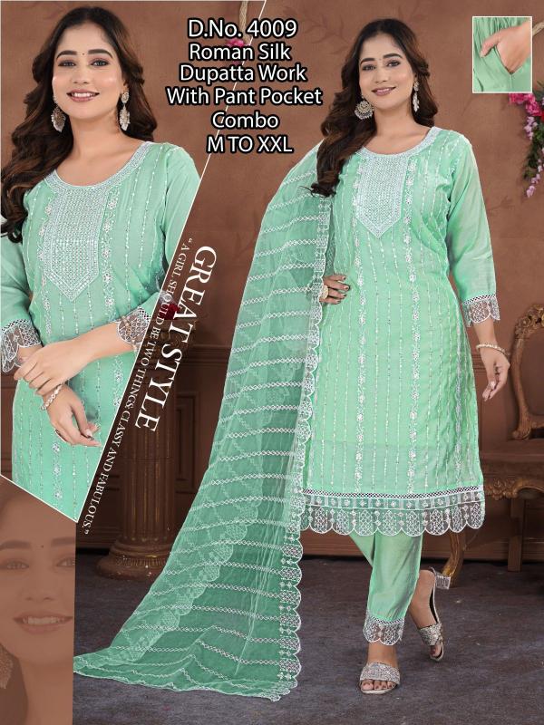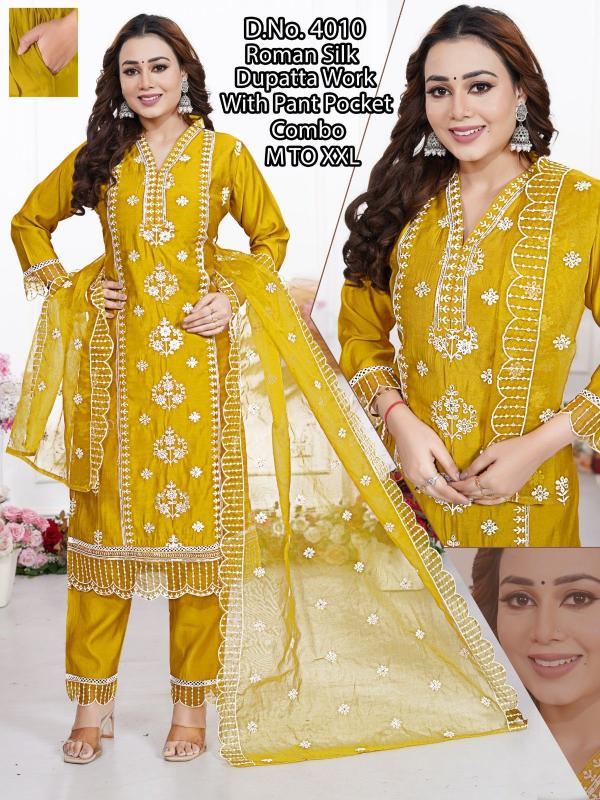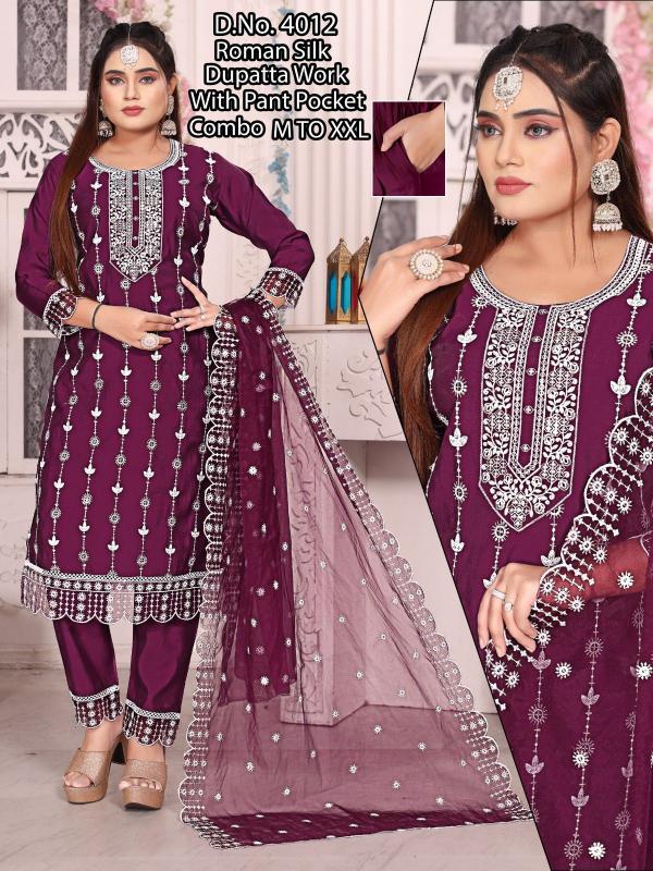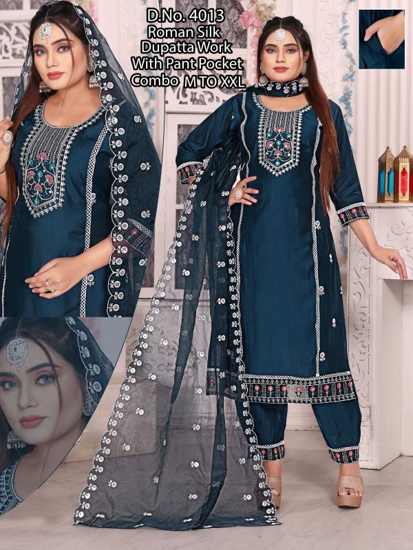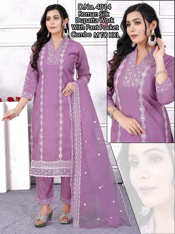 pr roman silk embroidery work full stitch party wear combo suits for women