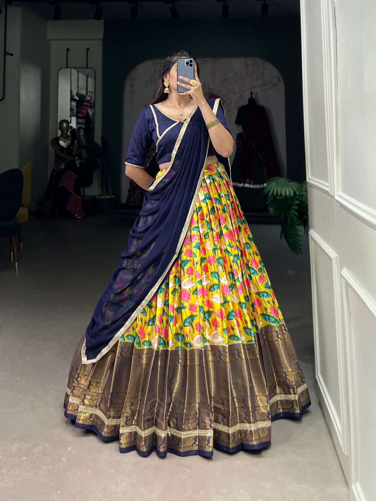 🌷Lehenga Choli🌷 Adorn yourself with the artistry of Pichwai and the shimmer of zari. This lehenga choli is a celebration of tradition and elegance 🌺 #FestiveWear #CulturalChic Catalogue : SIRISHA LNB1024RBL Lehenga(Stitched) Blouse(Unstitched) Dupatta Weight : 1 kg |