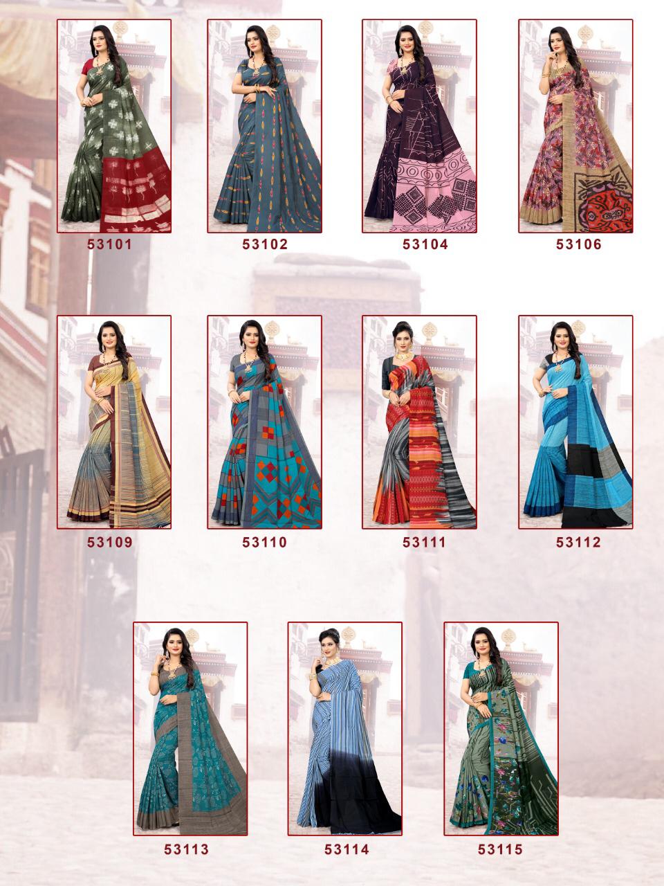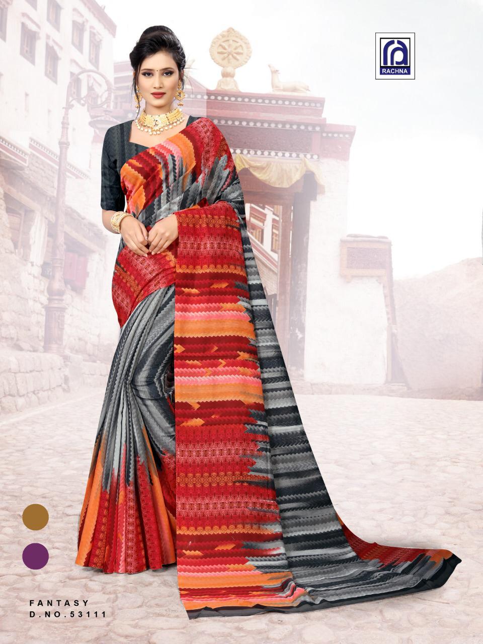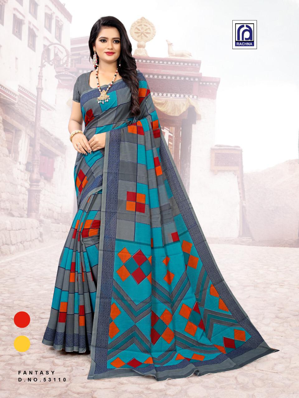 Brand - Rachna . New designer Saree " Fantasy" Catalogue 11 pc Series - 53101 to 53115 Size :- 5.50m + 0.80 Fabric :- Cotton Price :-545 /-Per Piece |