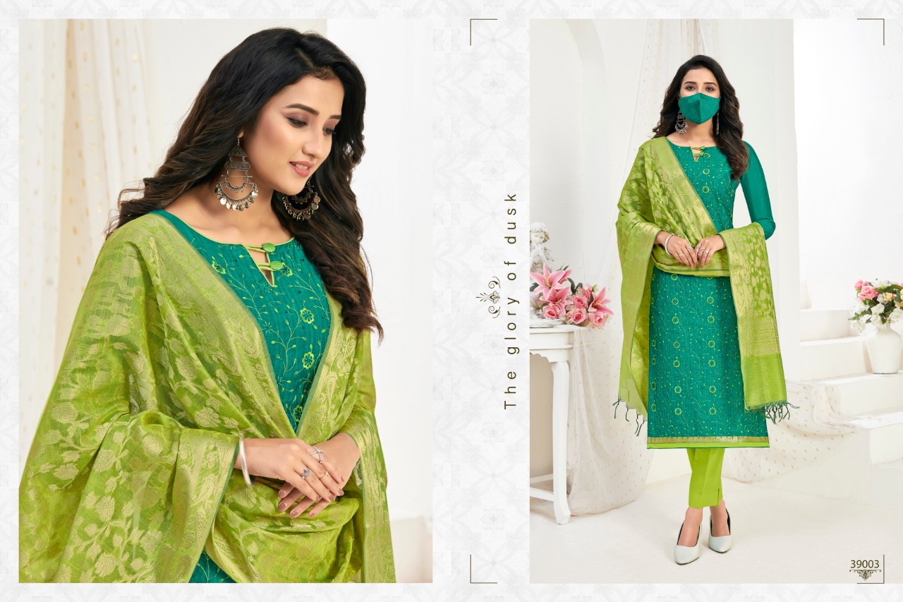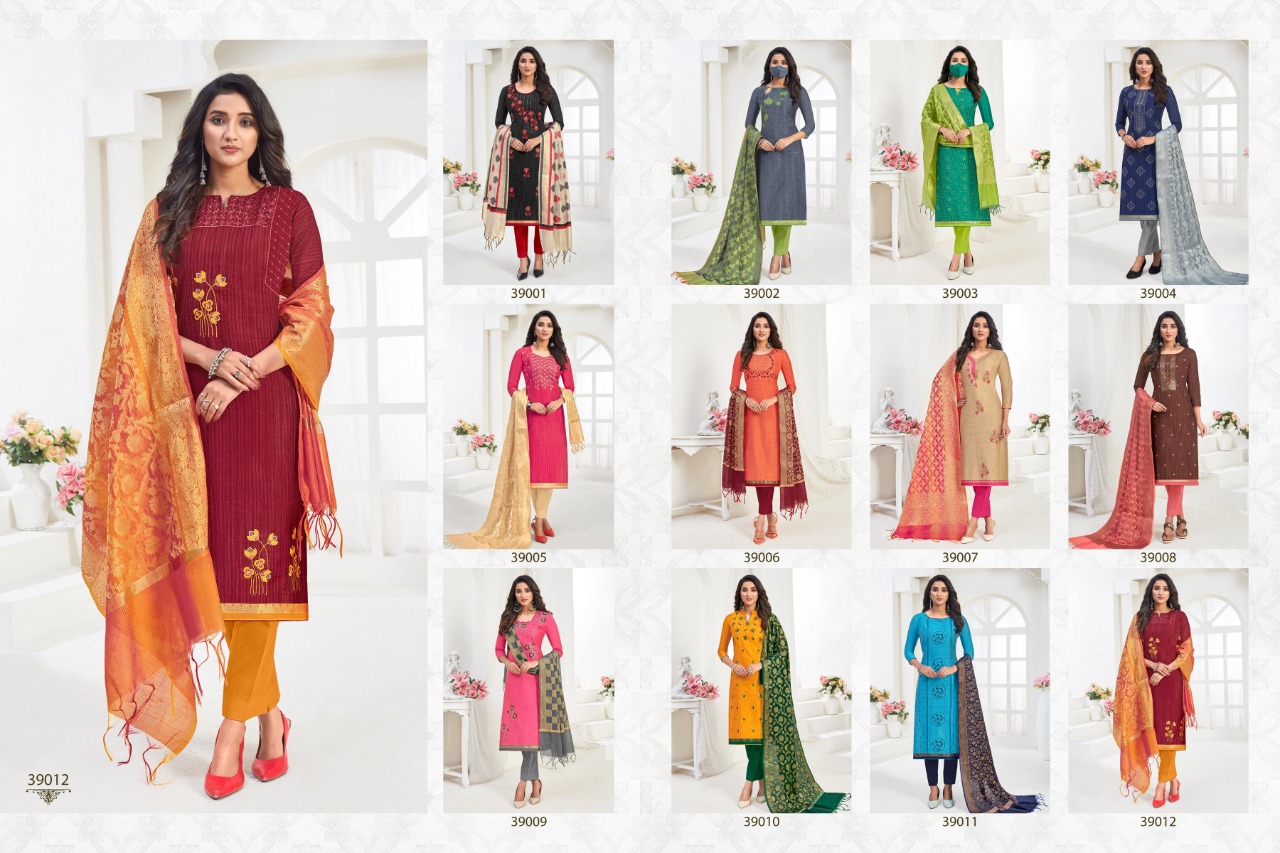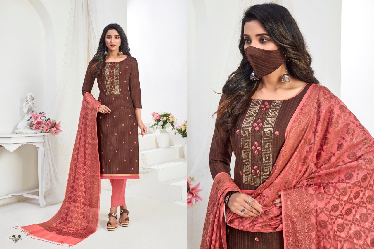 NYKAA Vol-2 (WITH MASK) - A exclusive embroidery work and fancy banaras jecord dupatta range. Top: South Cotton Self Stripes With embroidery work, Cut-2.40 mts approx. Dupatta: Exclusive Banaras Jacquard Dupatta, Cut-2.30 mts approx. Bottom: Cotton Cut-2.50 mts approx. Rate- 731 per pcs . Set to set. GST 5 Percent Extra. Delivery from tomorrow Total Suit cut-7.20mts approx Regards, Raghav Royals |