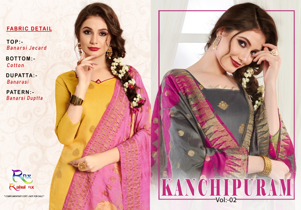 BRAND RNX RAHUL NX We Are Launch Our New Catloge KANCHIPURAM VOL - 2 ------------- Please find the details belowâ¬Ââ¬Ââ¬Â⬠Top - banarashi Bottom - Cotton , Dupatta *banarsi DESIGN. 8⣠RATE 4â£5â£1⣠â Special banarasi top dupata â ------------------------- ⬠Wednesday 4/12/19 ⬠NOTE SMALL CATLOK ONLY 8⣠PIECES |