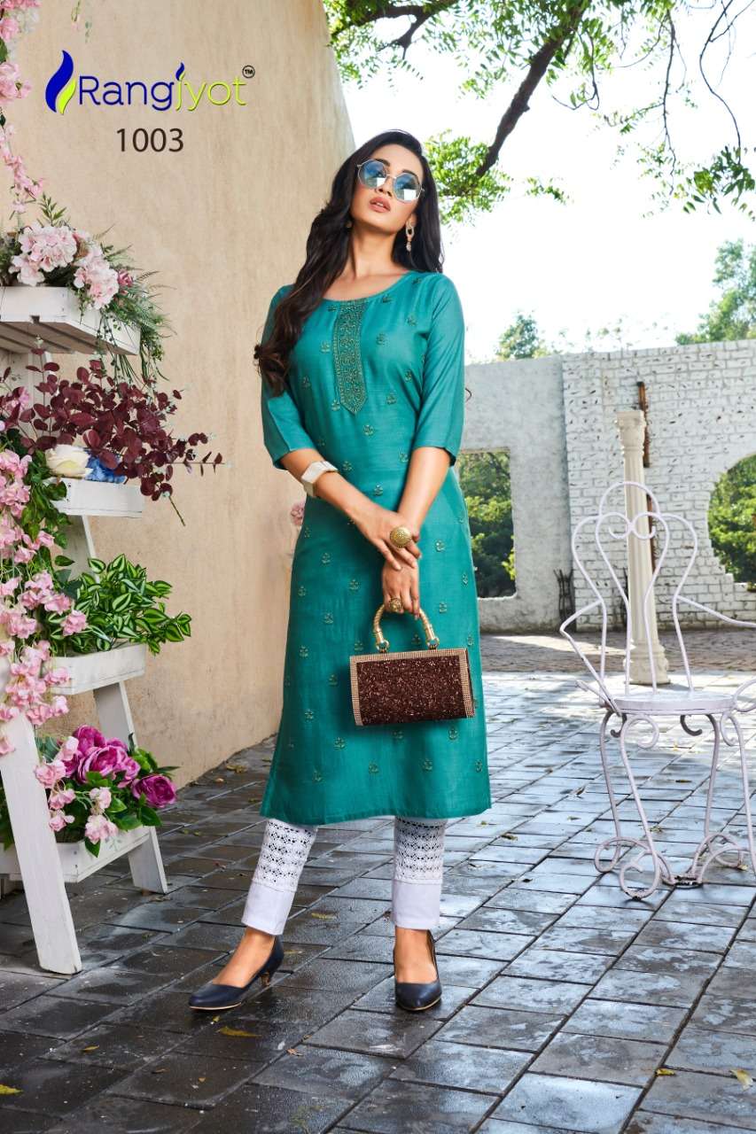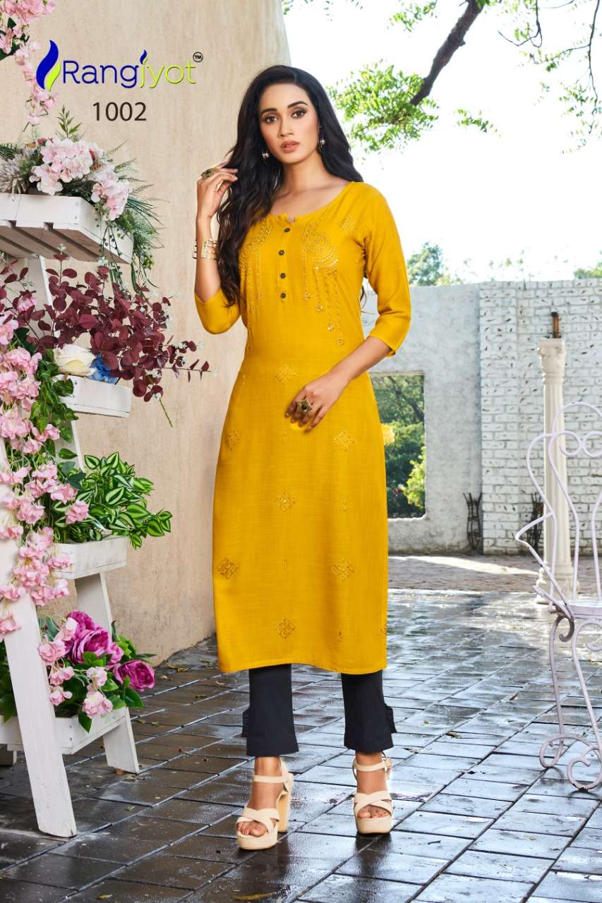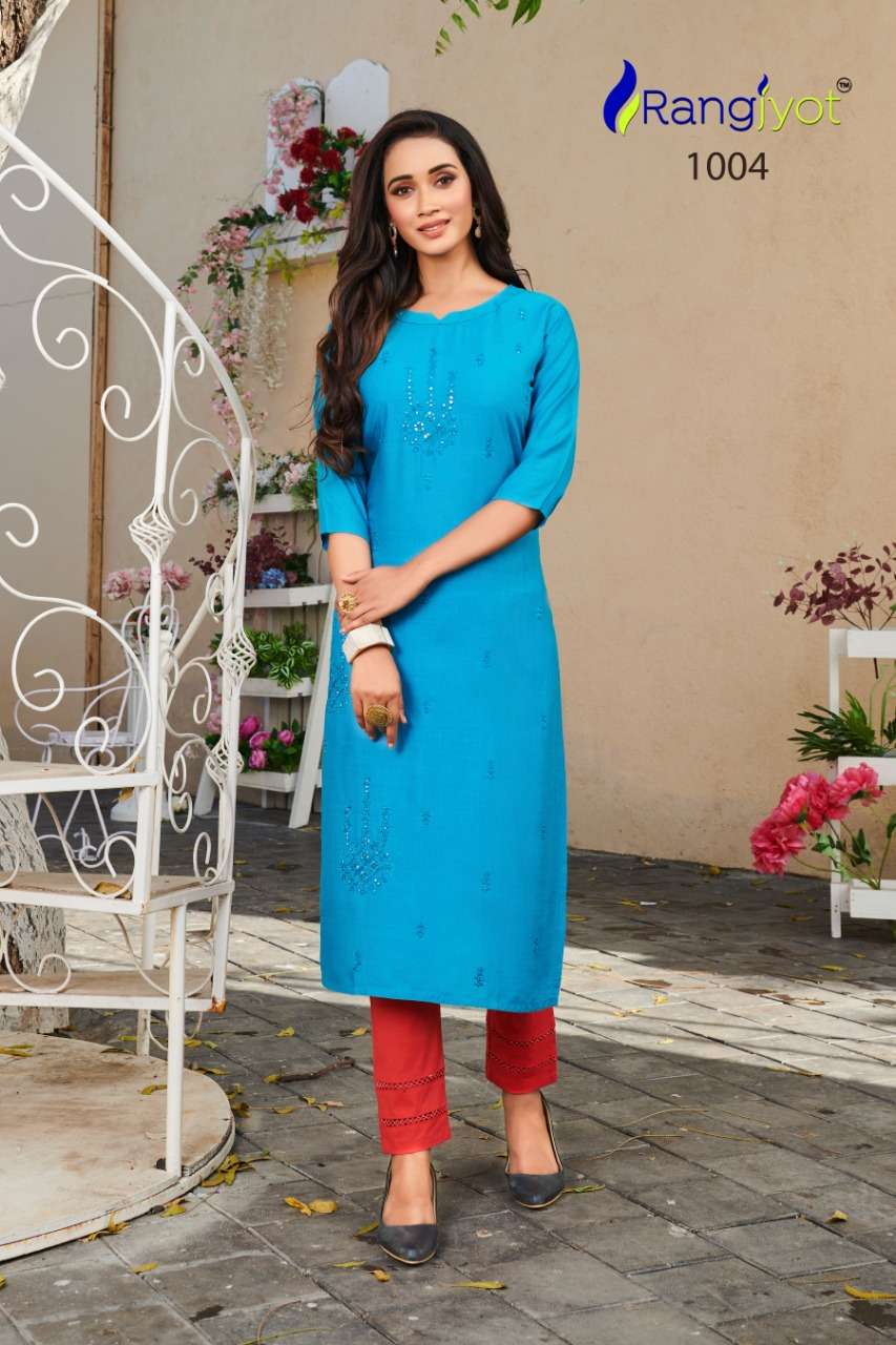 RANG JYOT 𝐓𝐡𝐞 𝐤𝐮𝐫𝐭𝐢𝐬 𝐨𝐟 𝐛𝐞𝐬𝐭 𝐩𝐫𝐢𝐜𝐞𝐬 𝐰𝐢𝐭𝐡 𝐩𝐫𝐞𝐦𝐢𝐮𝐦 𝐪𝐮𝐚𝐥𝐢𝐭𝐲 𝐜𝐥𝐨𝐭𝐡 𝐚𝐧𝐝 𝐬𝐭𝐢𝐭𝐜𝐡𝐢𝐧𝐠. 💫 Catlouge Name :- Manjula Vol-1 Matching style and class with luxury and comfort...! 6 Colour Beautiful design and concept 🎏 Design :- 6 Pis. 👗 Top : 14kg Rayon Slub With Sequence Work... 👖 PENT : Rayon Lycra With gotta patti Less Size :- M, L, XL, XXL, 3XL Rate :- 585/- + 5% GST |