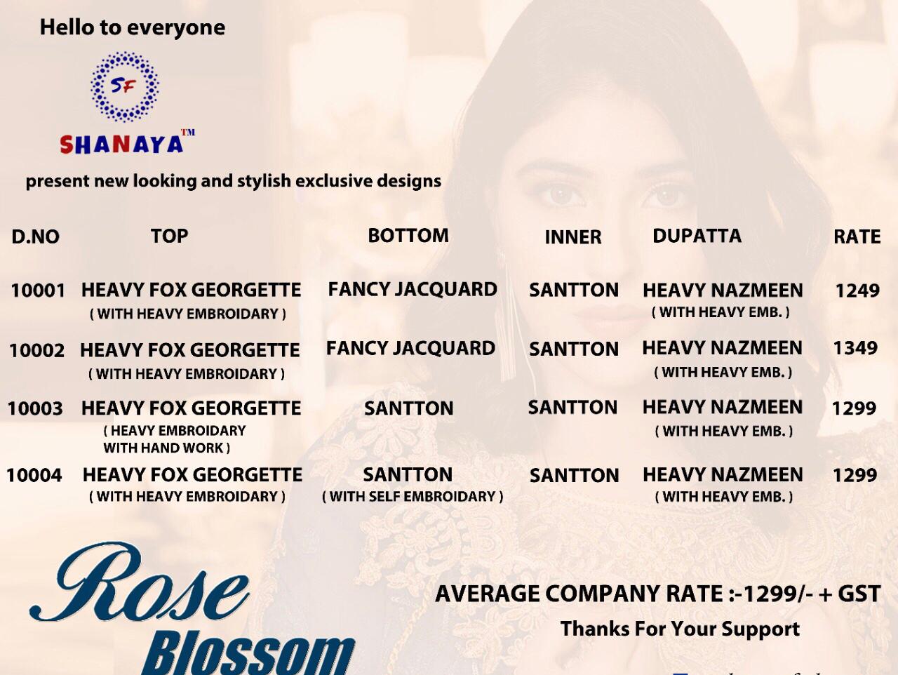 ROSE BLOSSOM Series -10001 to 10004 Fabric details Top : FOX GORGEETE ( Heavy Embroidery) Bottom : SANTOON /FANCY JECQUARD INNER- SANTOON Dupatta : HEAVY NAZMEEN (Havay Embroidery) Price : 1299/-+ GST 4⃣Pic Catalog Hurry up... VEERY LIMITED STOCK pre booking only book your order fast Limited stock â• Additional Fancy Lesses & Handwork dispatch starts 4-5 days Regards SHANAYA FASHION |