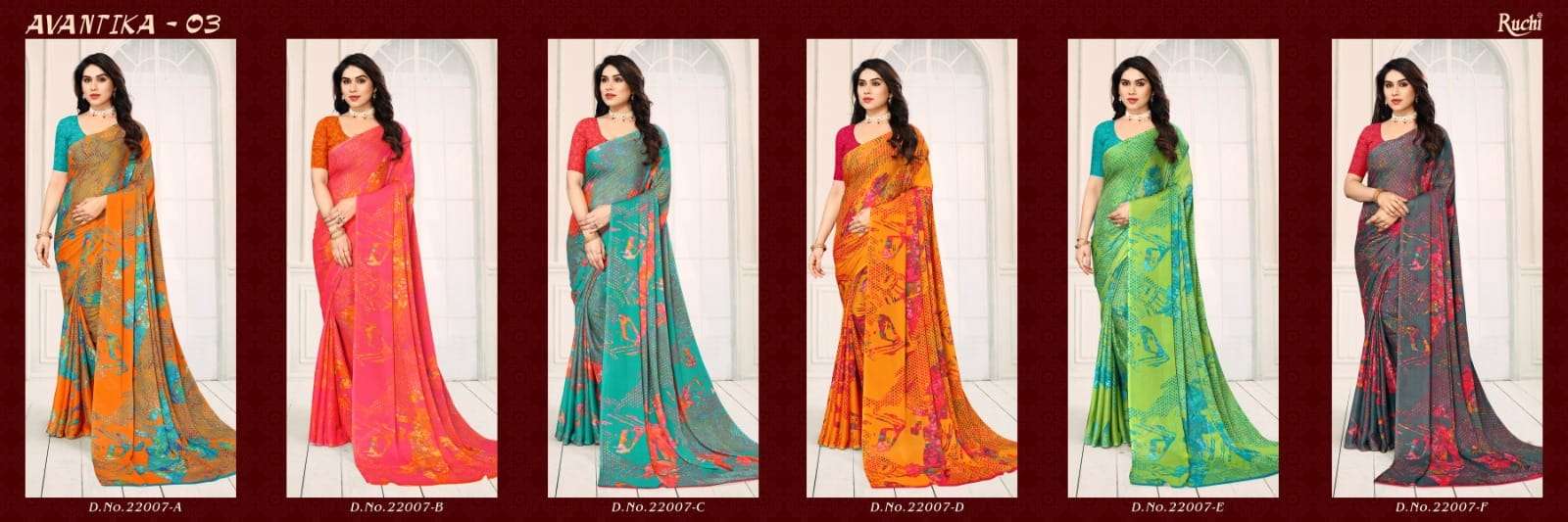 RUCHI SAREES CATALOG - AVANTIKA -3. FABRIC - SILK GEORGETTE. PCS. - 06. WEIGHT - 450 GRAMS APPROX. |