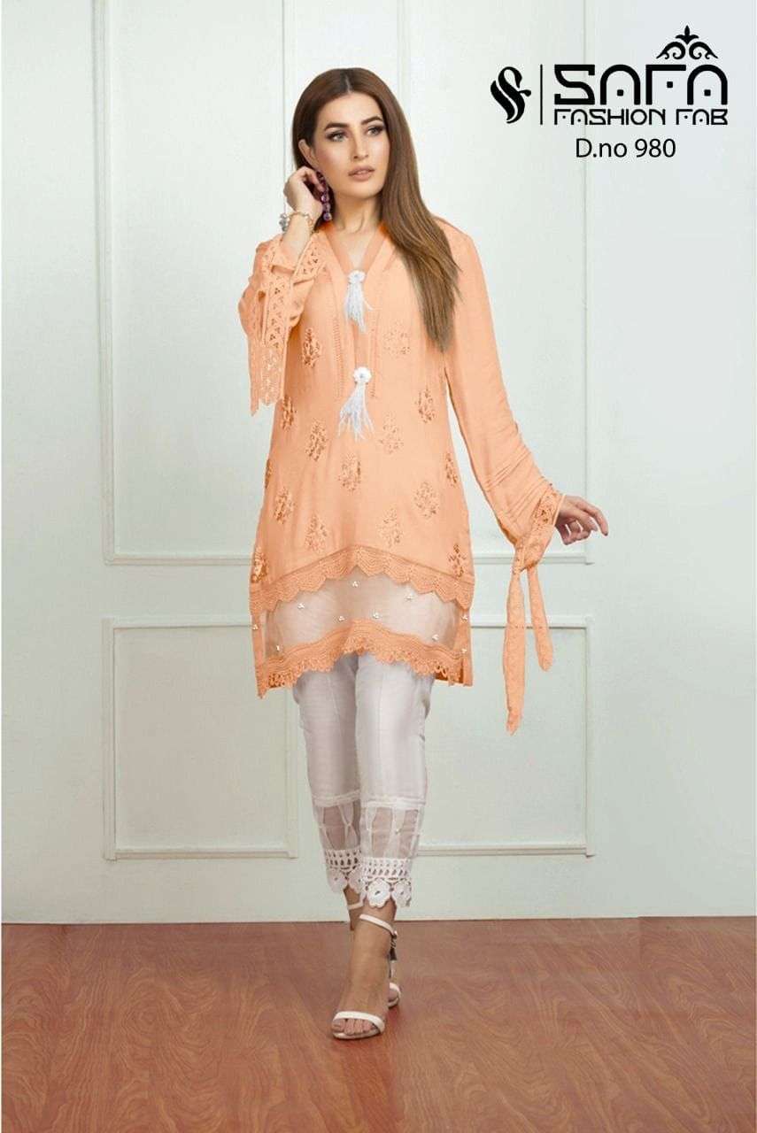 Safa fashion Fab     (D.no =980) We are Introducing our LUXURY PRET FORMAL WEAR  COLLECTION To Make You Unique and Classy.. With Supirier Quality and Affordable Price  S.F.980 by SAFA FASHION  FAB Description  Designer Embroidered Tunic with Sleeves paired with Designer Cigarette pants*With  *Designer Duptta Details Top:-PureGeorgette Fabric Bottom :- Cotton Stretchable Fabric Inner:- Pure Sentoon Colour  Pink.vilot.orange        Size Chart Top xl size chest (42) Bottom xl size (38) Rate 1050/- Full set available      Colour may slightly vary due to light effect Book Fast Limited Stock        Ready To Ship |