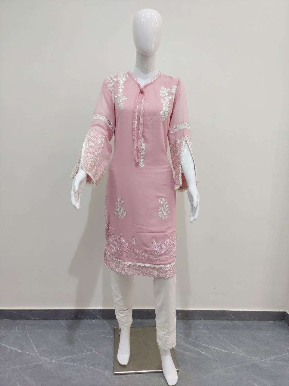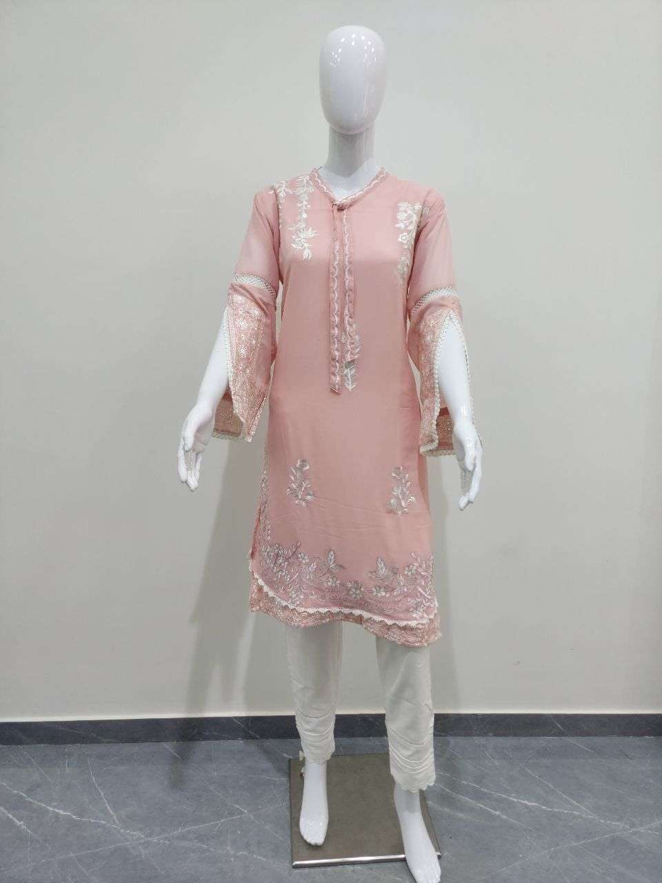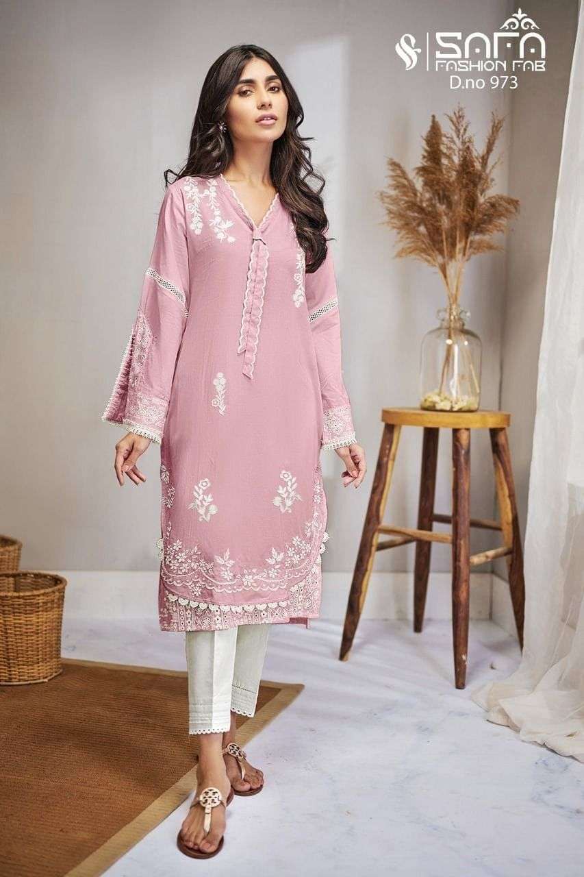Safa fashion fab     (D.no=973) We are Introducing our LUXURY PRET FORMAL WEAR  COLLECTION To Make You Unique and Classy.. With Supirier Quality and Affordable Price  S.F.=973 by SAFA FASHION  FAB Description  Designer Embroidered Tunic with Sleeves paired with *Designer Cigarette pants*With  Embroidery work Details Top:- Pure gorgette Fabric Bottom :- Cotton Stretchable Fabrics Inner-Heavy Santoon Colour   Pink,Rama.pich        Size Chart Top xl size chest (42) Bottom xl size (38) Rate- 1250/- Full set available      Colour may slightly vary due to light effect Book Fast Limited Stock        Dlv.- Ready |
