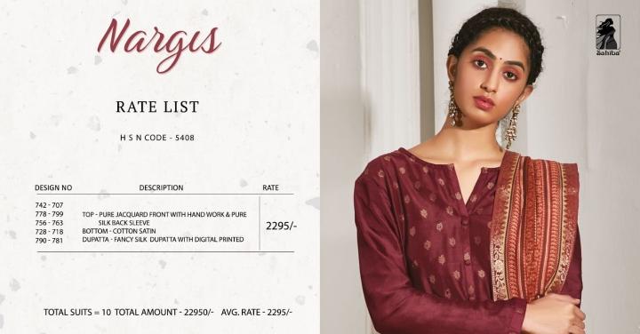 SAHIBA Presents its latest festive collection - NARGIS TOP Pure heavy jacquard front with hand work and pure silk back and sleeves BOTTOM Cotton Satin DUPATTA Pure fancy silk with digital print PRICE 2295₹ TOTAL SUITS 10 5%Gst applicable Set to set only Delivery 2 Days Limited sets only. |