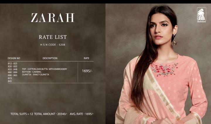 Sahiba Presents.. - Zarah TOP Pure cotton zari butta with fancy embroidery BOTTOM Pure Cambric DUPATTA Pure fancy fabric RATE 1695₹ TOTAL SUITS 12 TOTAL AMOUNT 20340₹ 5%Gst Applicable Set to set Delivery 2 Days |