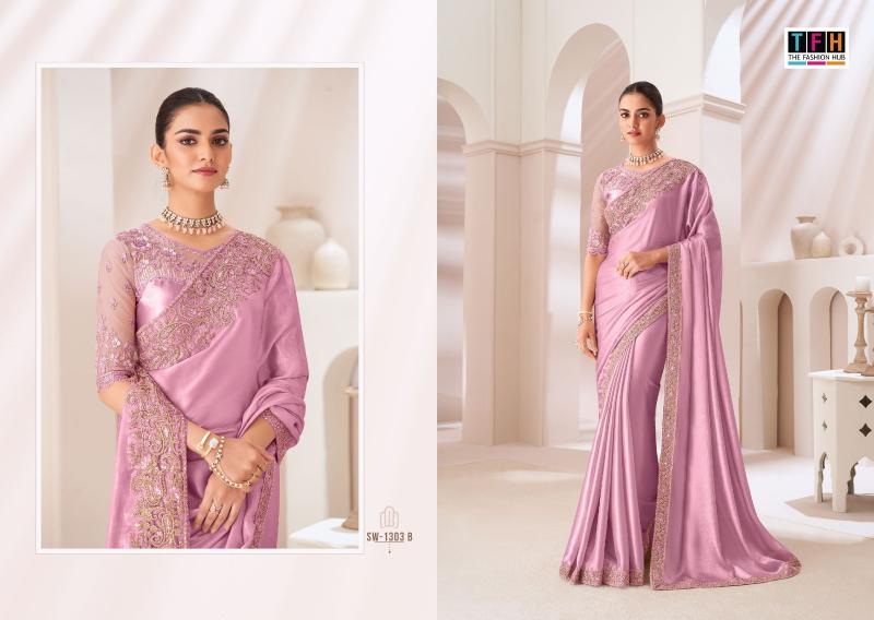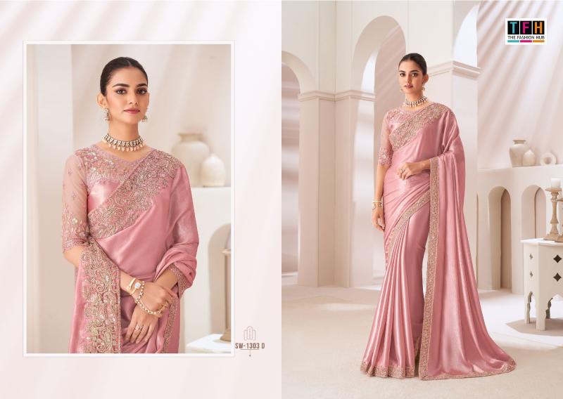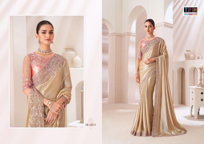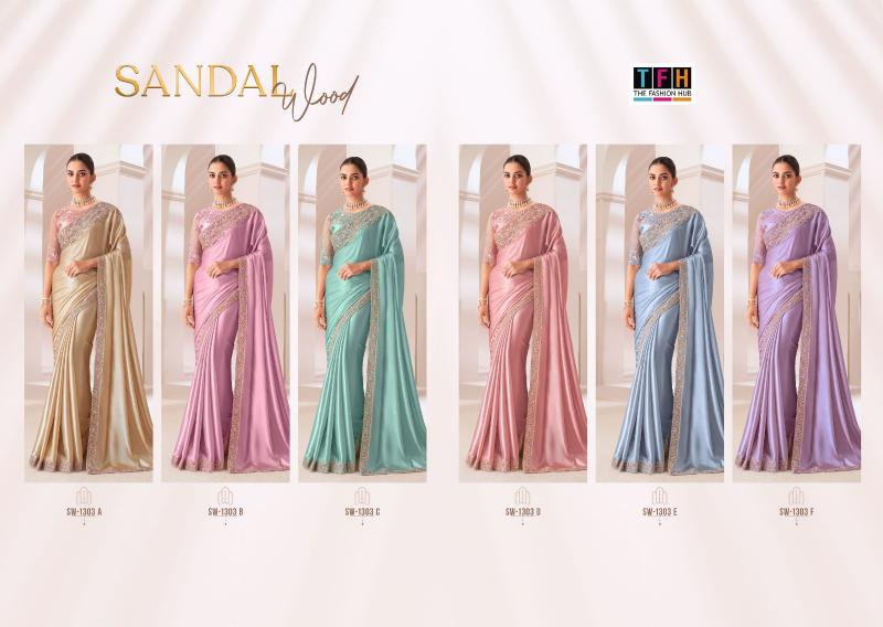 BRAND :TFH CATALOG NAME : SANDAL WOOD 1303 SERIES : 1303A TO 1303F SAREE FABRIC : SARTIN CHIFFON SAREE WITH WORK BLOUSE : SARTIN SILK BLOUSE PRICE LIST: 1994/- +5%GST OCCASION : PARTY WEAR |