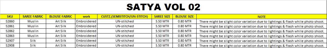 OUR NEW FESTIVE WEAR SAREE COLLECTION ♻️ BRAND NAME : MOHVOGUE CATALOG NAME : SATYA VOL 02 PRICE : * FABRIC : ATTACHED BLOUSE TYPE : UN-STITCHED WORK : Embroidered |