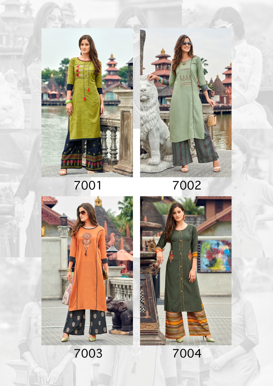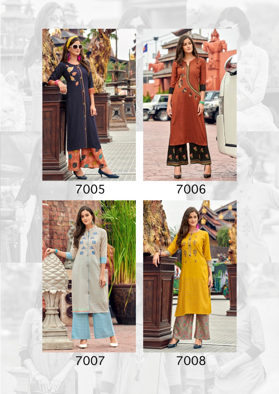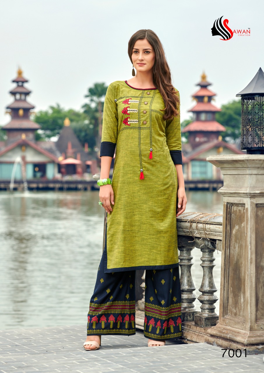 SAWAN CREATION Kurti with PLAZZO premium collection Catalogue name - DANI VOL-7 Details ⬠Fabric :- Top :- Heavy Rayon 14 Kg, ORGANIC LINEN, Heavy Milange with Embroidery work. Plazzo :- Heavy Rayon with embroidery work & Rayon Strips & Chex PLAZZO â Design :- 8⣠Size :- M-38 L-40 XL-42 XXL-44 3XL-46 Length :- 44 to 45. 665+Gst+Shipping Dispatch Date:-25th February |