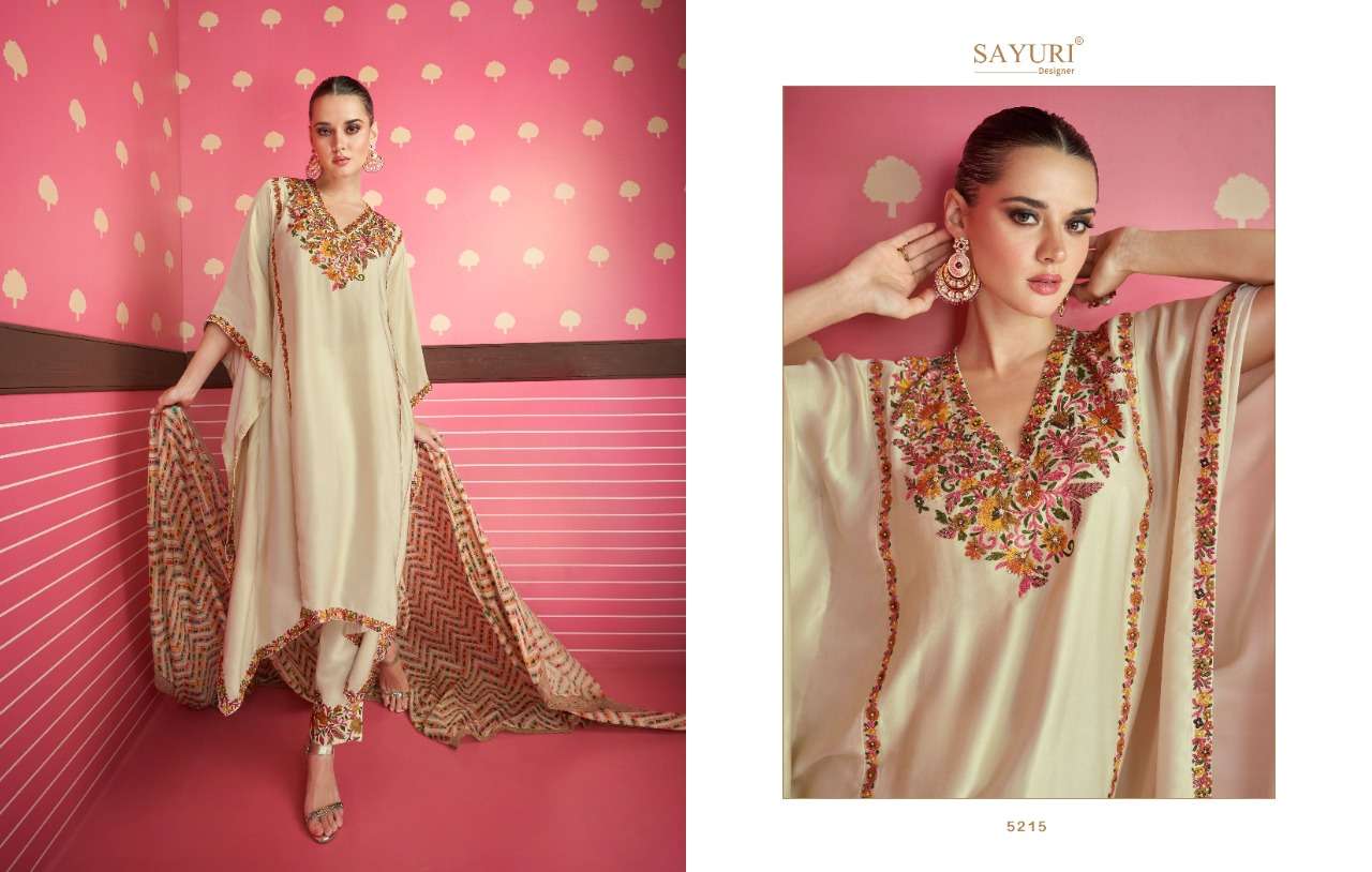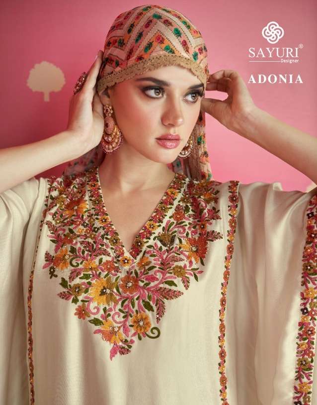 SAYURI DESIGNER ADONIA(4 PCS) - Cream Silk Satin Kaftan with Pant Stitched and Chinon Printed Duptta. SIZES - L XL XXL PRICE -2199 per pcs |